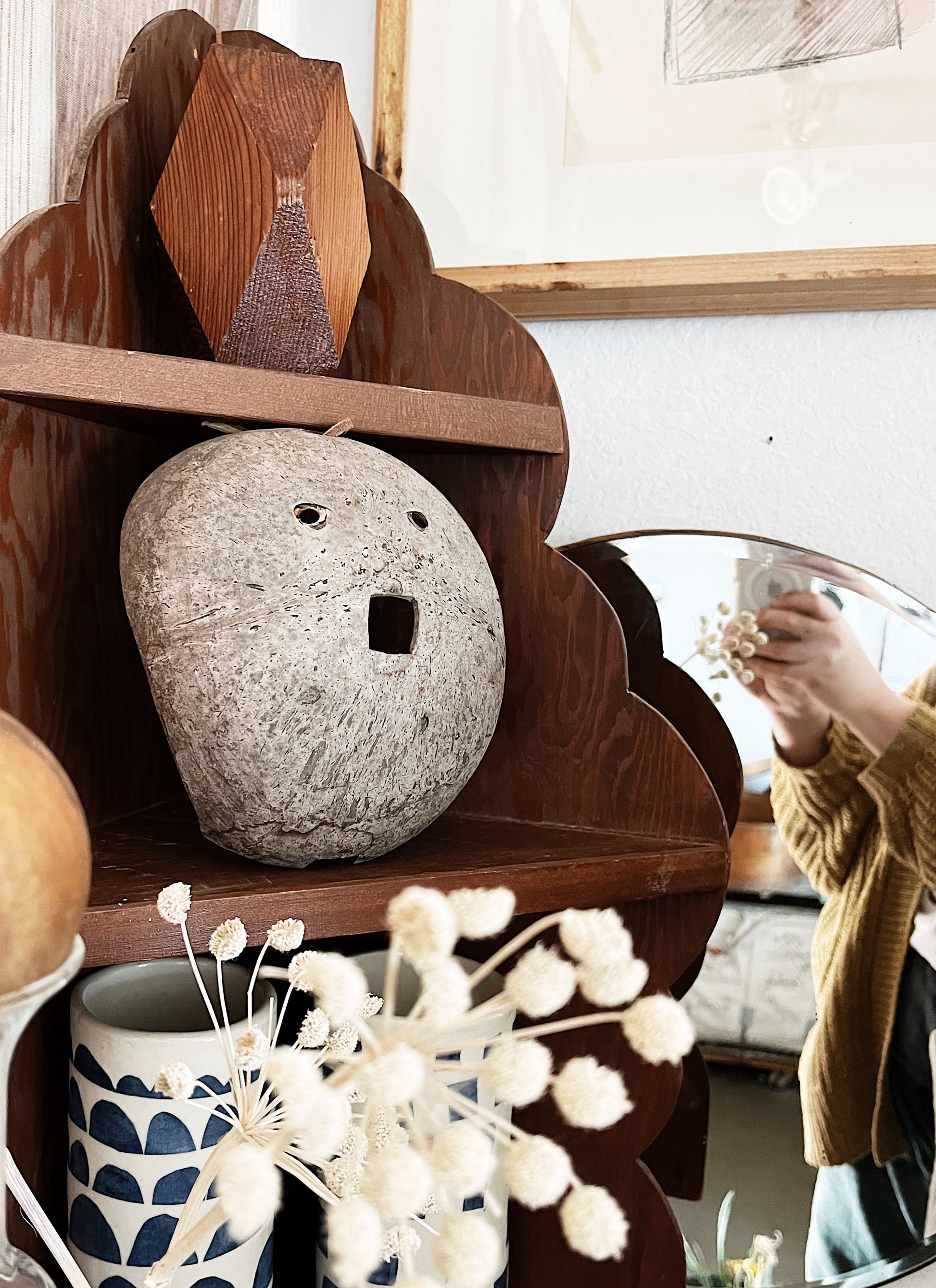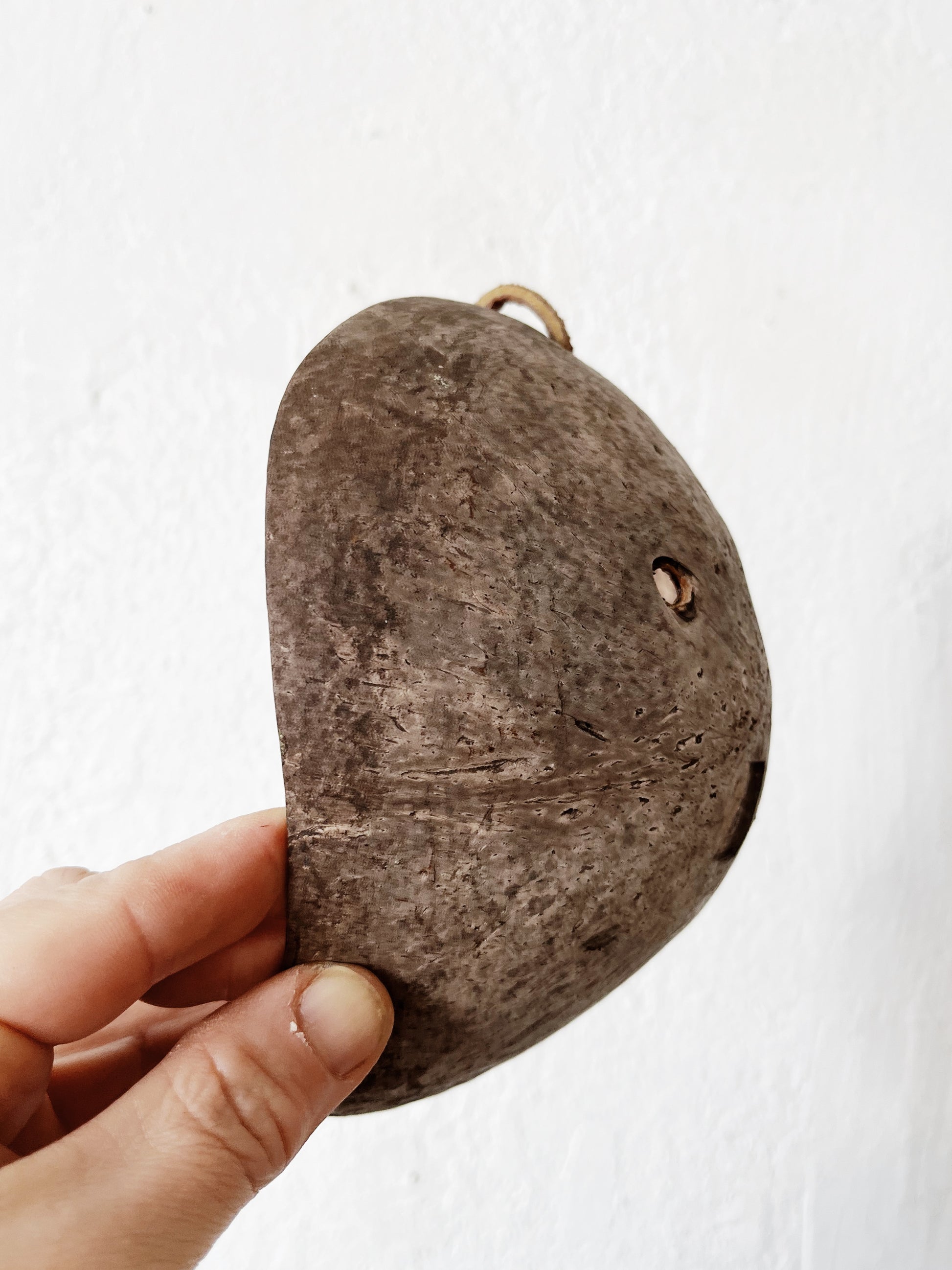 A small mask fashioned from a coconut. Great little piece of folk art. Leather hanger