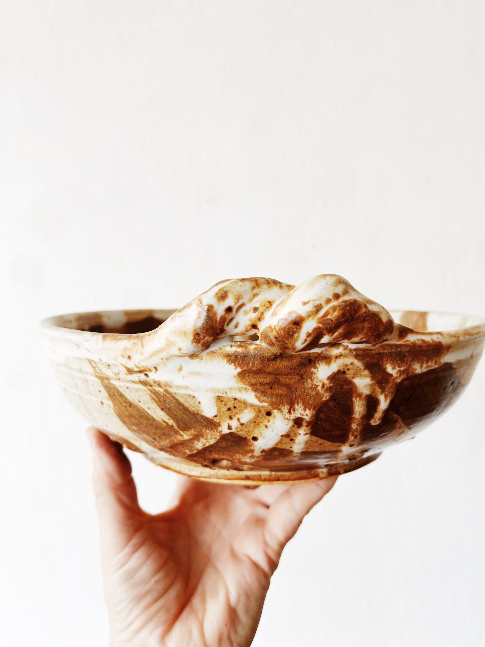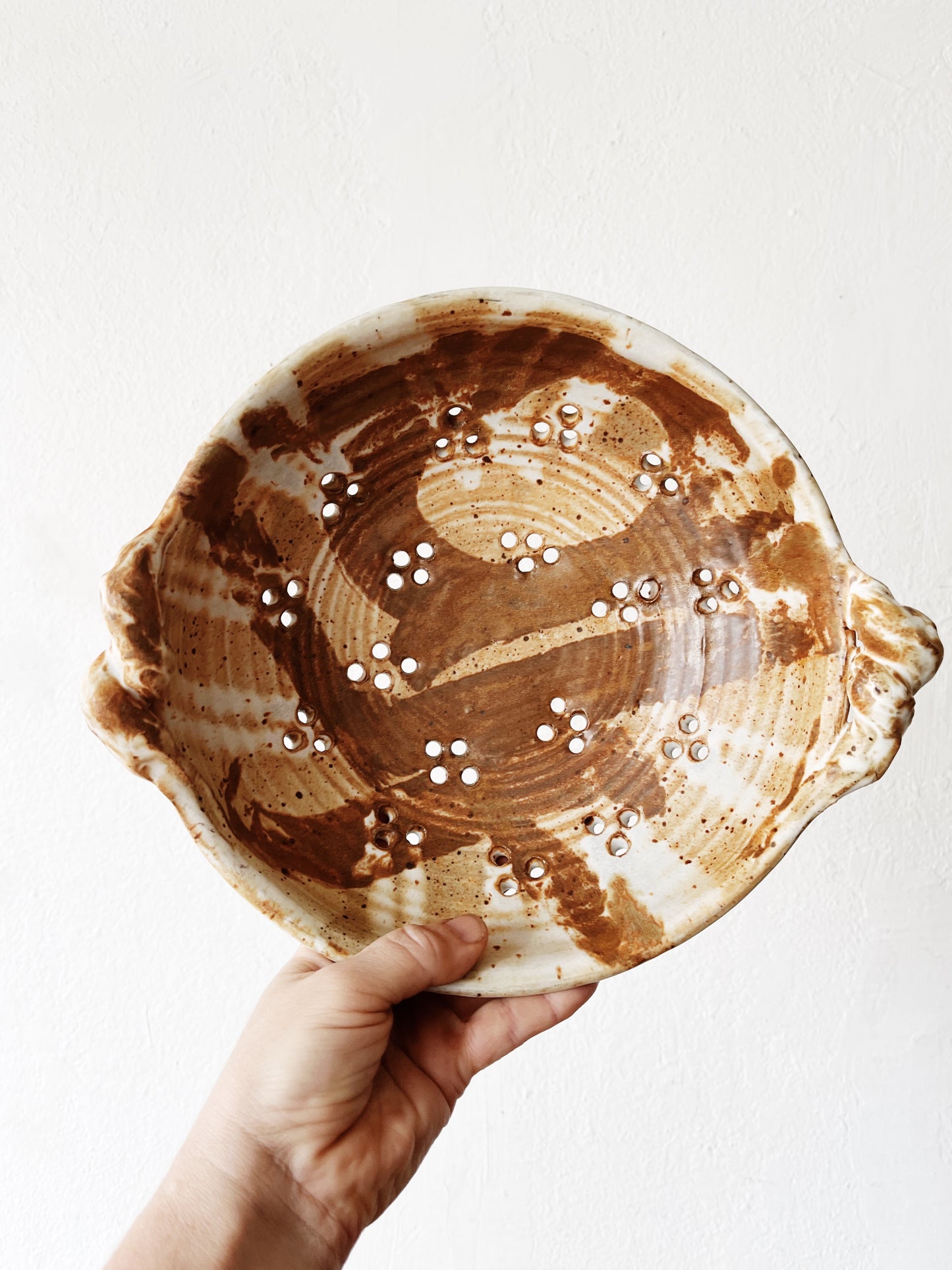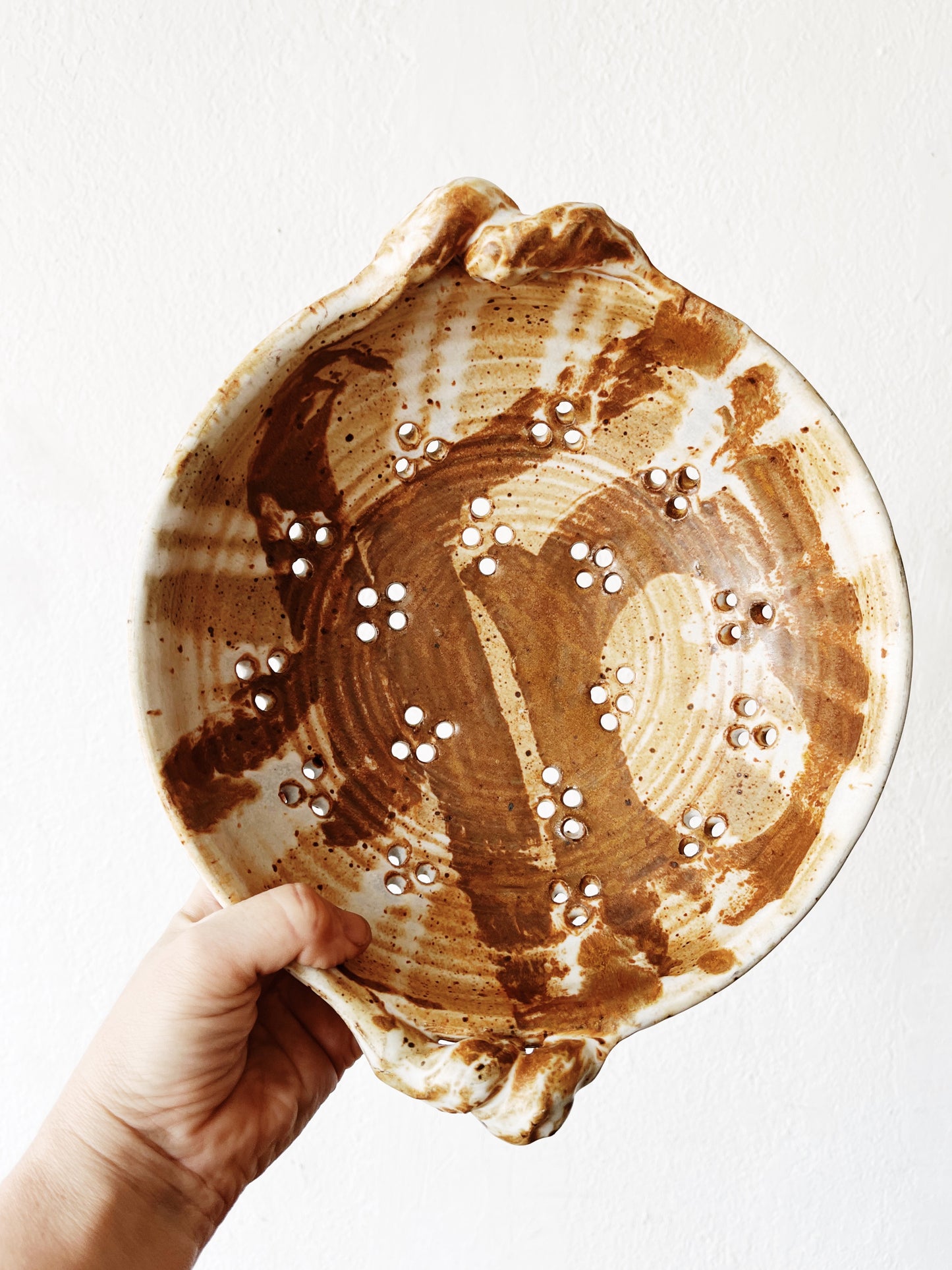 Wonderful ceramic berry bowl in heavy stoneware. Pretty glaze. Use for rinsing and then storing or serving fruit. The loveliest colander for cooking. Larger in size