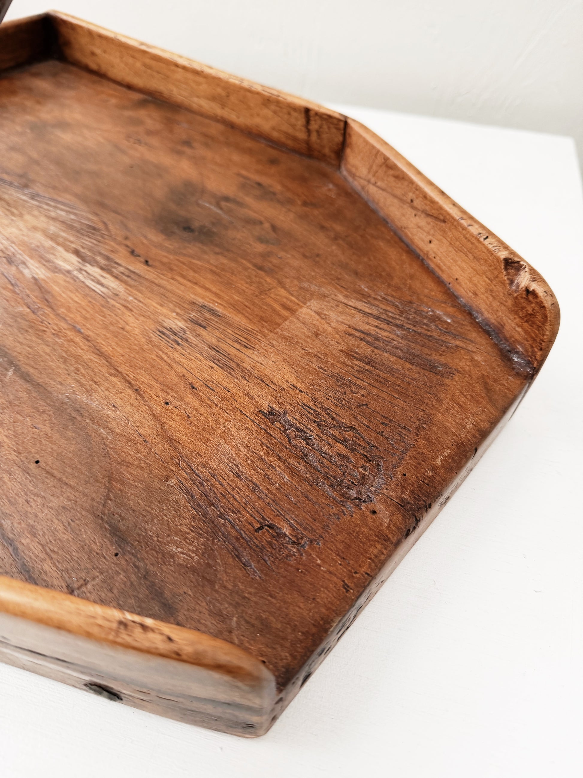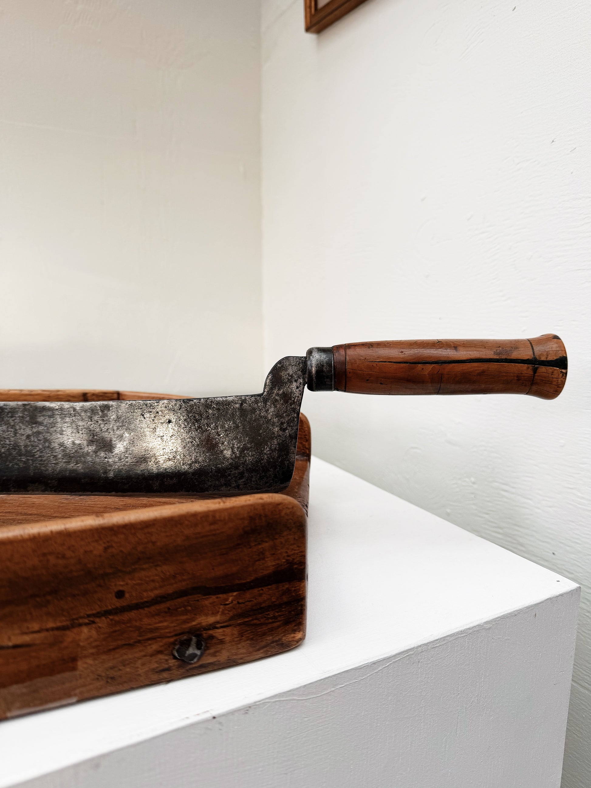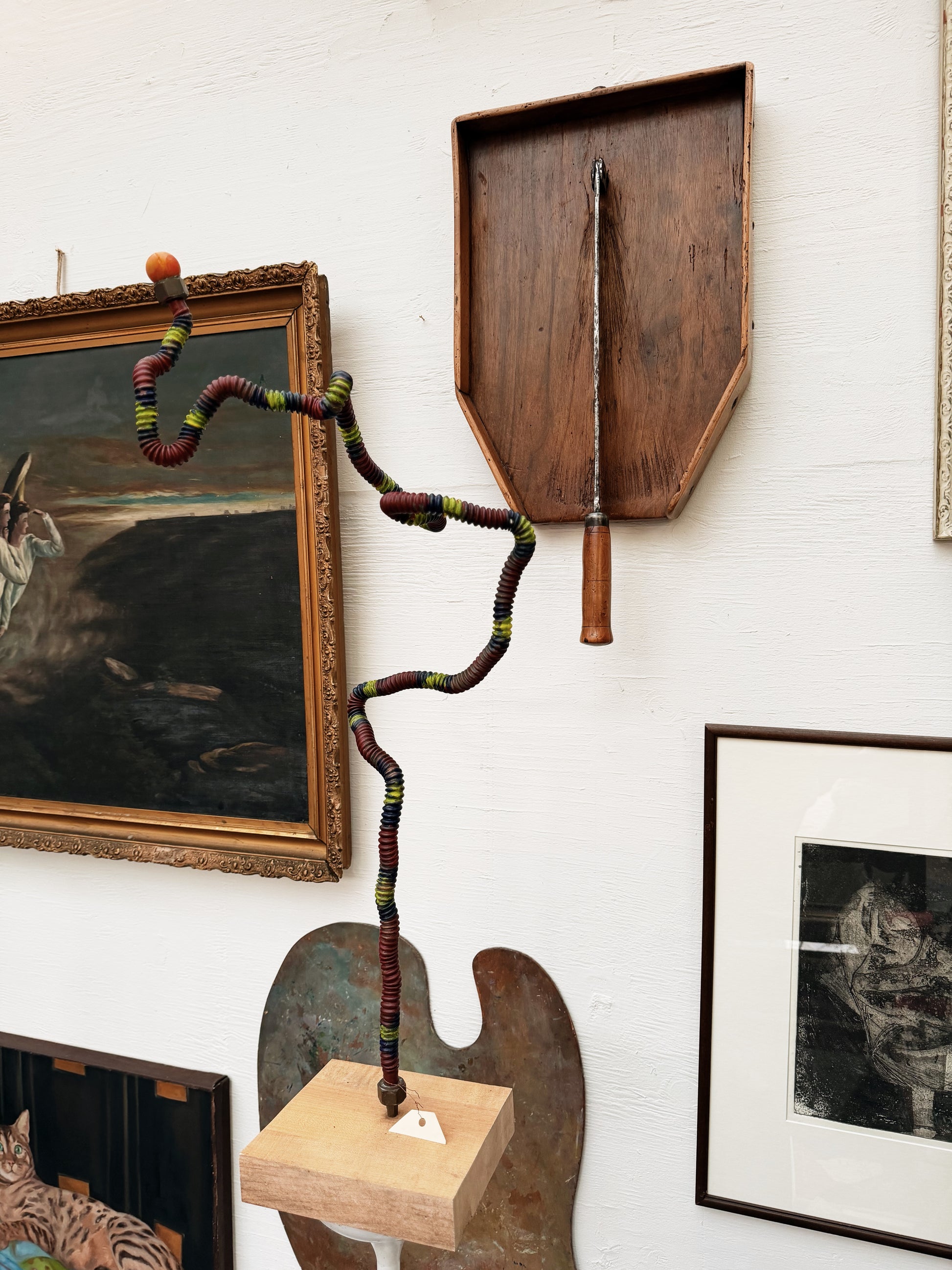A unique piece of primitive art that we feel looks just perfect mixed in with more traditional work. Old and beautiful. Iron and wood. Has a round hook on top for hanging.