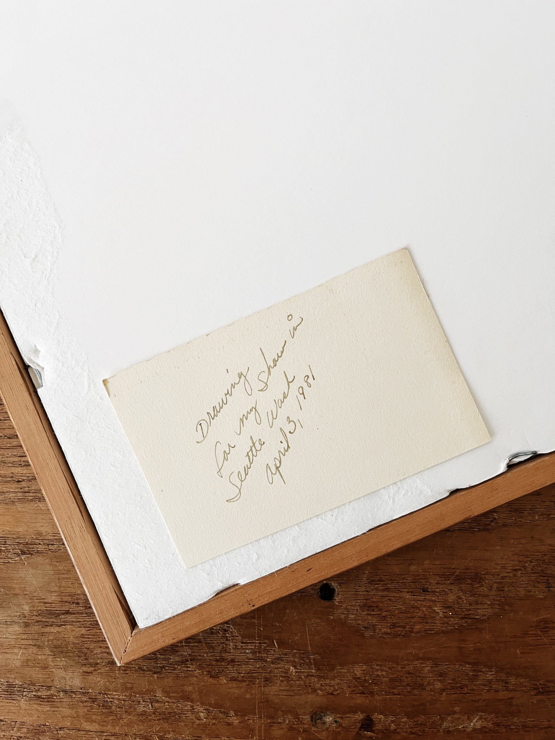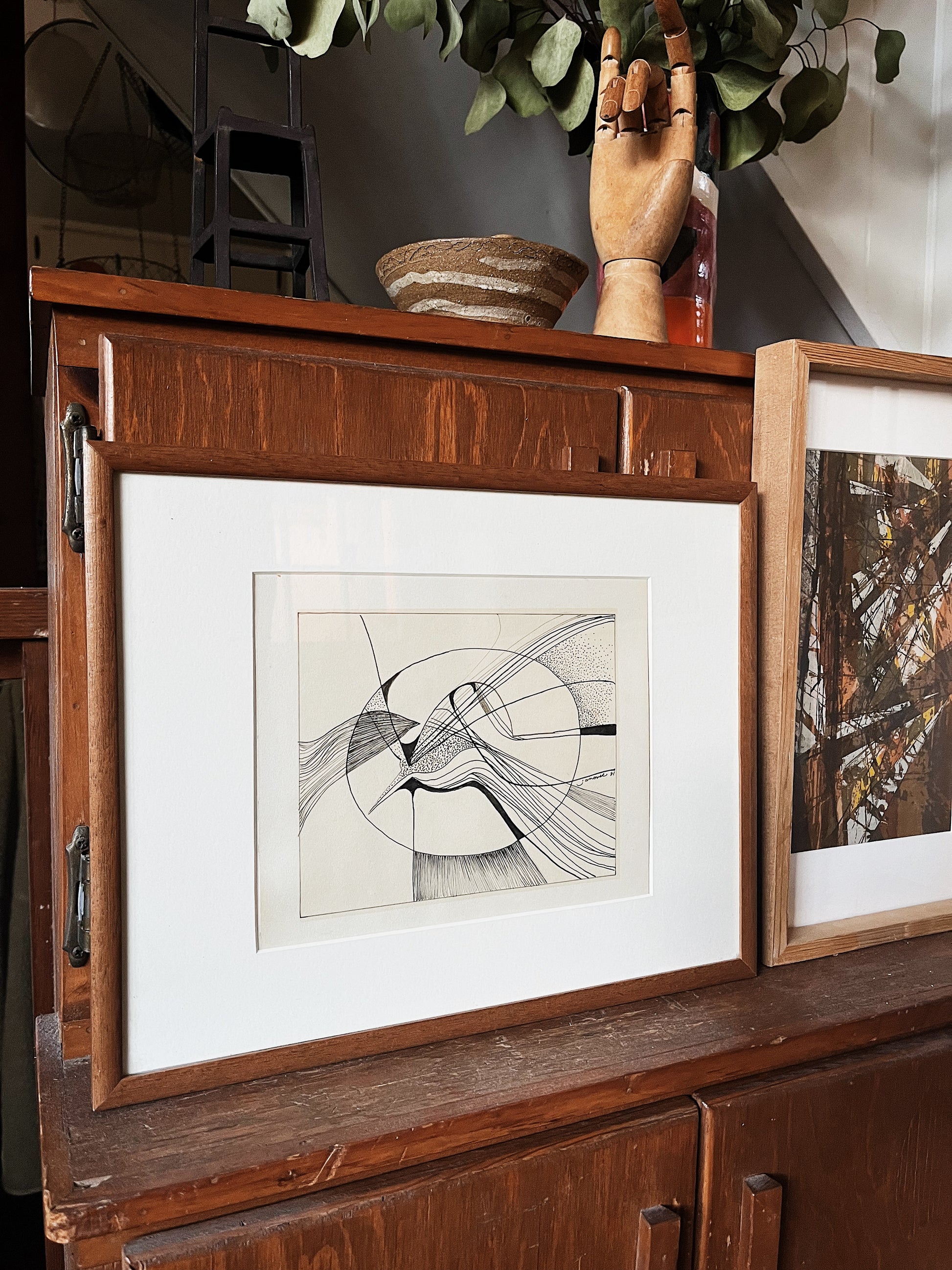 This piece is a pen and ink abstract drawing from 1981. Spare in its composition but with lots of movement. Framed in vintage wood under glass. A simple minimalist piece.