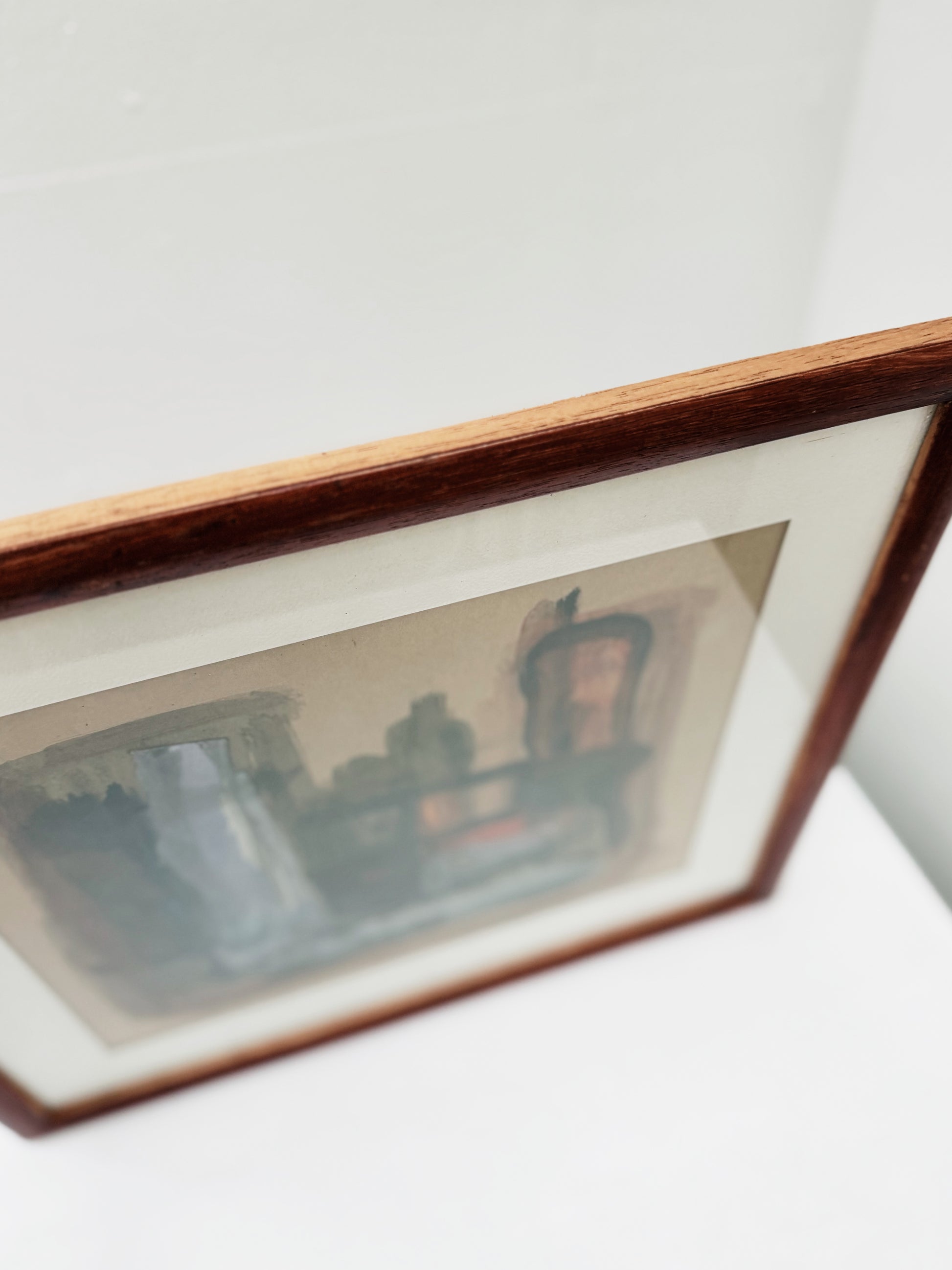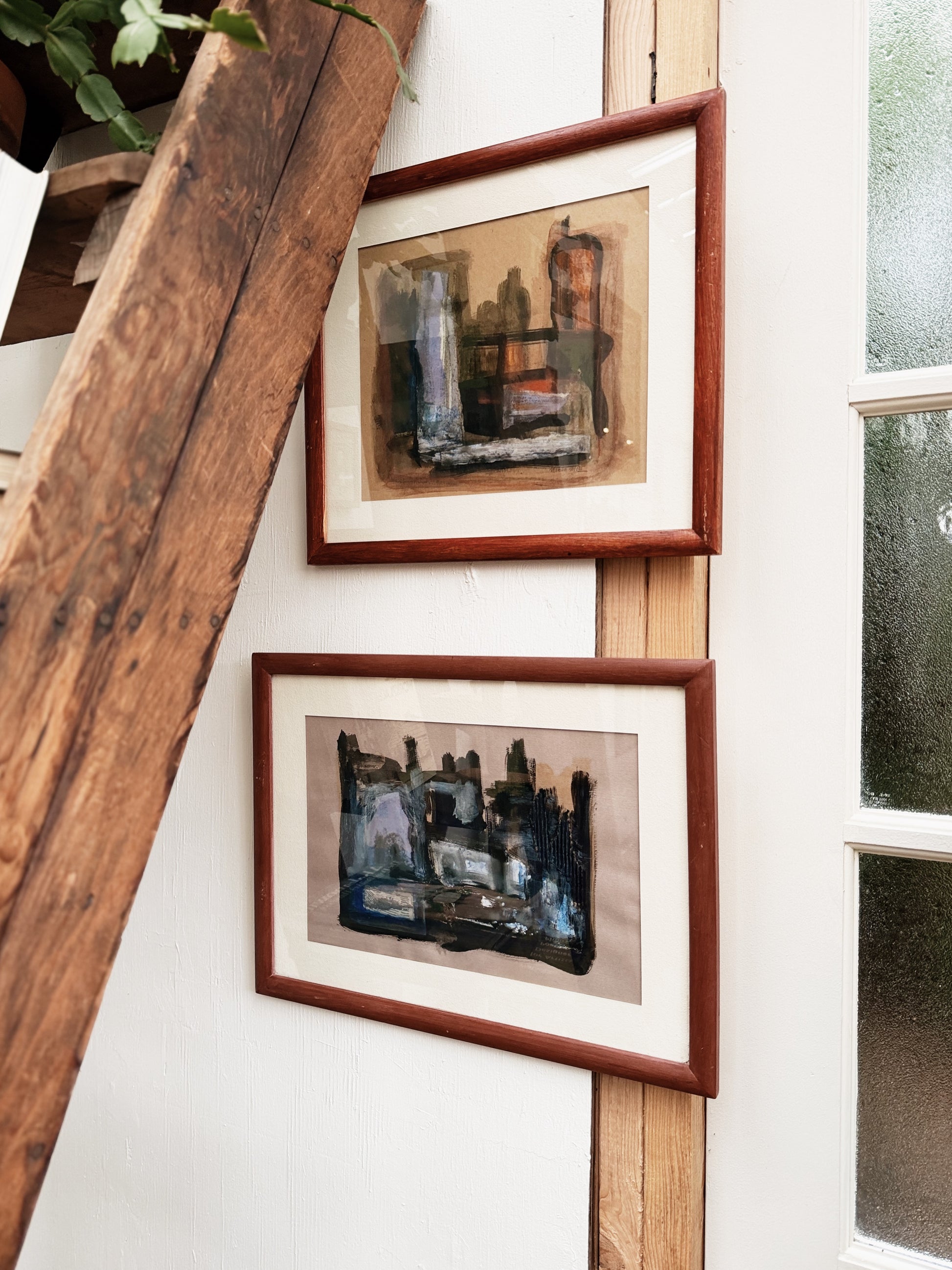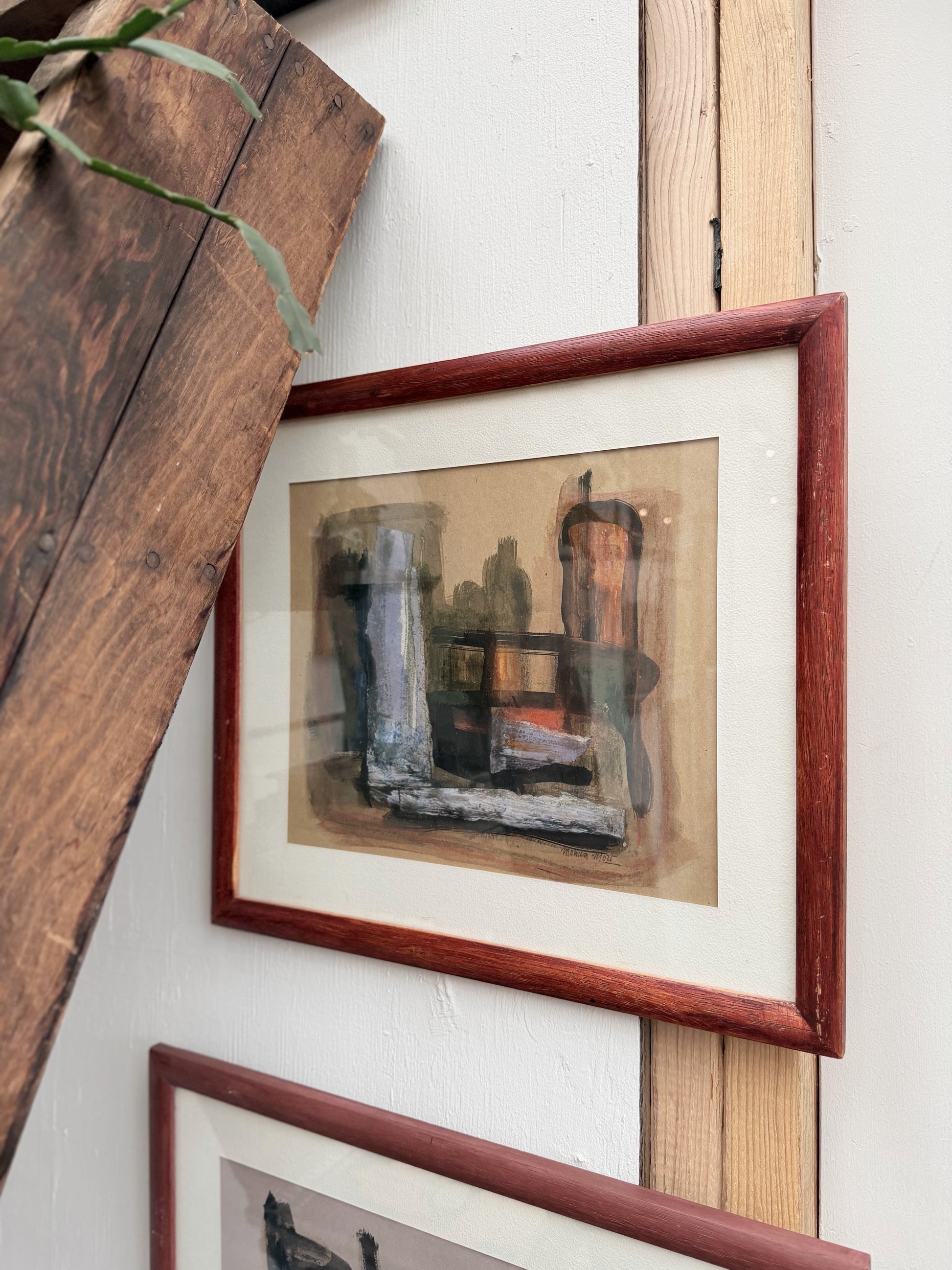 A pair of abstract landscapes...cityscapes they look to be. Mixed medium of acrylic and water color with cardboard and paper. The appearance has a 3D effect in some areas of the work. Each is presented under glass in a wood frame. One piece signed Monica Moze and we assume the artist of the other. Argentinian origins