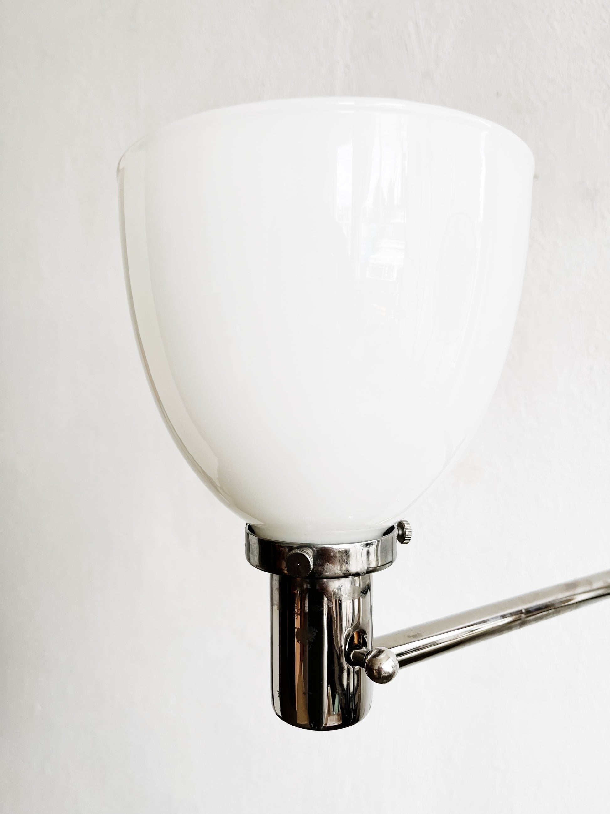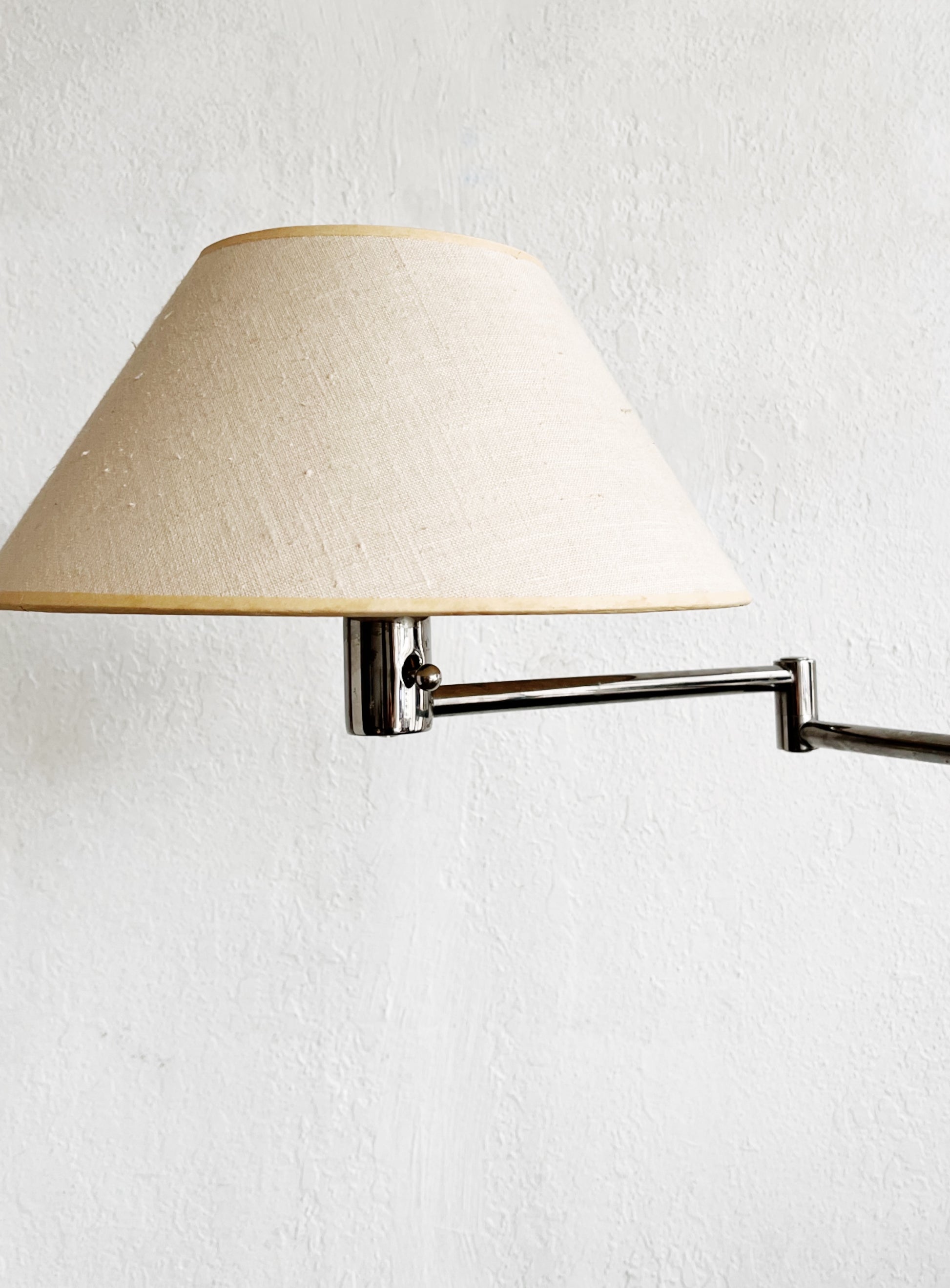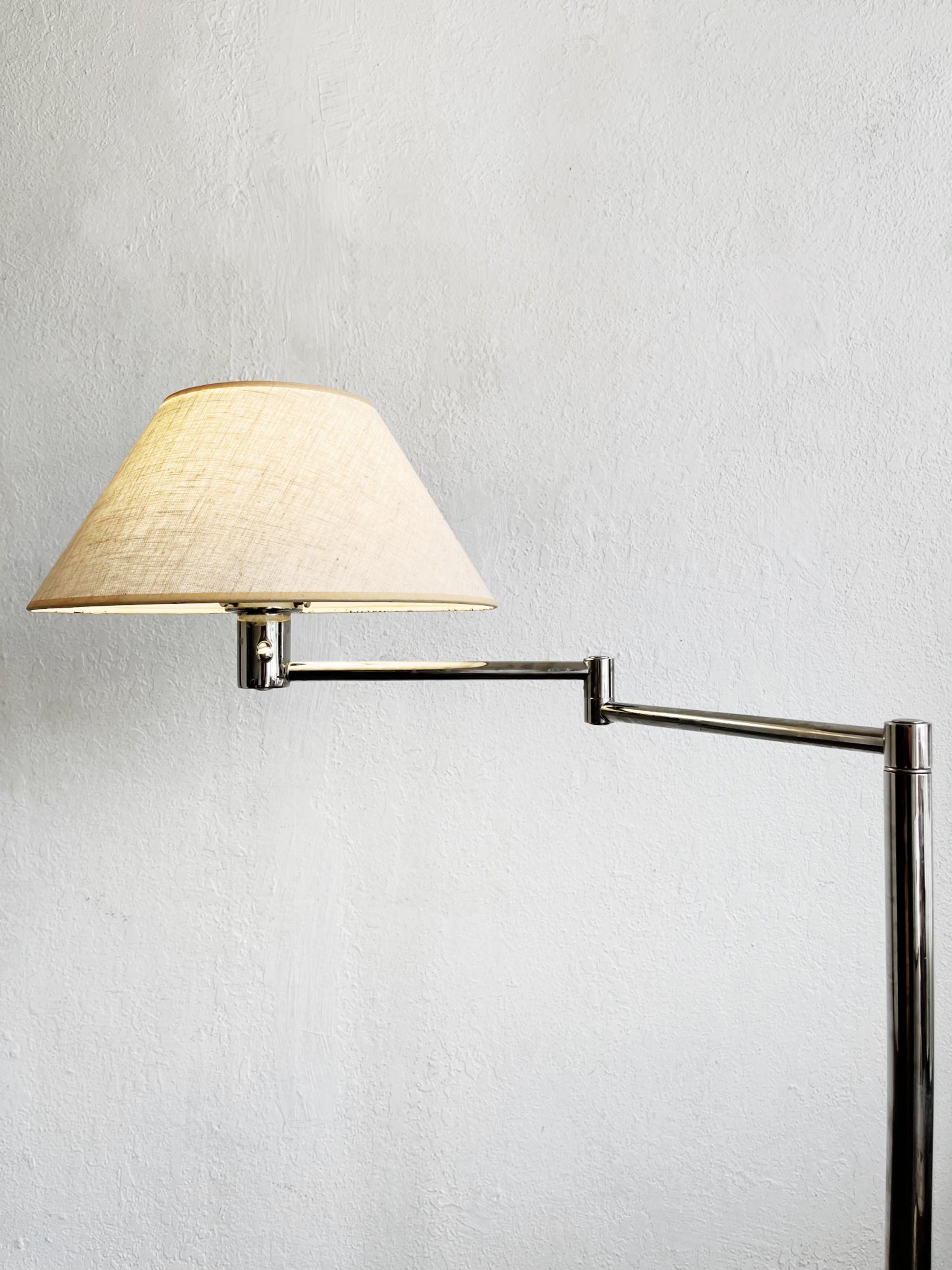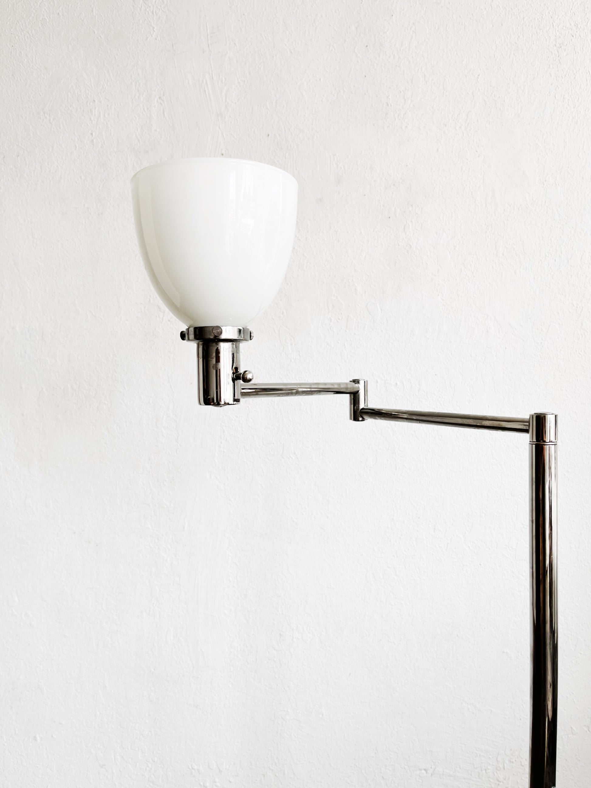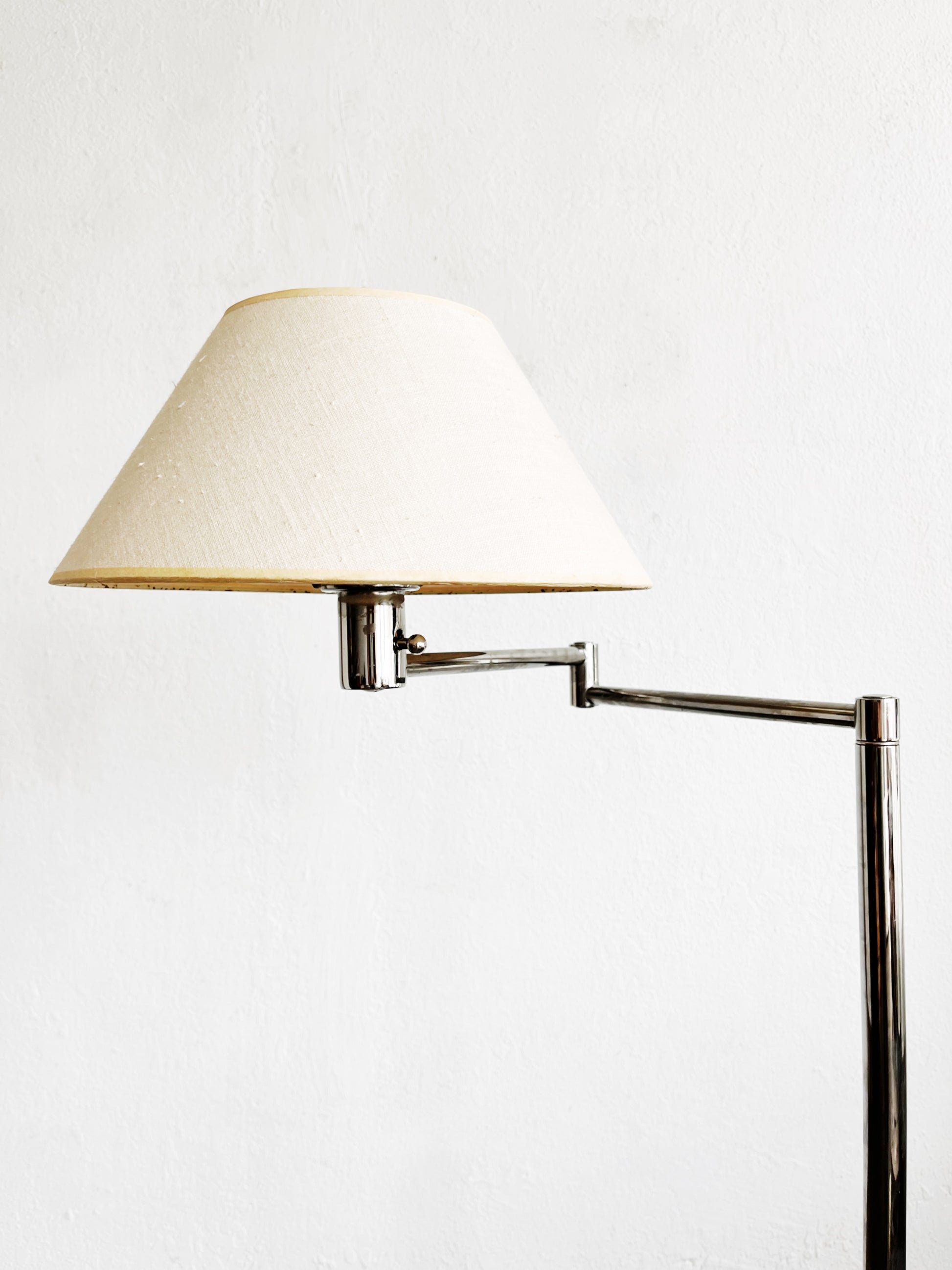 A rare find! 1970s chrome floor lamp by Walter Von Nessen. Weighted solid chrome base with extending arm. It raises and lowers too. Built in dimmer switch. Comes with a milk glass shade as diffuser and a vanilla linen top shade, use either way. In wonderful condition with only minor surface wear. Hard to find piece.