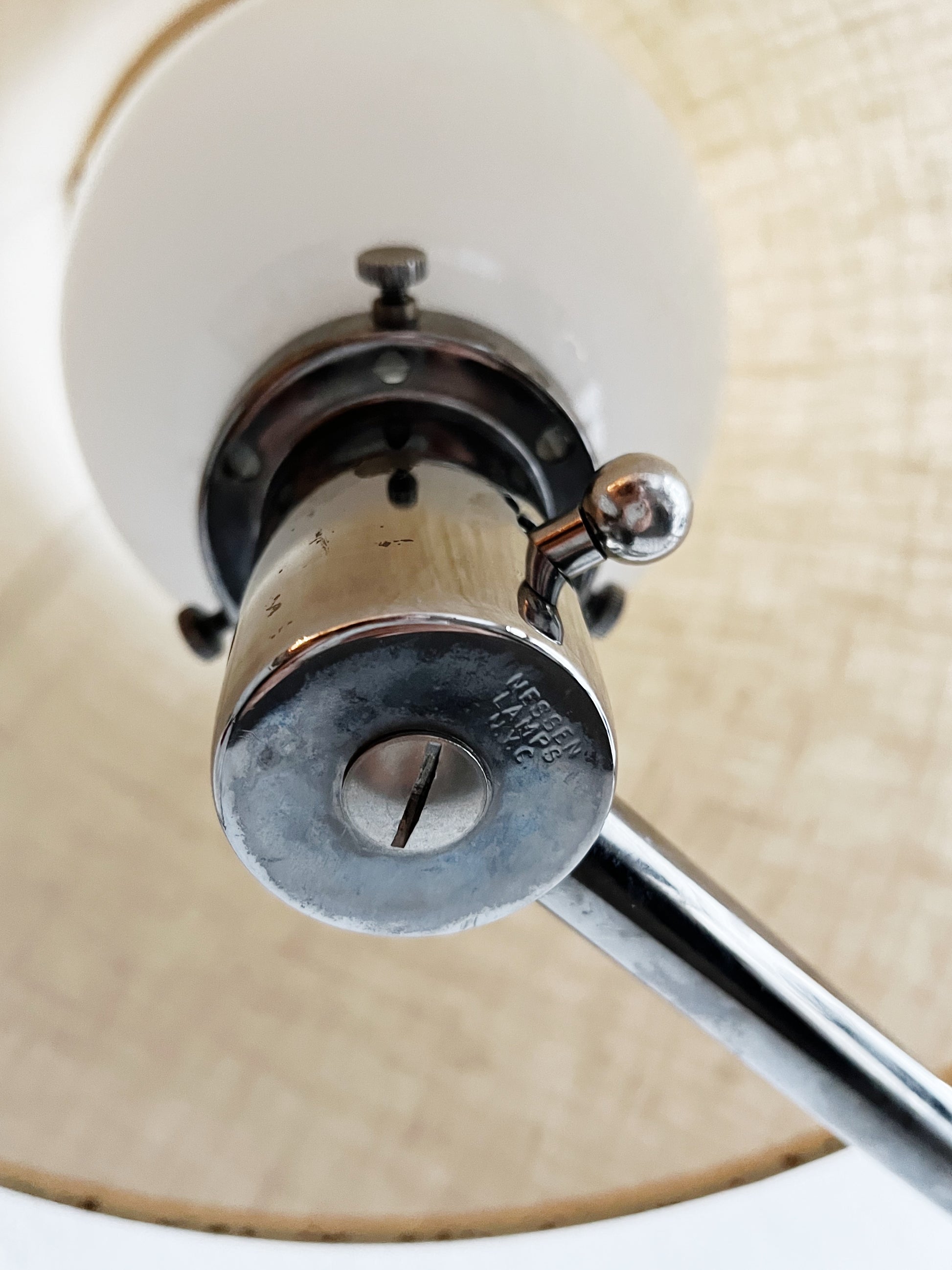 “After training in Germany, Von Nessen came to the United States and established Nessen Studios in New York in 1927. He quickly earned a following among well-established modern architects, who commissioned him to design lighting and other household objects for their clients. He became one of the only major designers between the wars to concentrate on innovative lighting, and his popular table and floor lamps ended up in schools, hospitals, offices, and homes. Von Nessen was particularly influential in developing adjustable and indirect lighting, and he favored nontraditional materials like spun aluminum, Bakelite, and fiberglass, as well as chrome plating, which was only refined in the mid–1920s“