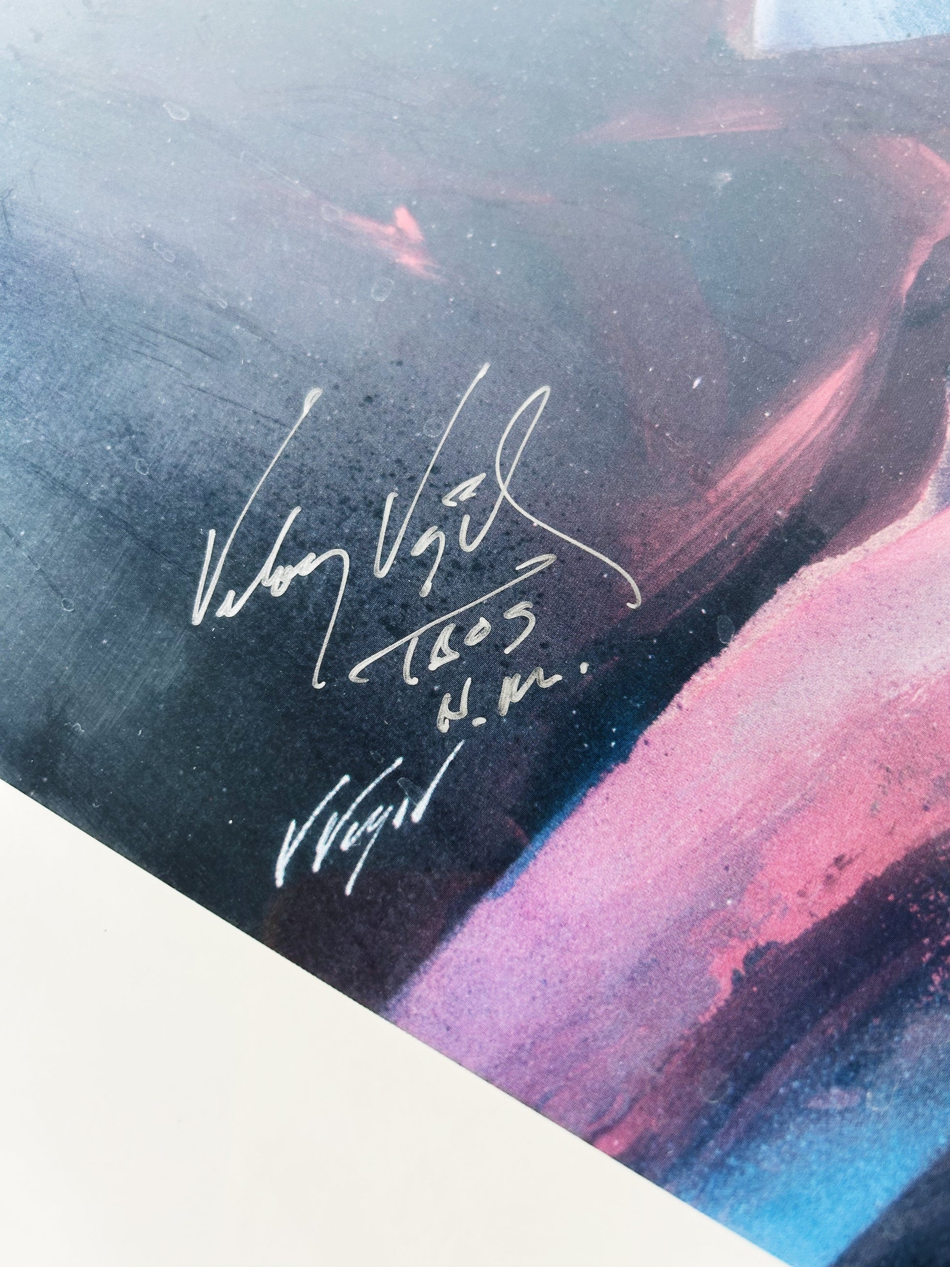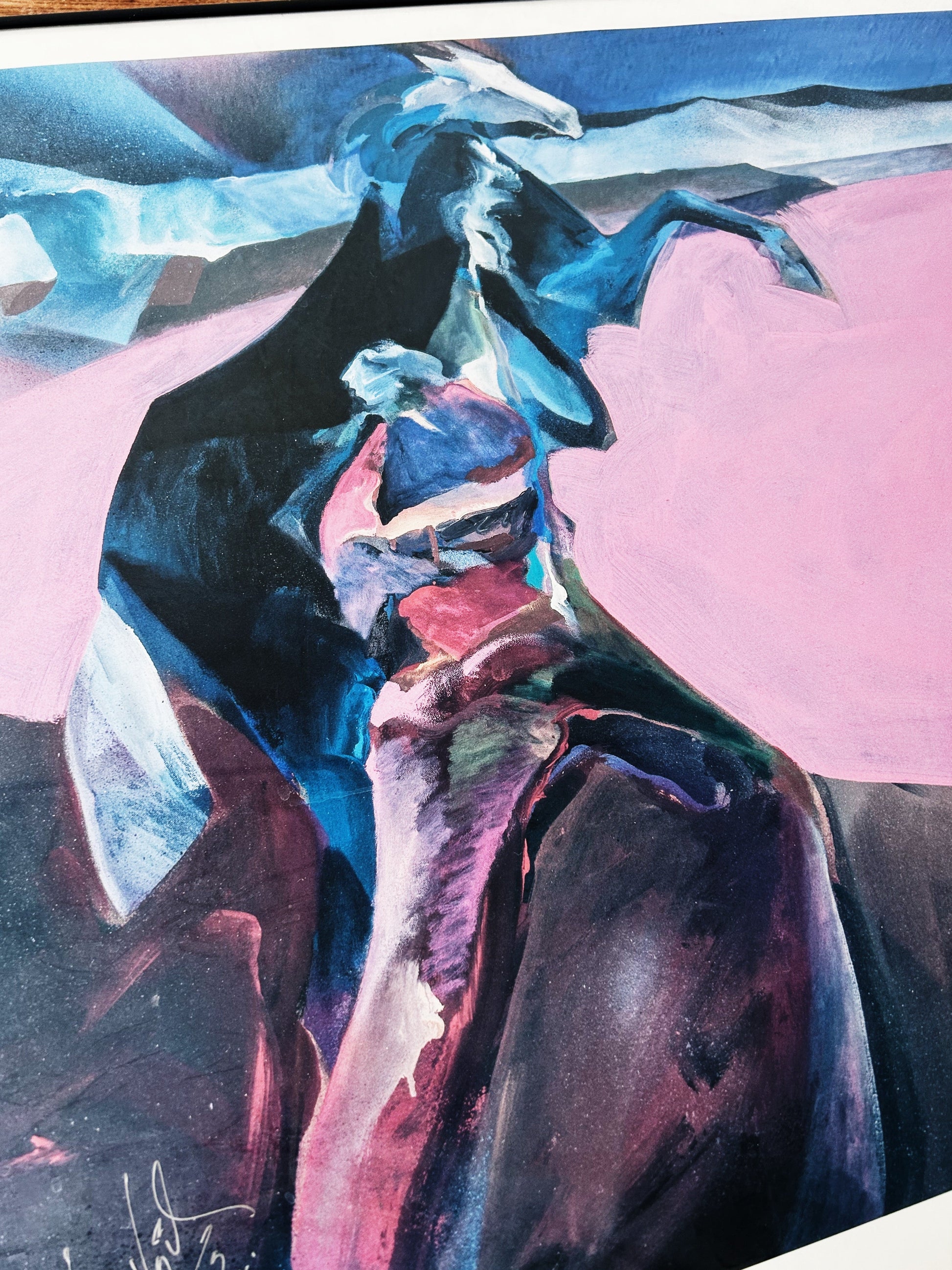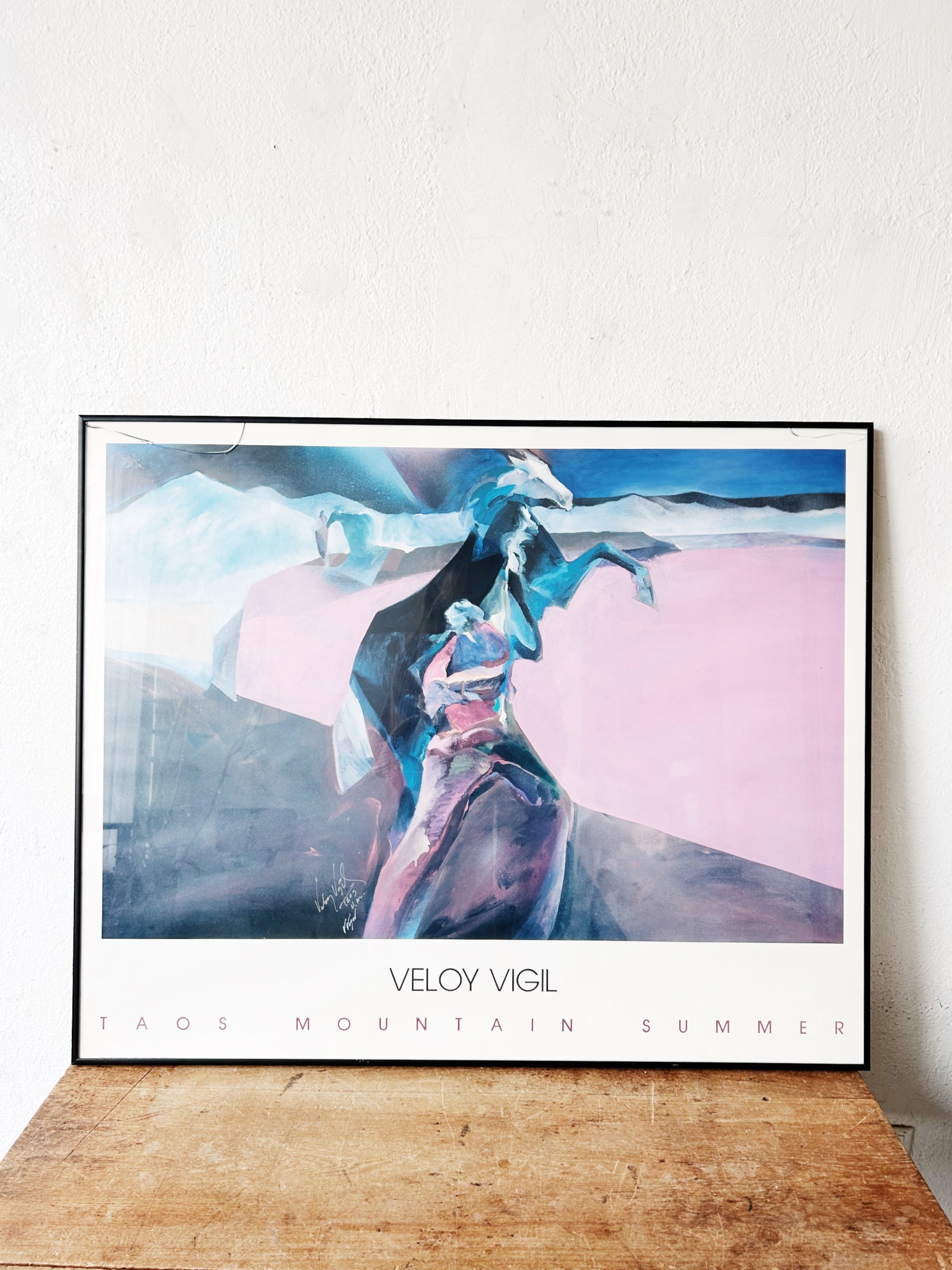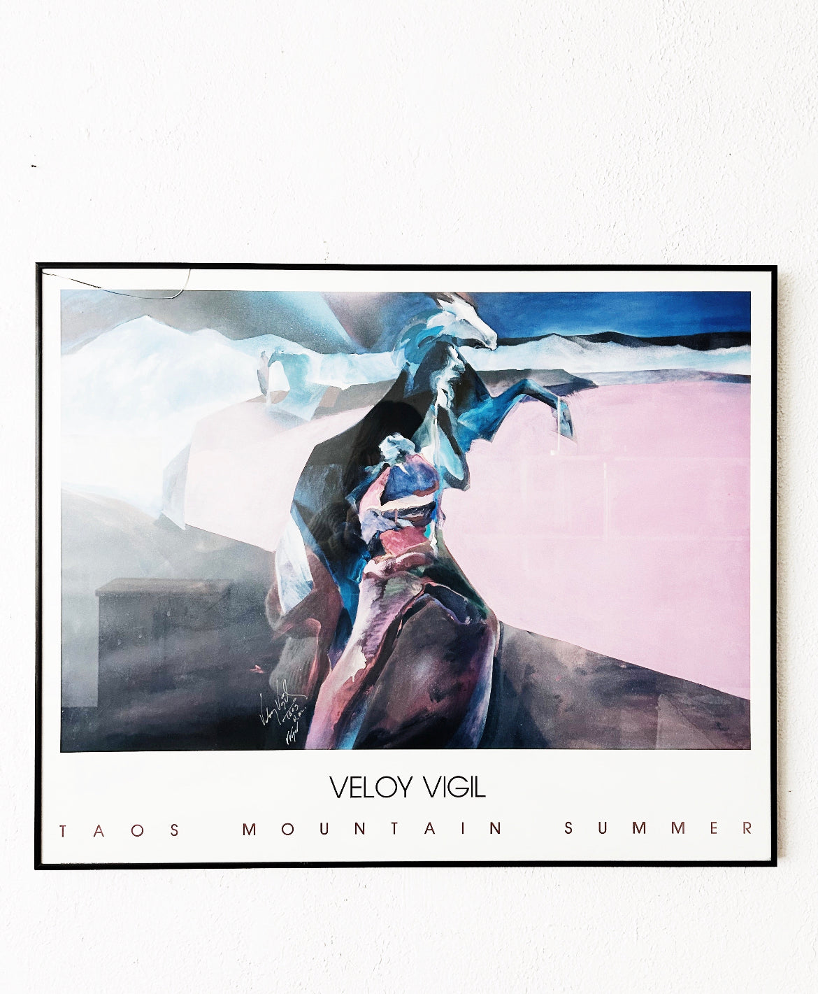 Vintage, 1991 Taos Mountain Summer framed gallery poster By Veloy Vigil, hand signed. From the Joan Cawley Gallery. Framed in a vintage black metal gaa as Lowry frame.