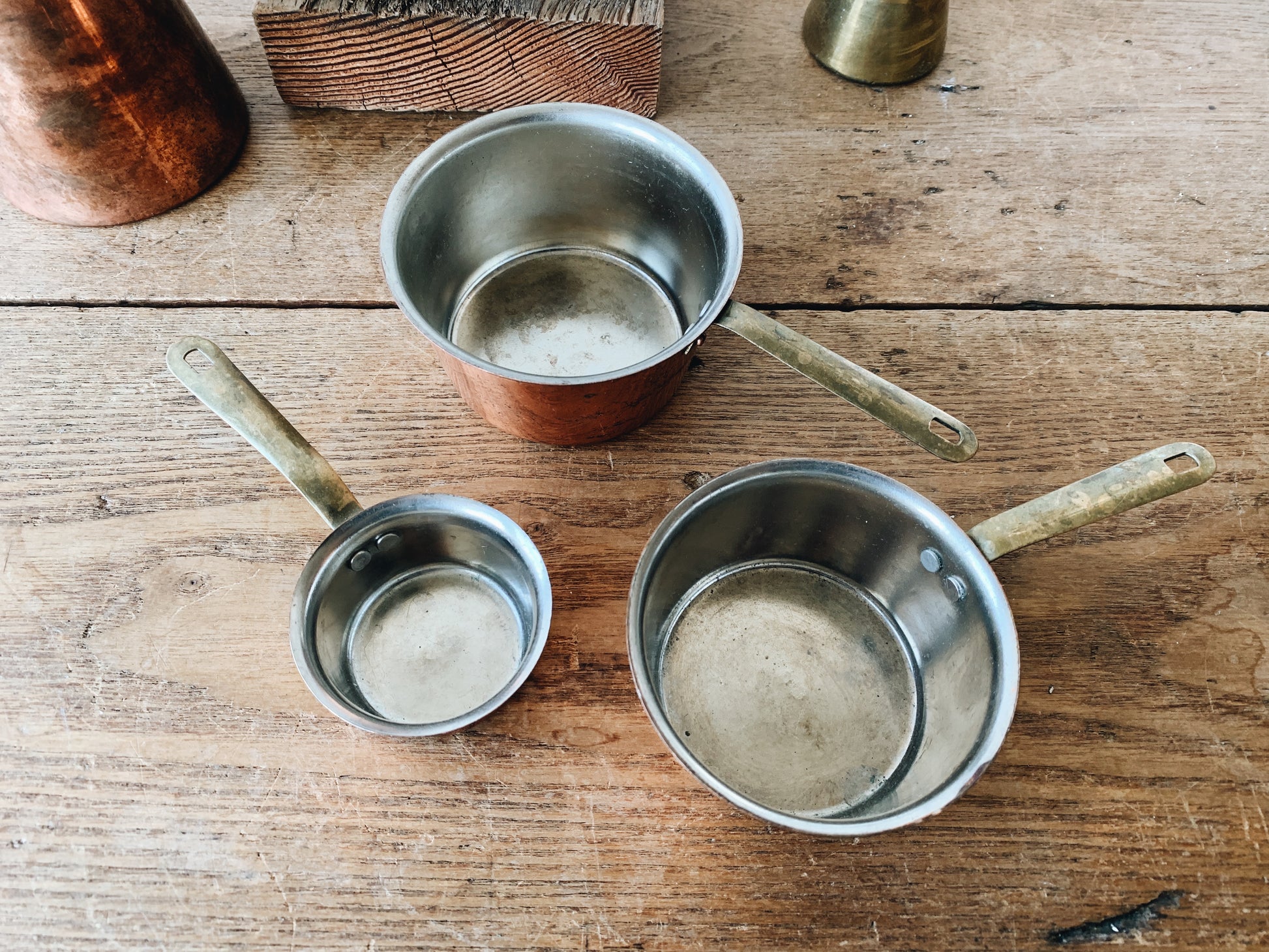 Two Turkish pourers, one brass, one copper with etched handle. 2x2” & 4x4”, 3 measuring cups and one shaker 5x4”. All with great patina and totally usable.