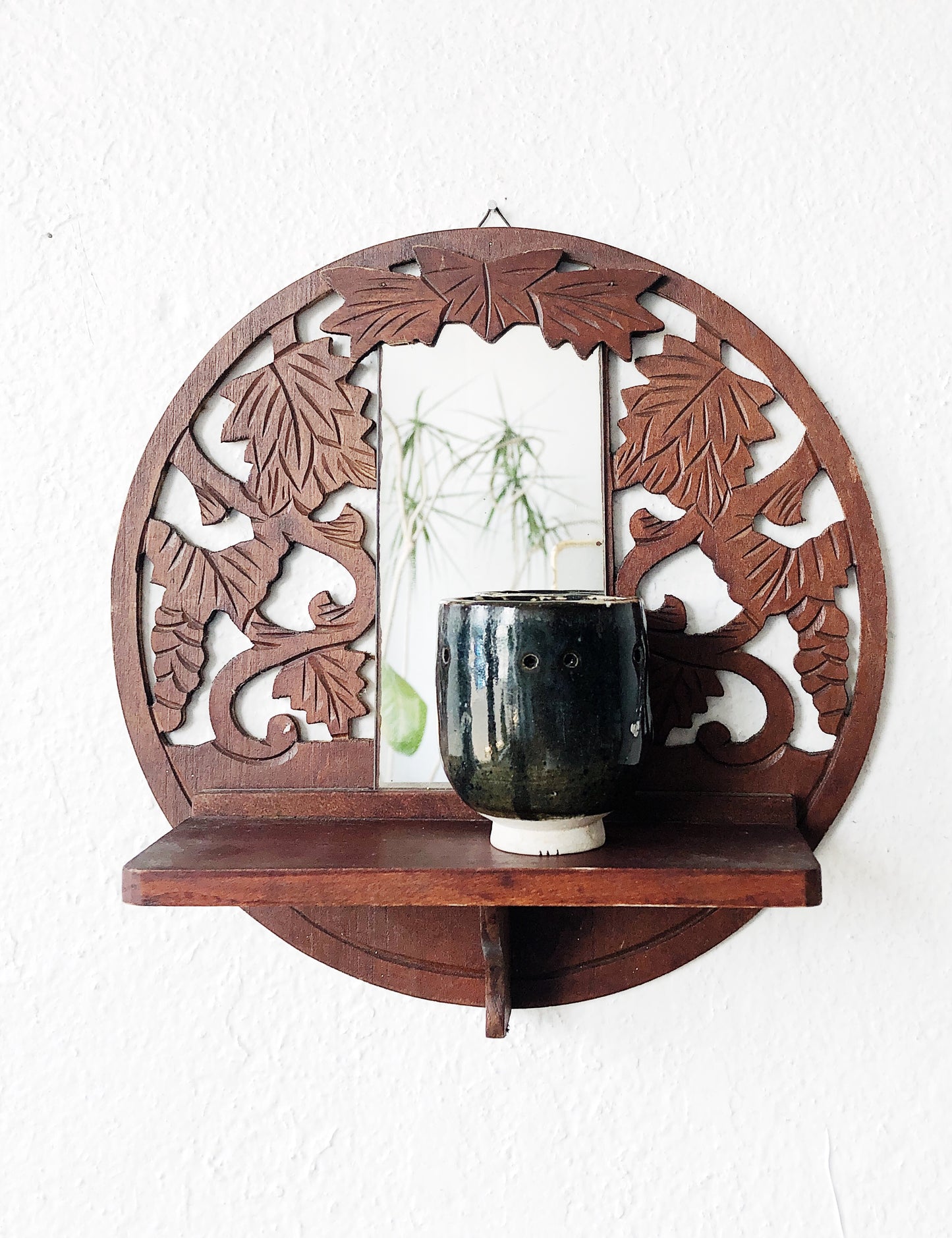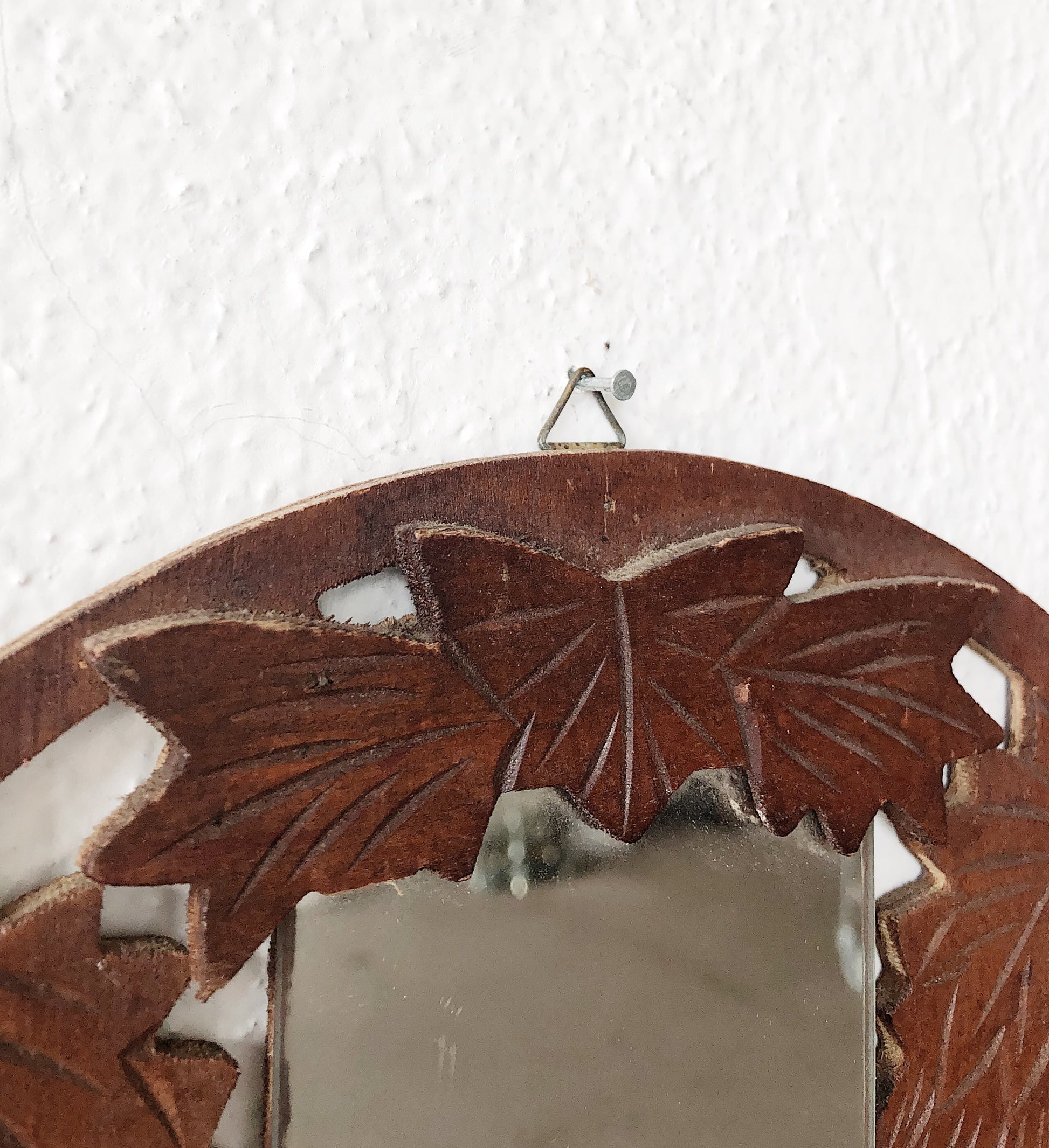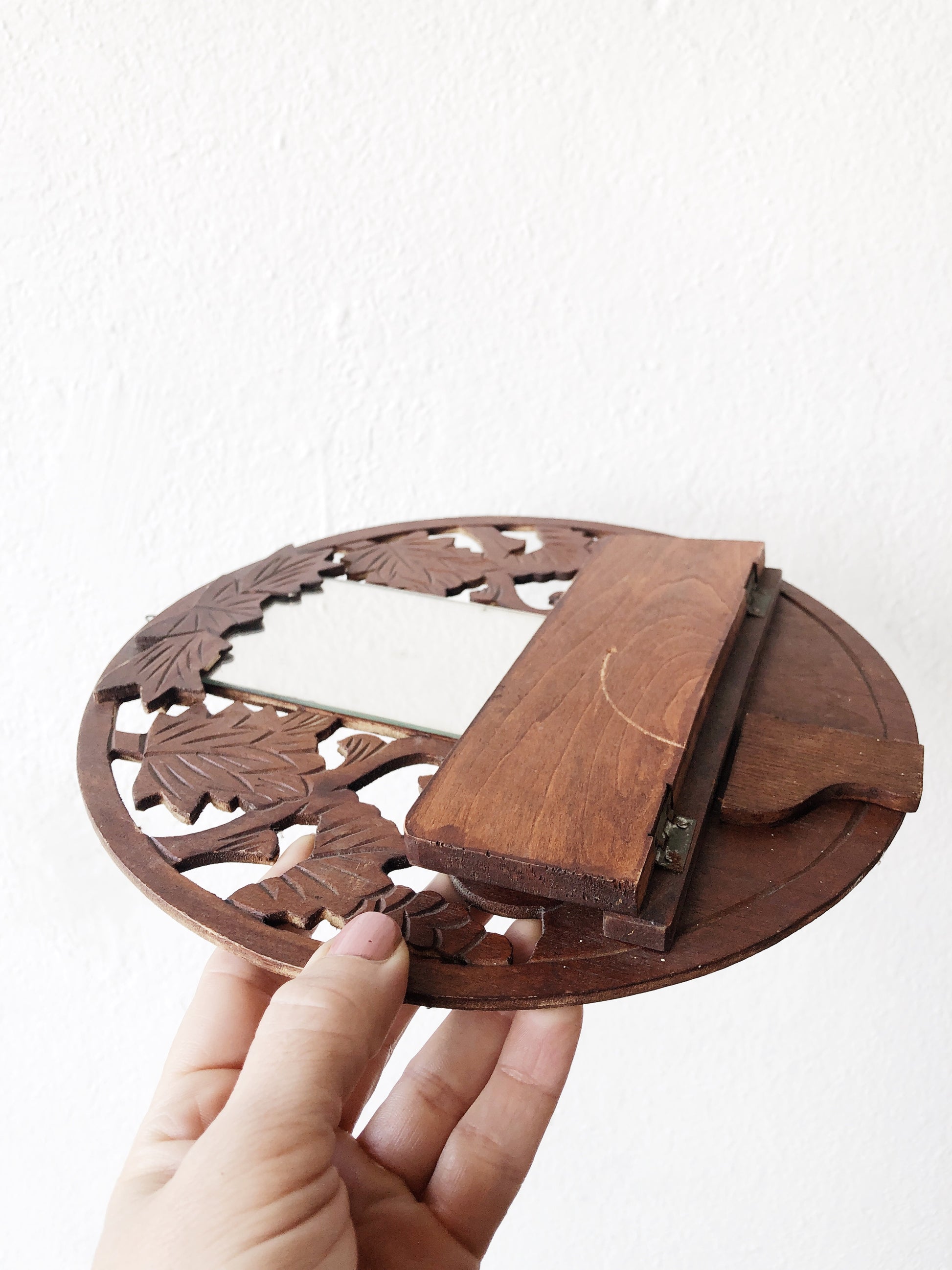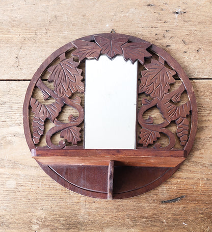 A real oldie! Openwork wooden antique Victorian Mirror. Little shelf that folds down. Old brass delicate hardware