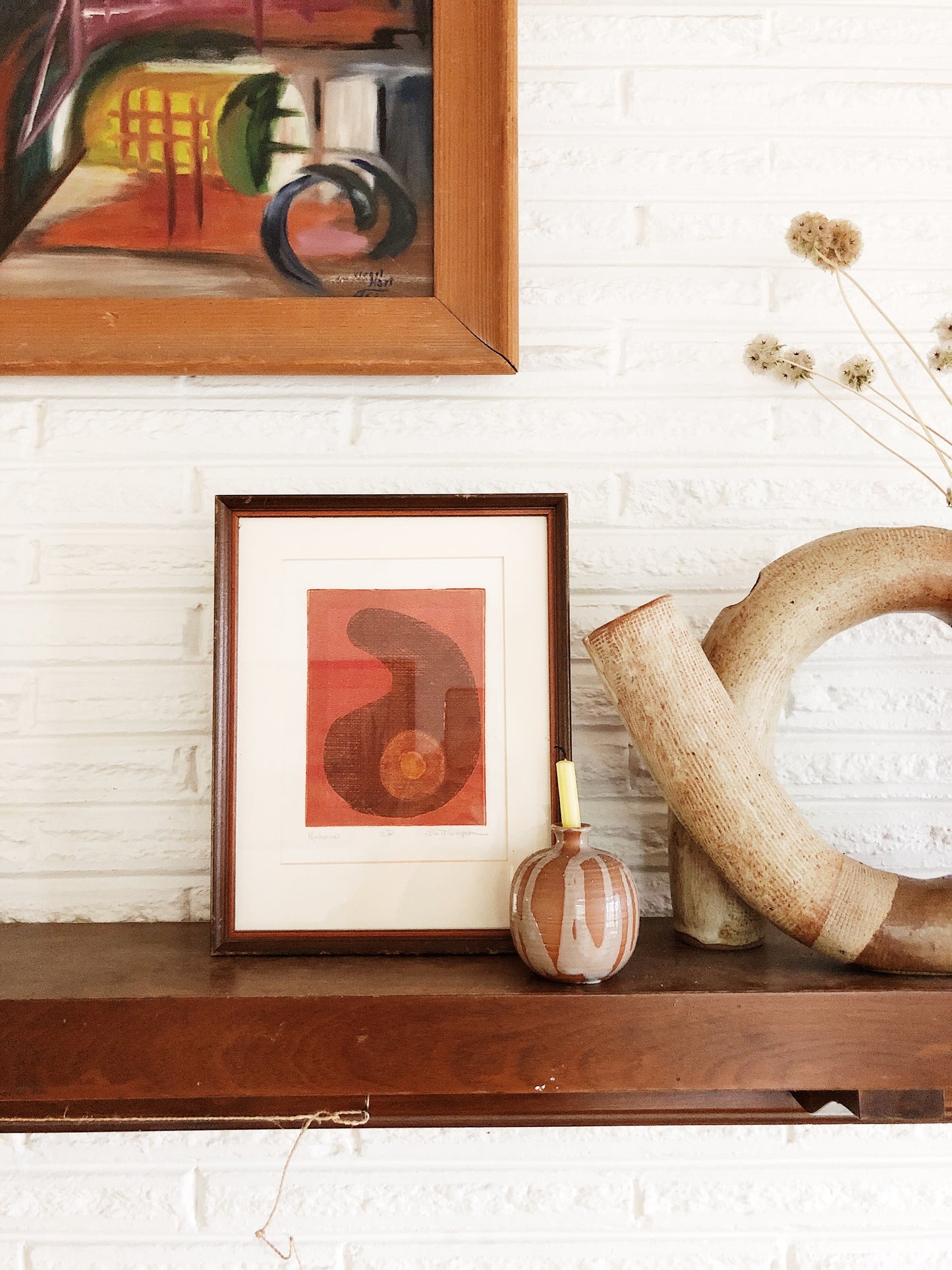 Original artist’s proof etching of a modernist Madonna. Tomato red with cream mat. Vintage wood frame under glass. Signed