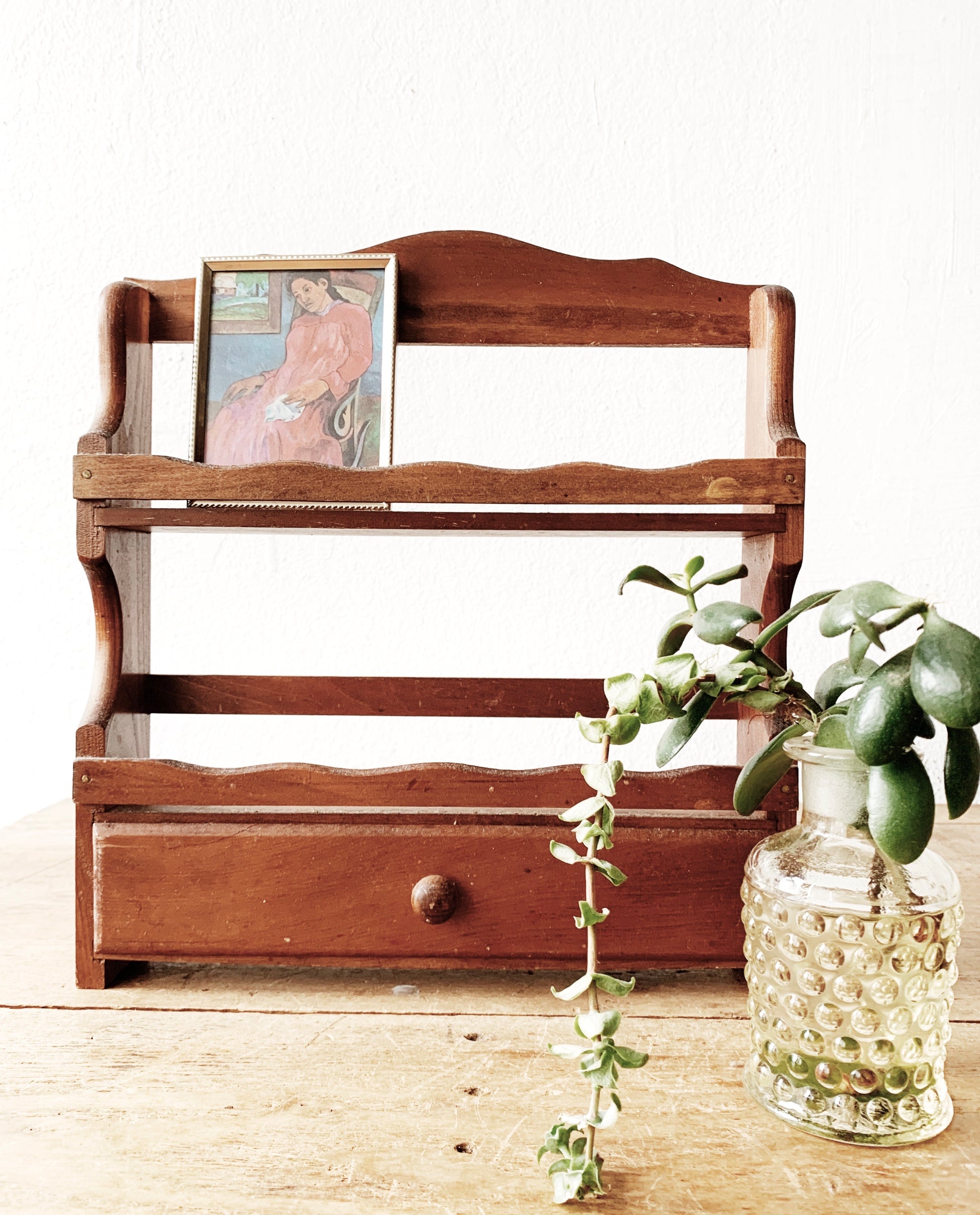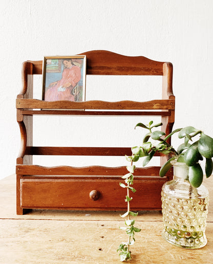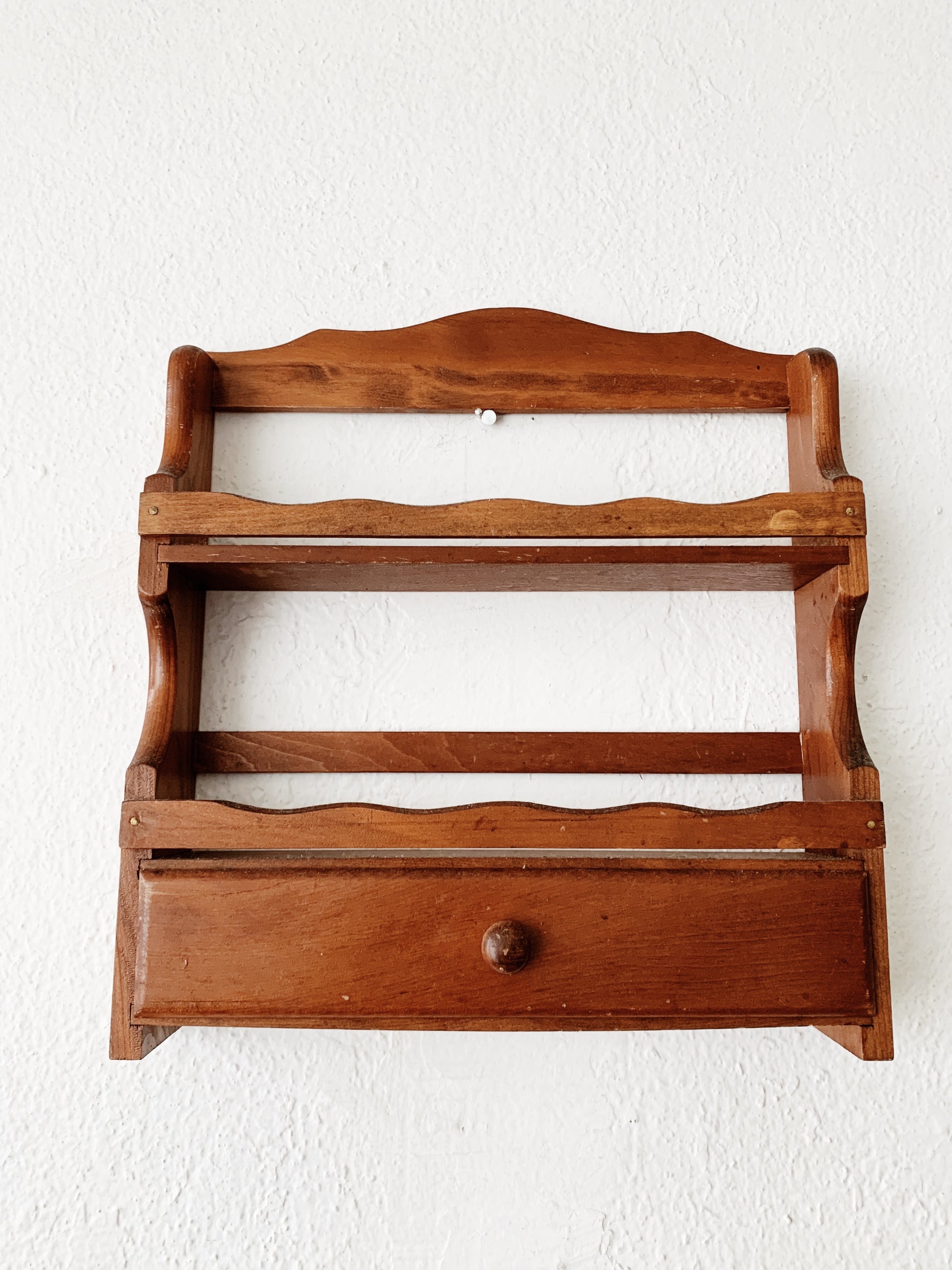 Wonderful vintage hanging wood spice rack with drawer. Pretty warm tone to the wood