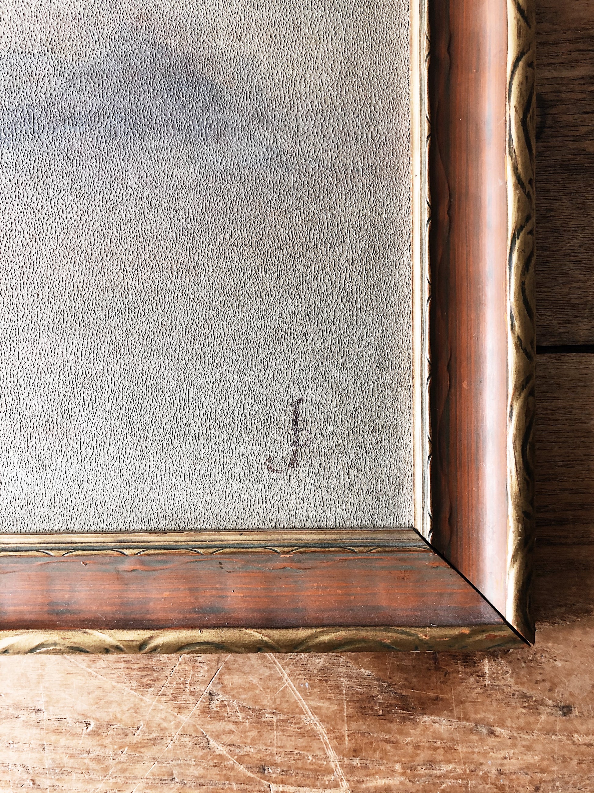 A unique addition to an art wall. This old painting is so lovely. It has subtle colors hidden deep within. The signature really hooked us. Old wood frame