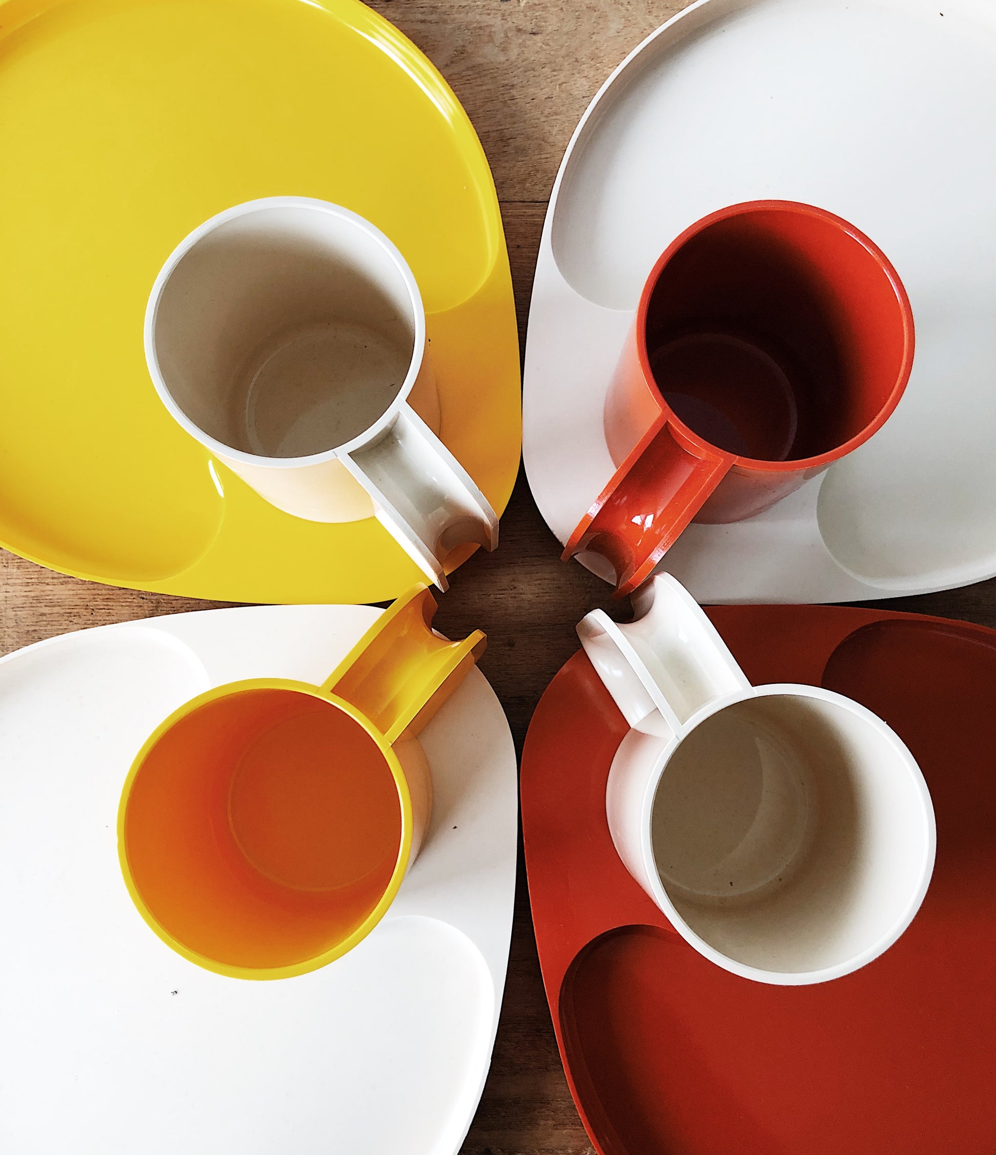 In the style of Heller, vintage 70s Sterilite hard plastic stackable mug and dish set.