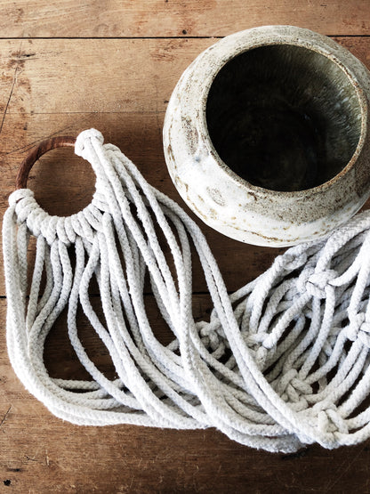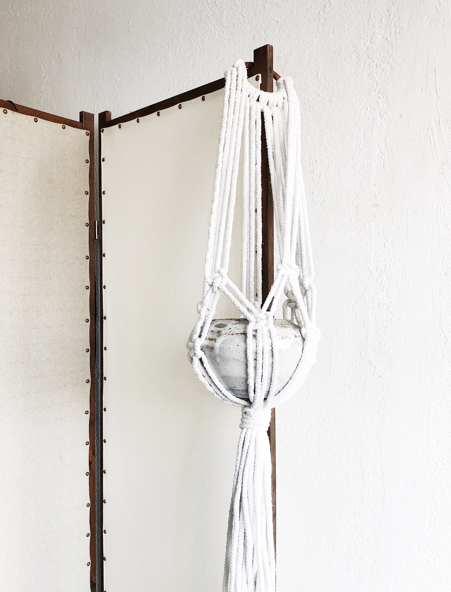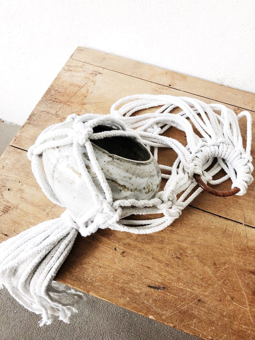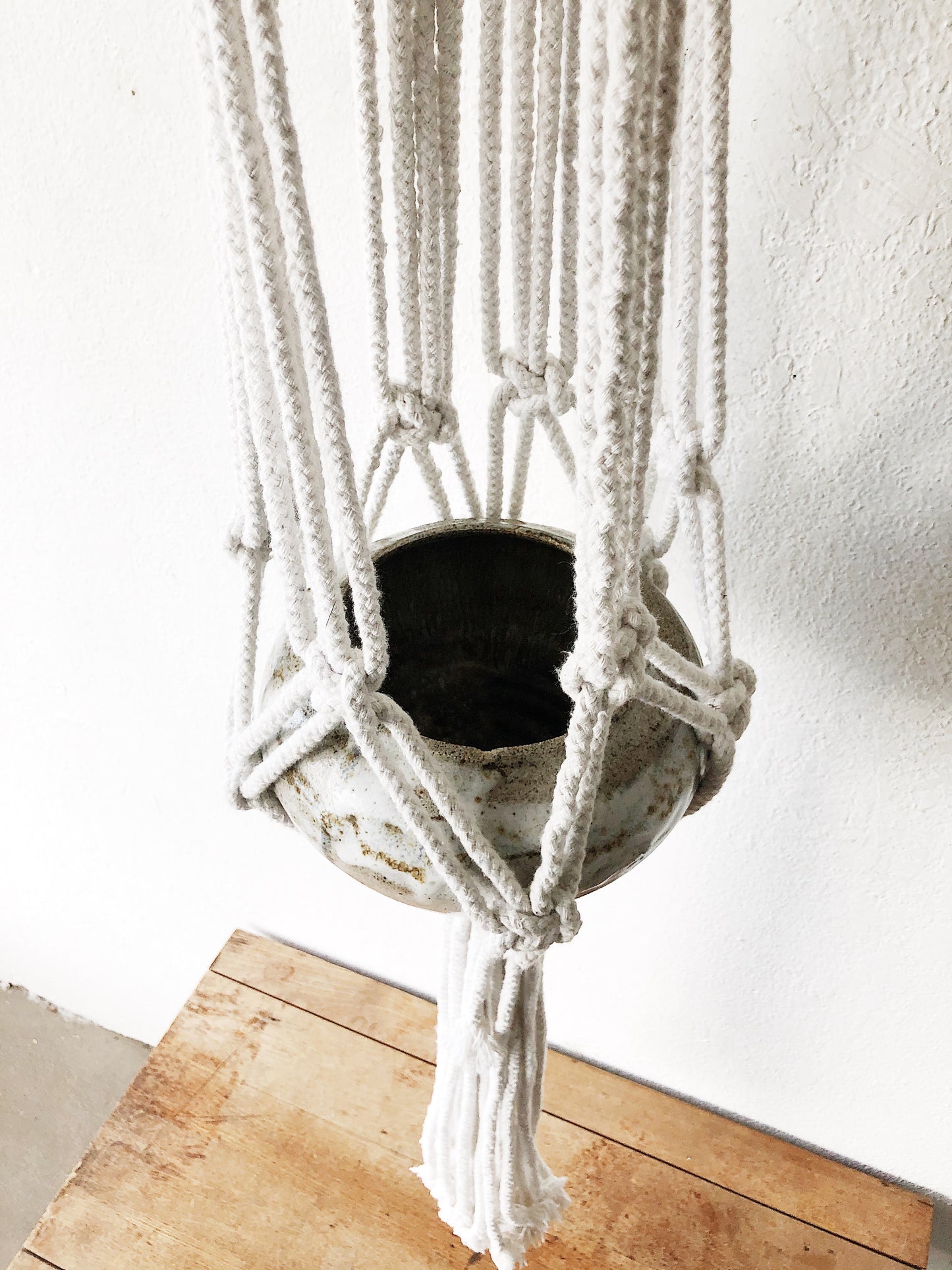 Thick cotton macrame and tortoise shell ring. Hangs a full 50” and accommodates up to a 12” pot