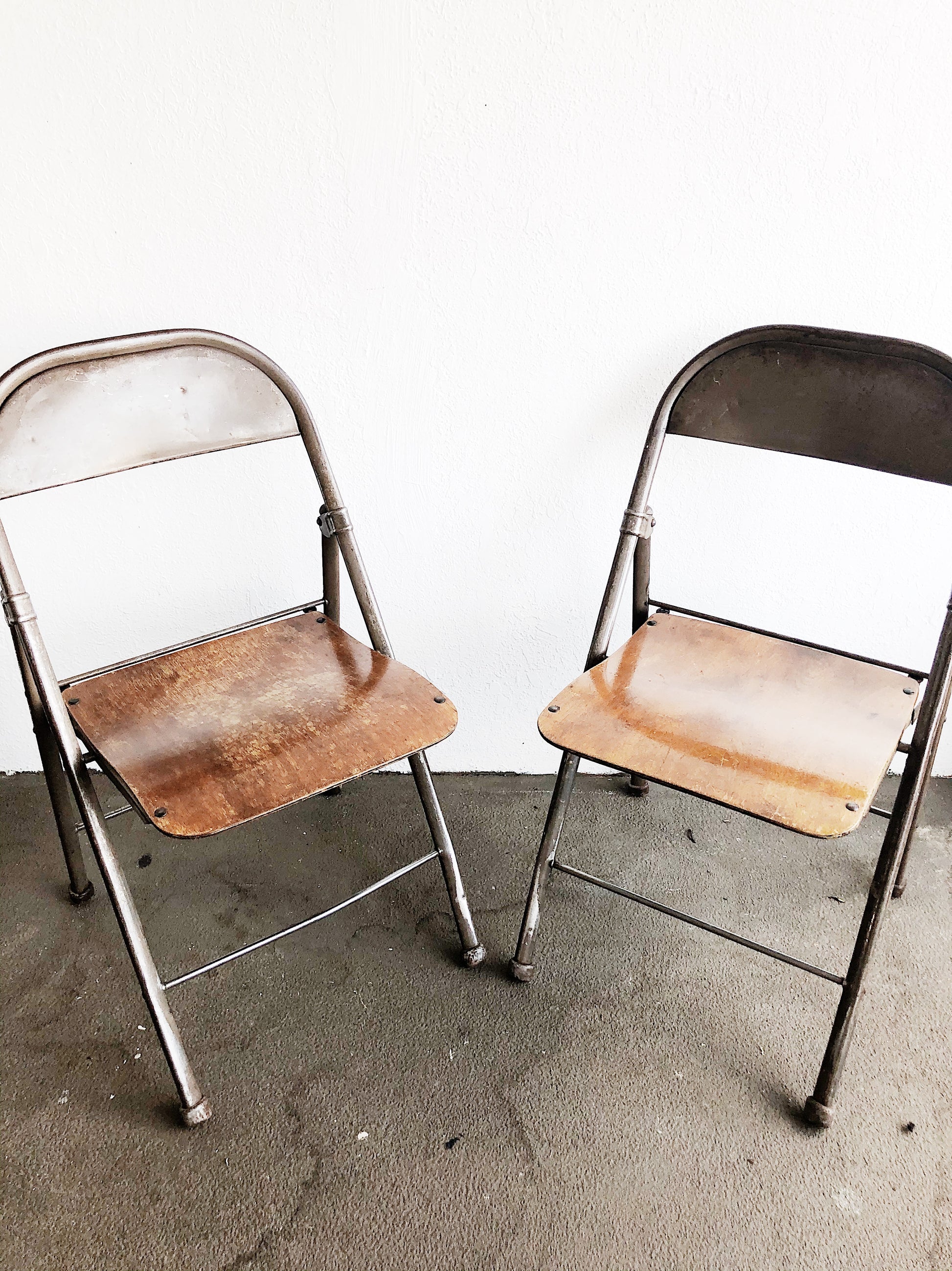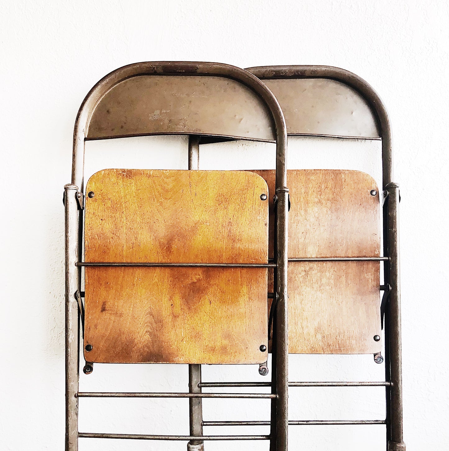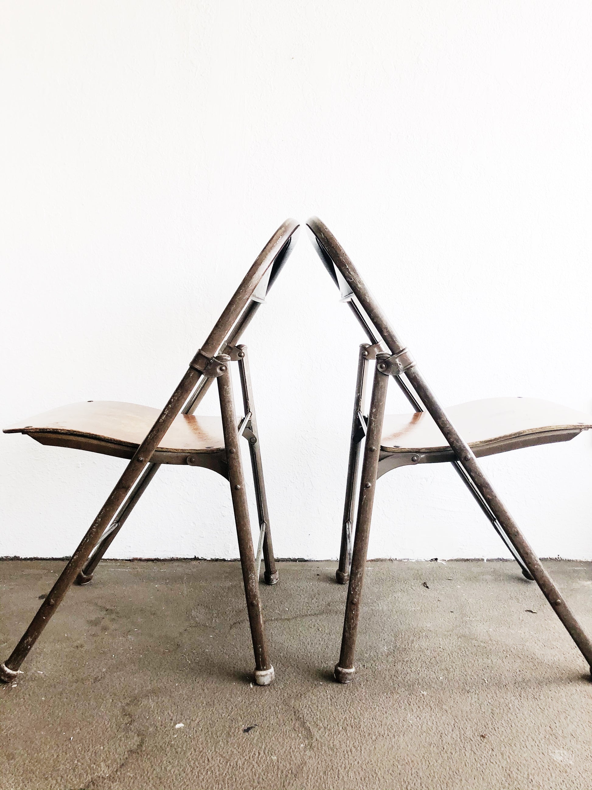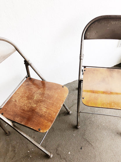 Fab vintage industrial folding chair with lacquered wood seat. Sold individually but really good as a pair. Sturdy, sleek but warm