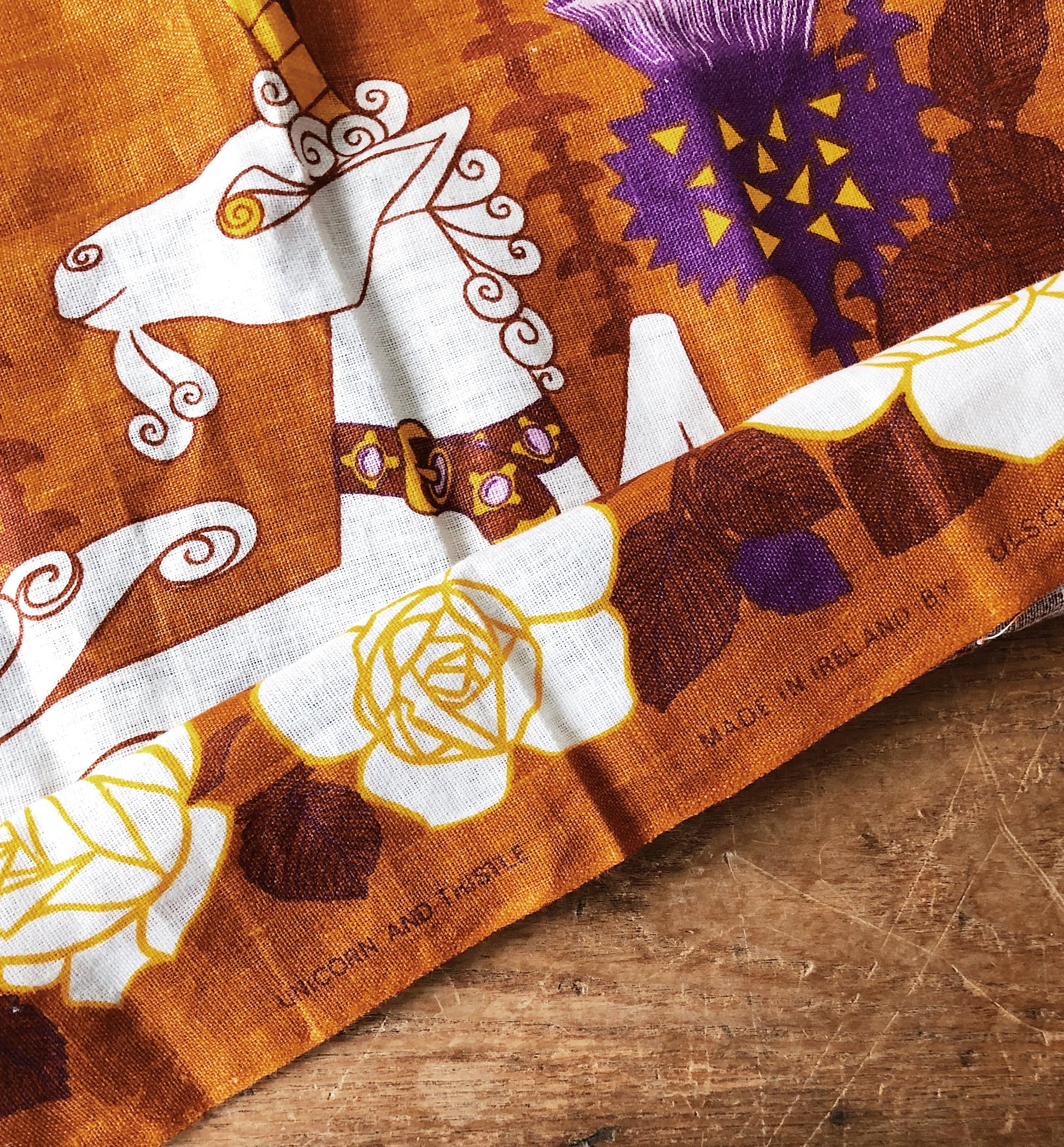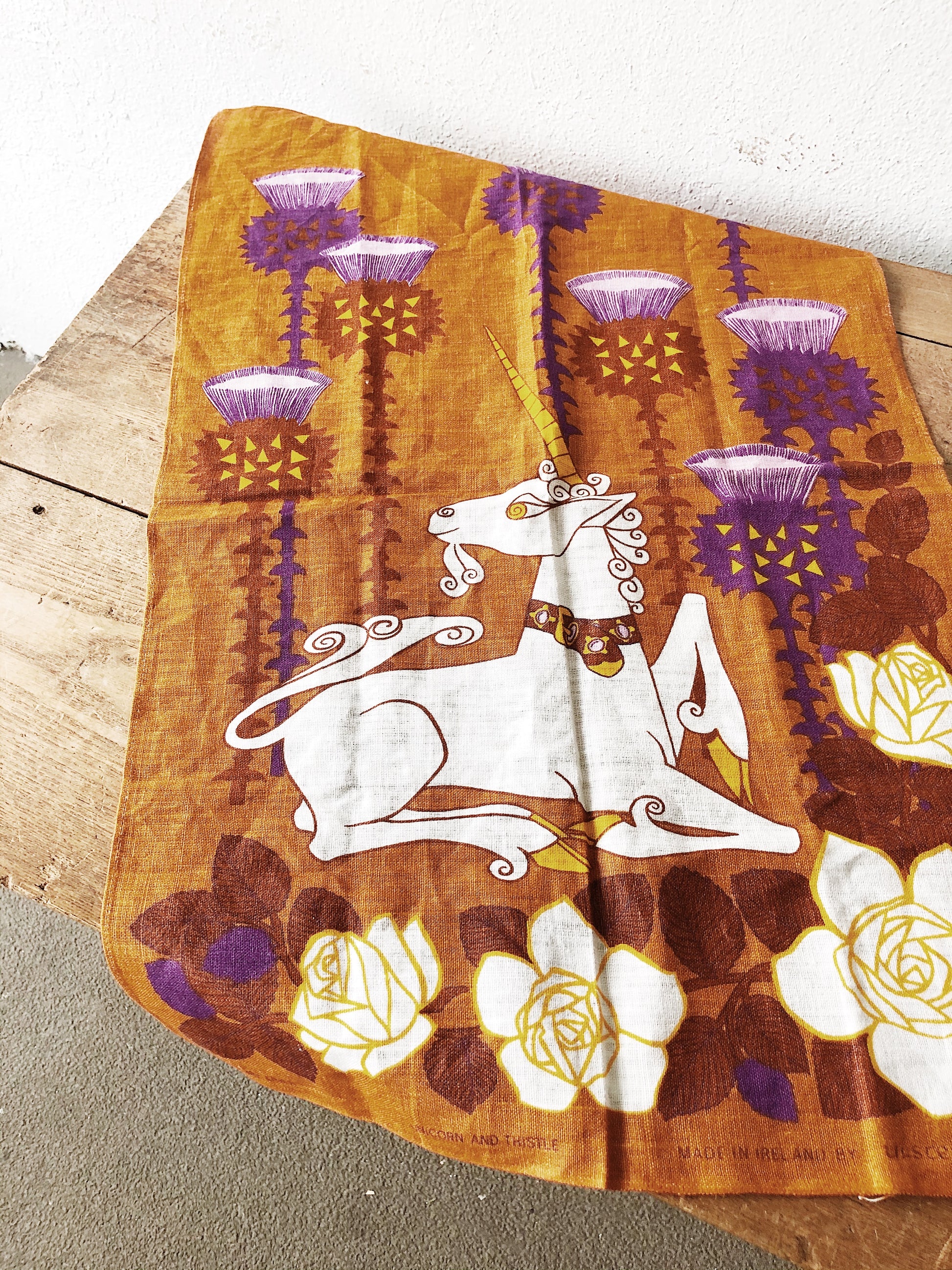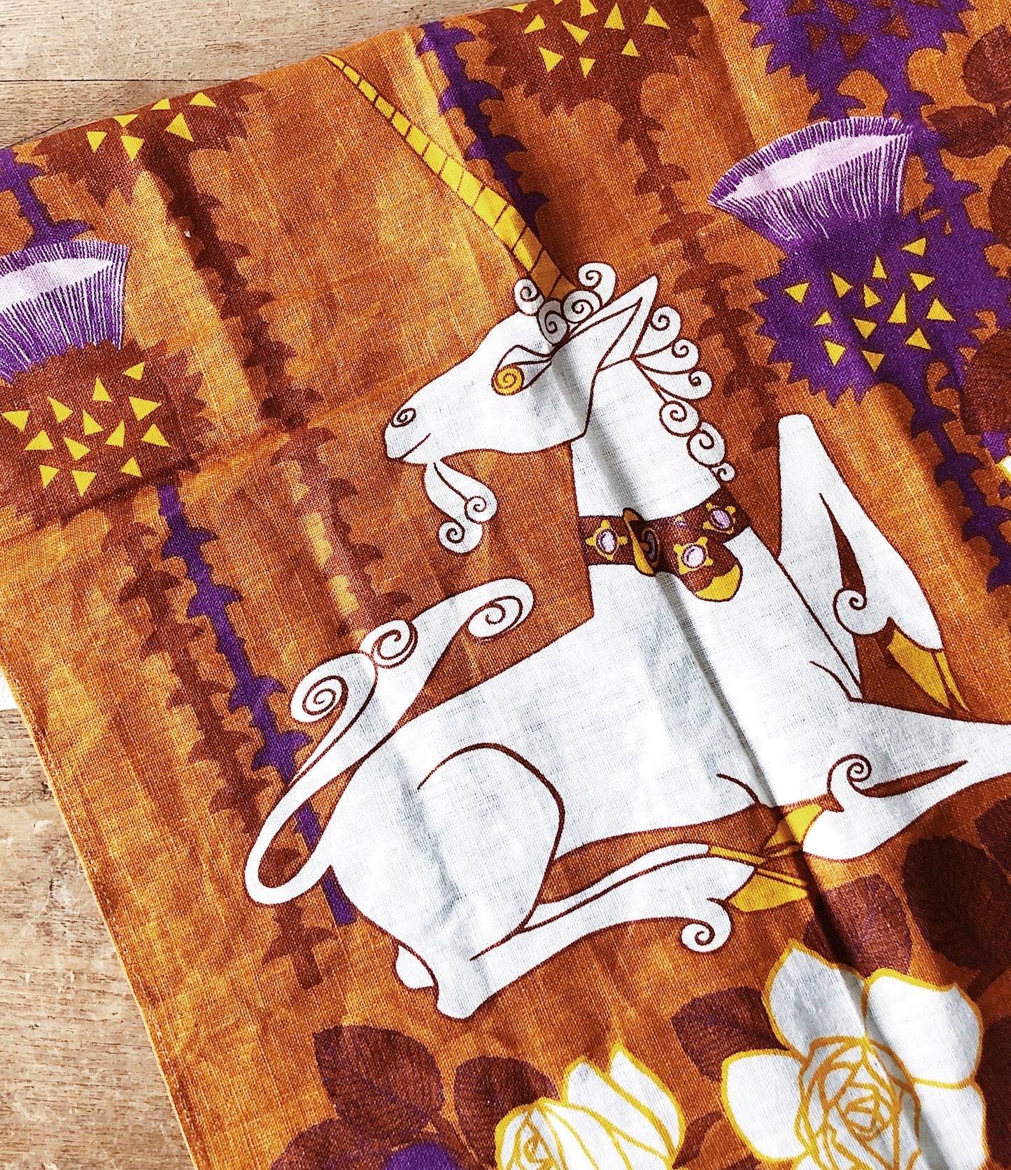 Wonderful saturated colors in this Irish linen towel. Fantastical unicorn design with an arts and crafts feel to those thistle! Definitely worthy of framing