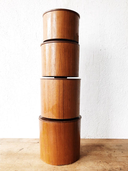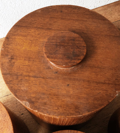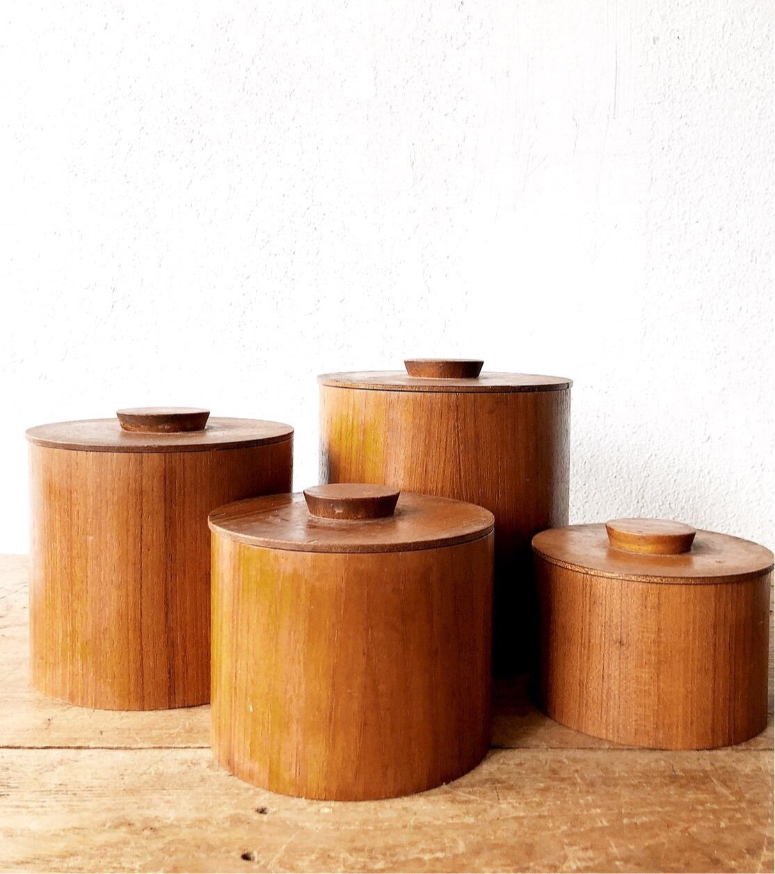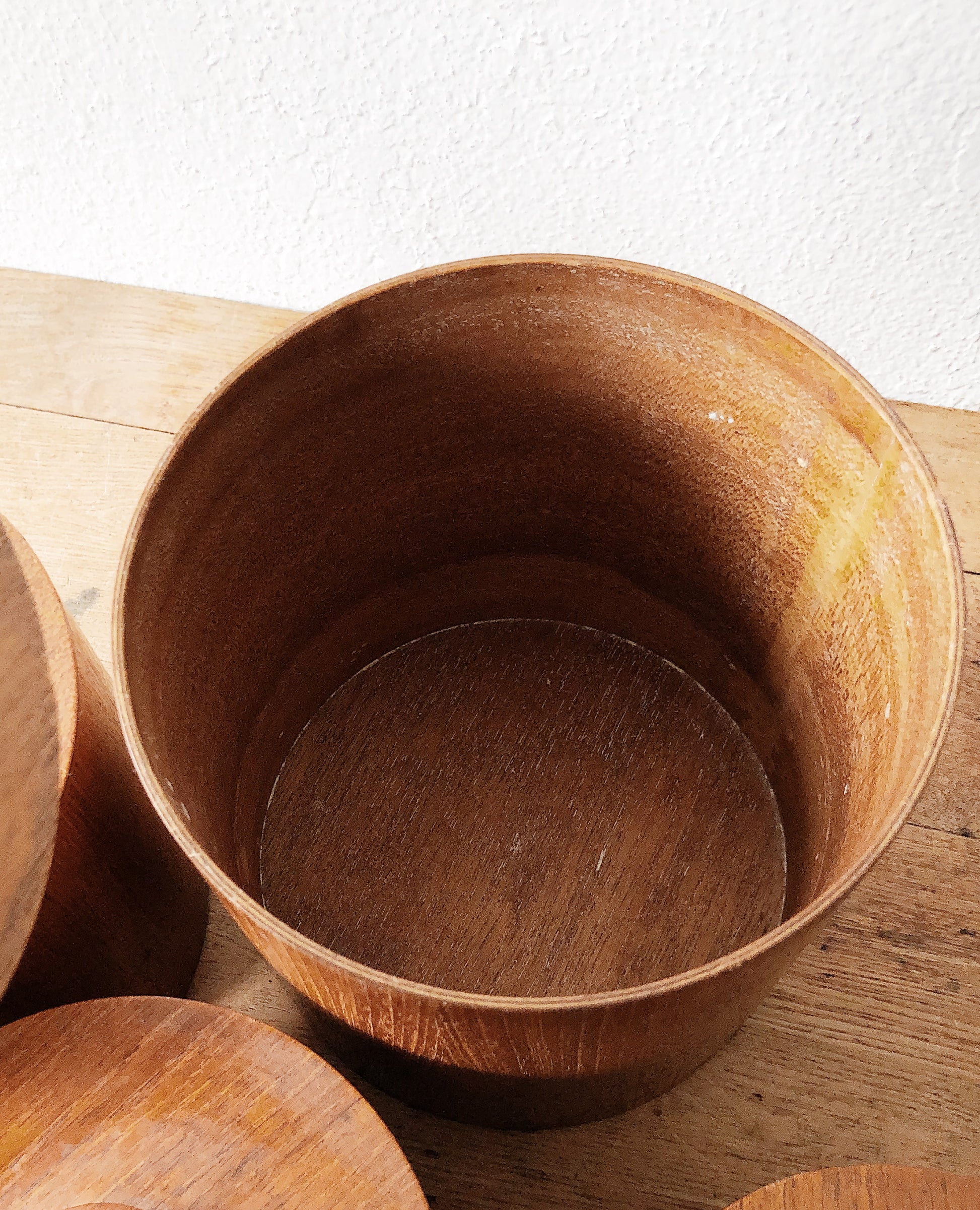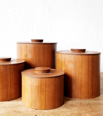Wood veneer canisters from the mid century. Clean inside and out. Nesting for storage. Great lid handles too. A few areas of veneer loss, see photos, easily hidden