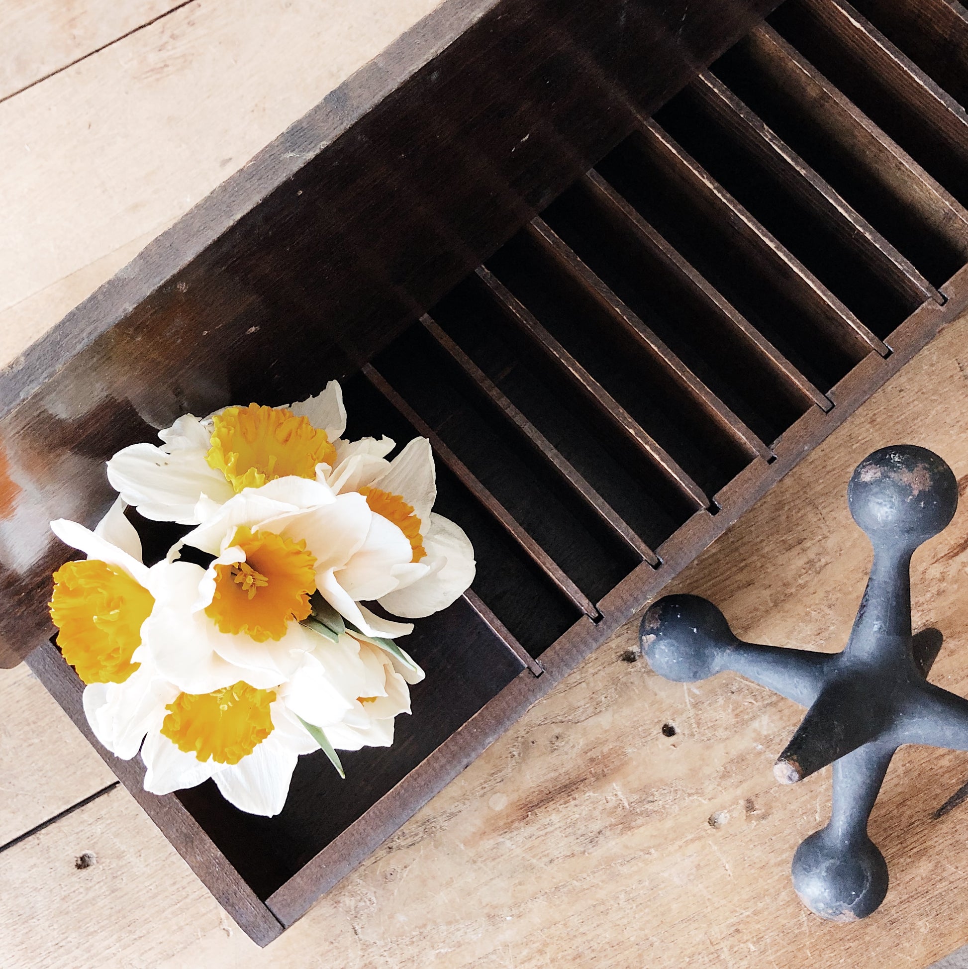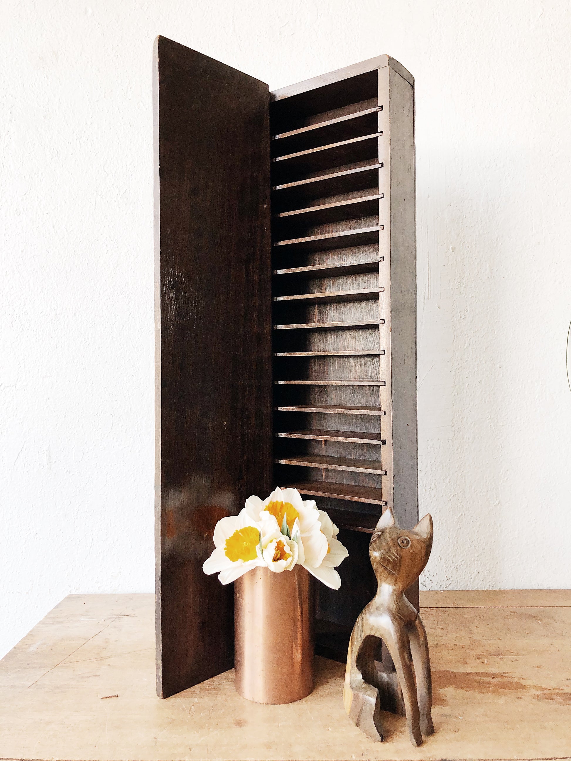 A handsome vintage divided box that looks handmade. Can be used as a mini filing system or shelf
