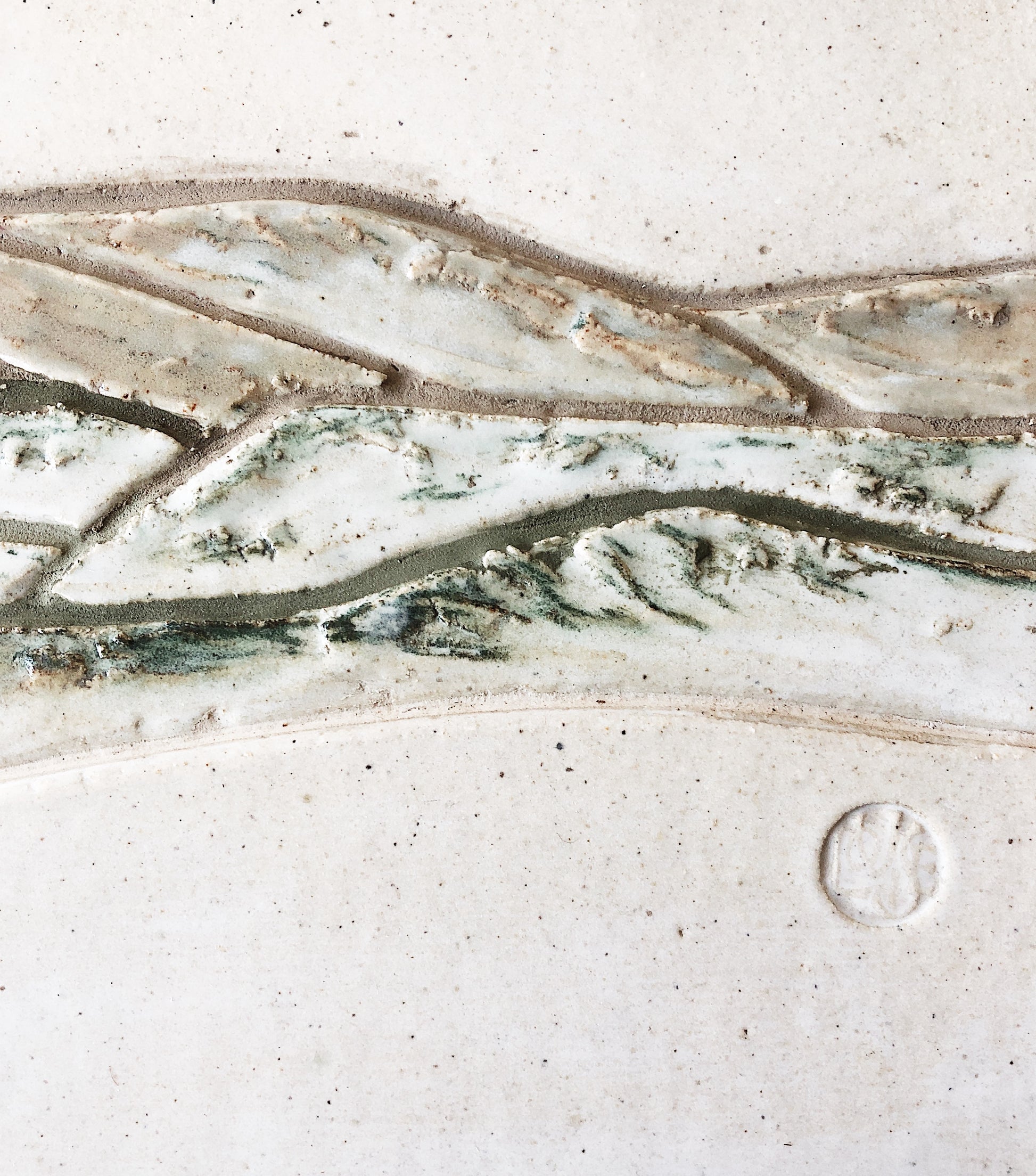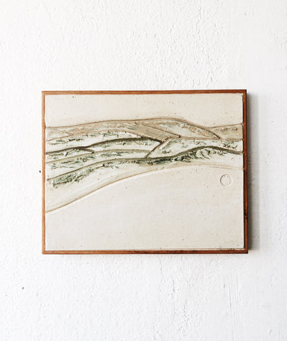 Beautiful framed ceramic tile by Nielsen and Parsons. We love the abstract landscape and the minimal colors have subtlety but depth as well.