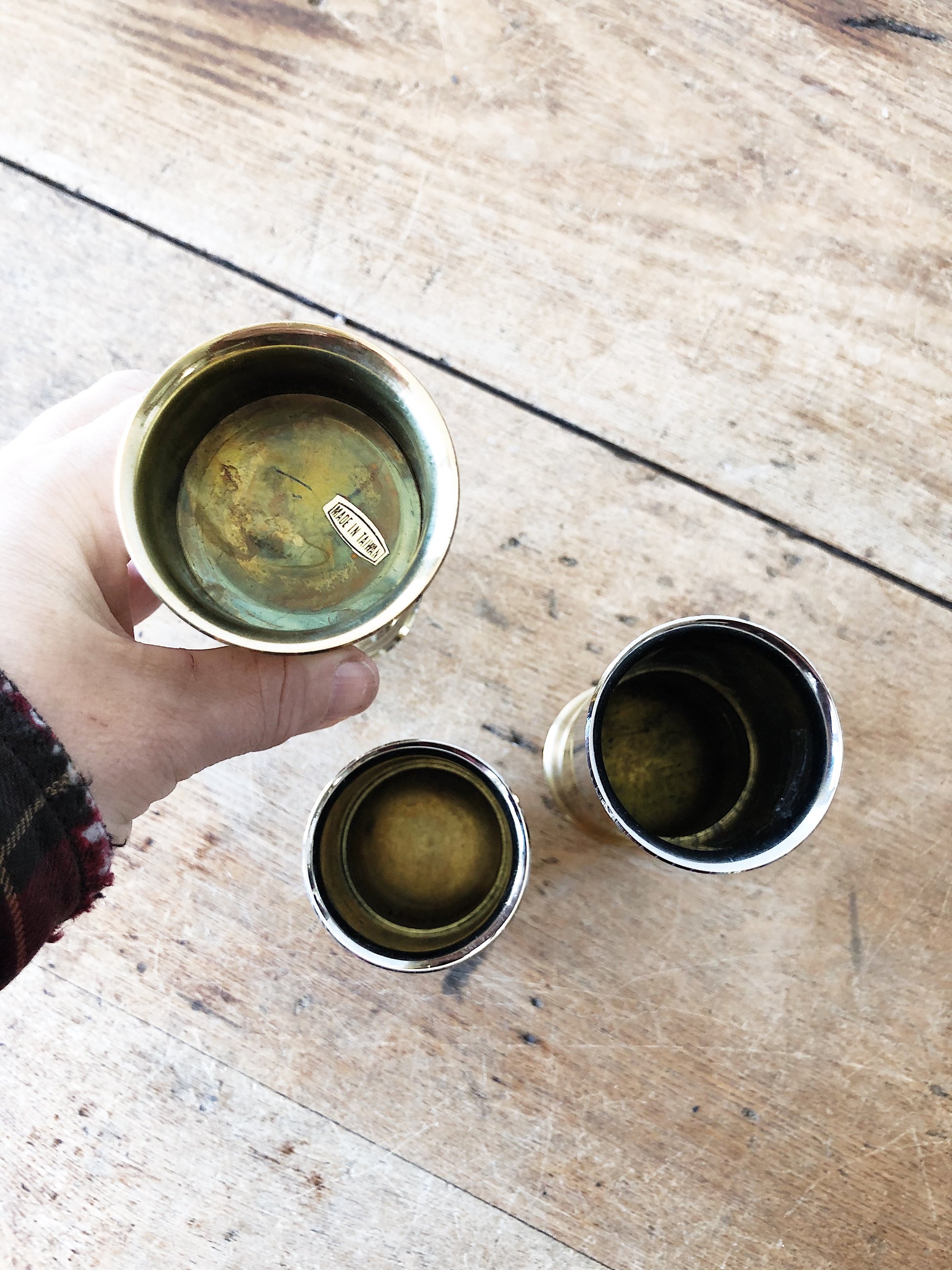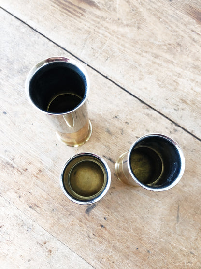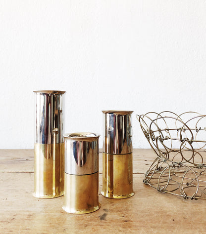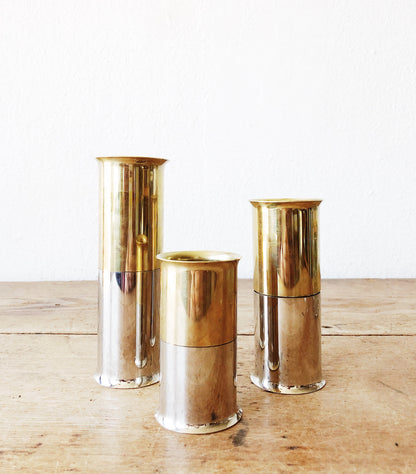 Brass and silver plated candle holder set. Flipped on one side it holds a thicker style taper, on the other a standard tea light. In wonderful condition and very glam