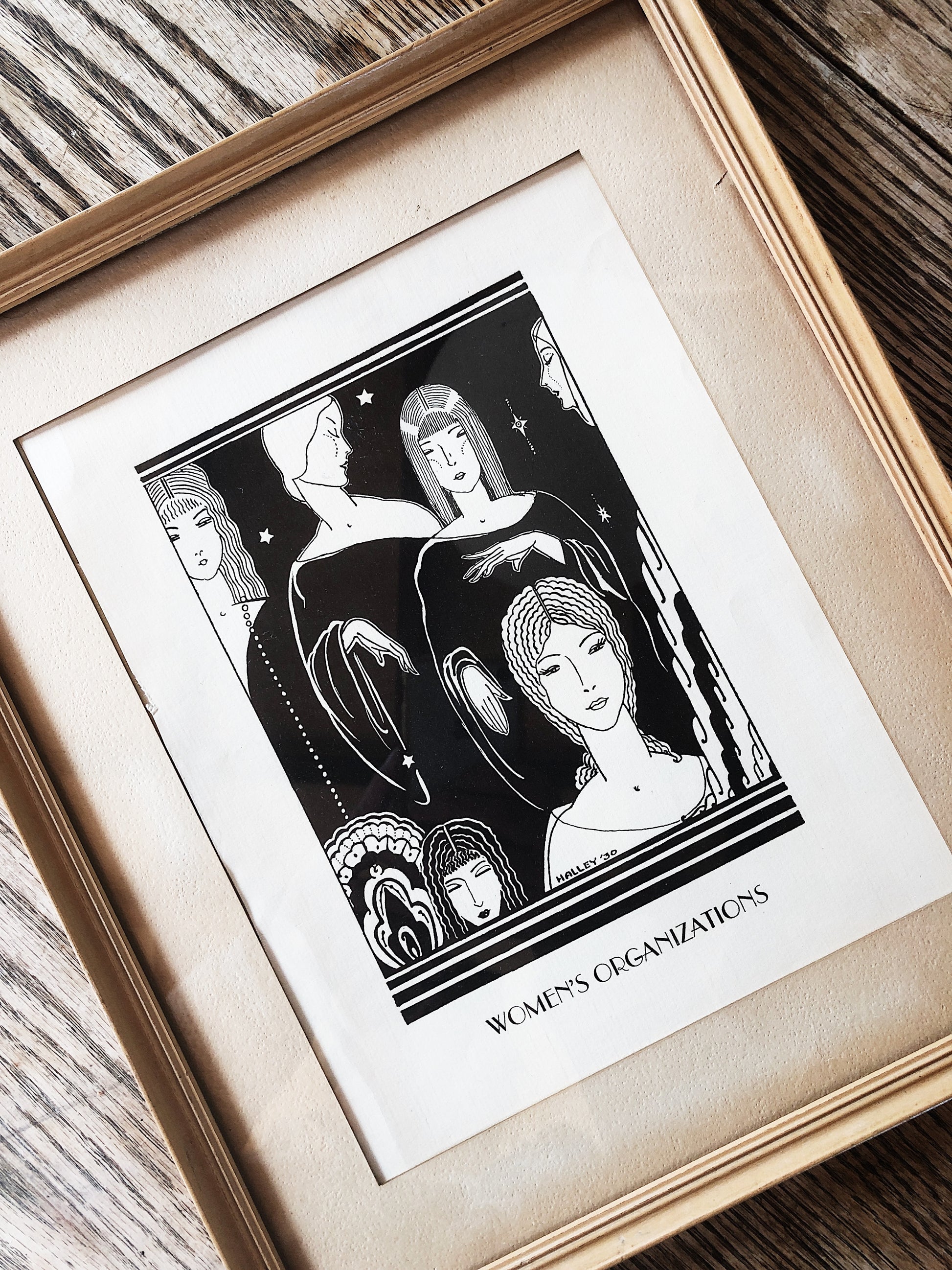 Art Deco era illustration by Halley c 1930 titled ‘women’s organizations’. Originally a woodcut, it is now an illustrated print. On ivory colored medium stock