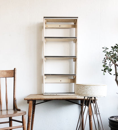 Such a great find! Wooden shelf painted creamy warm white. Original early mid century linoleum shelf surfaces in various fun patterns. Chrome shelf lips. Braces for hanging.