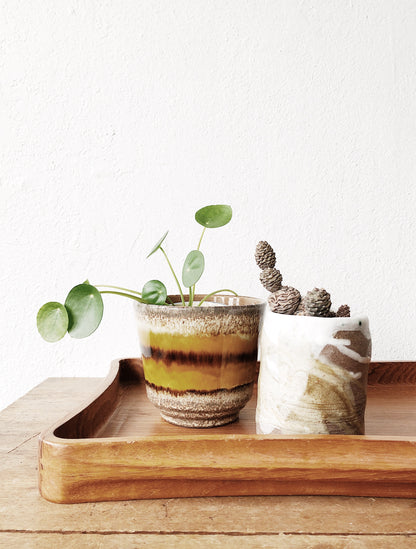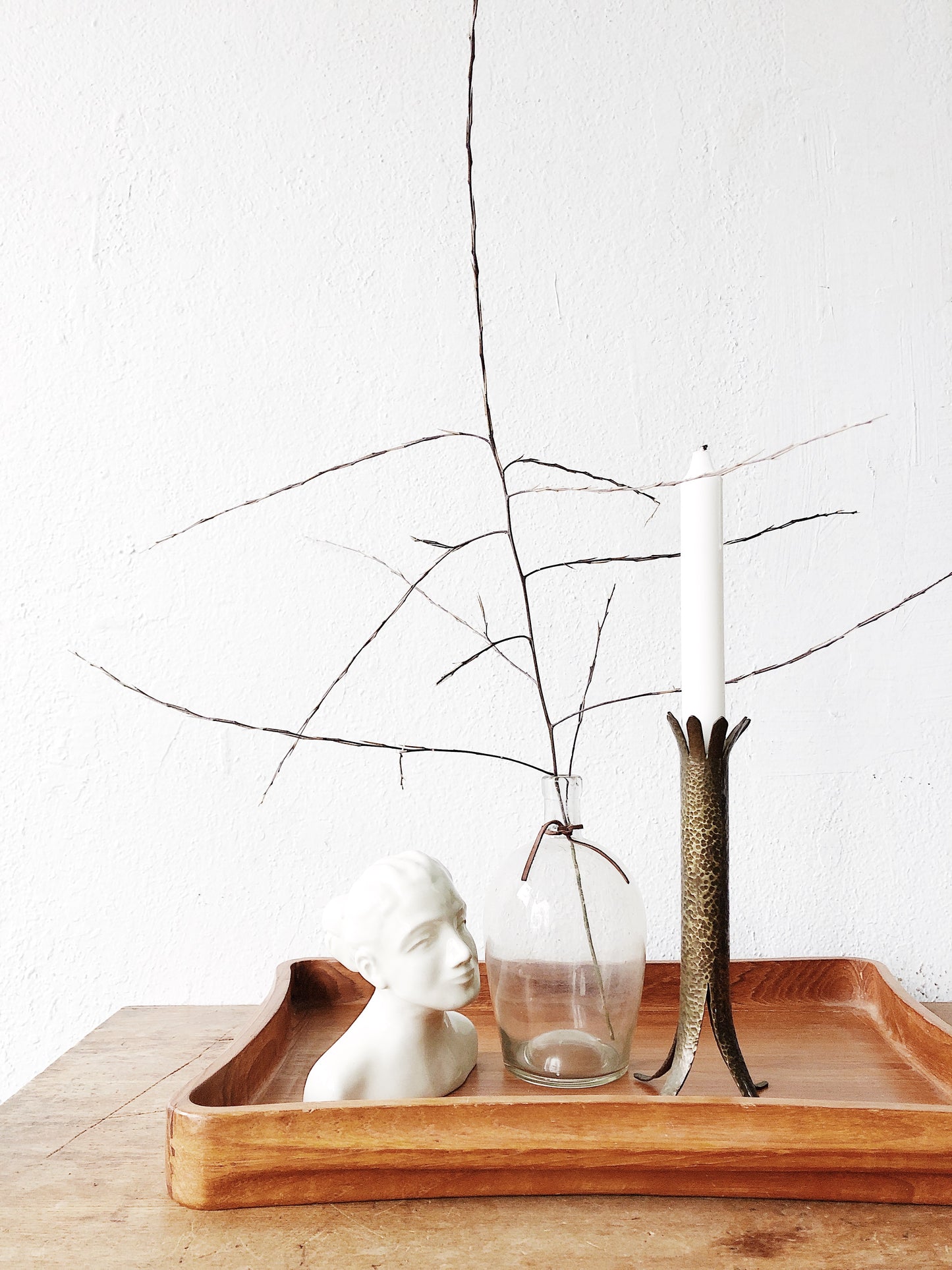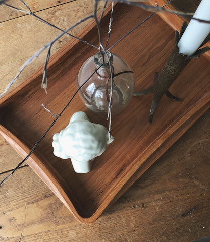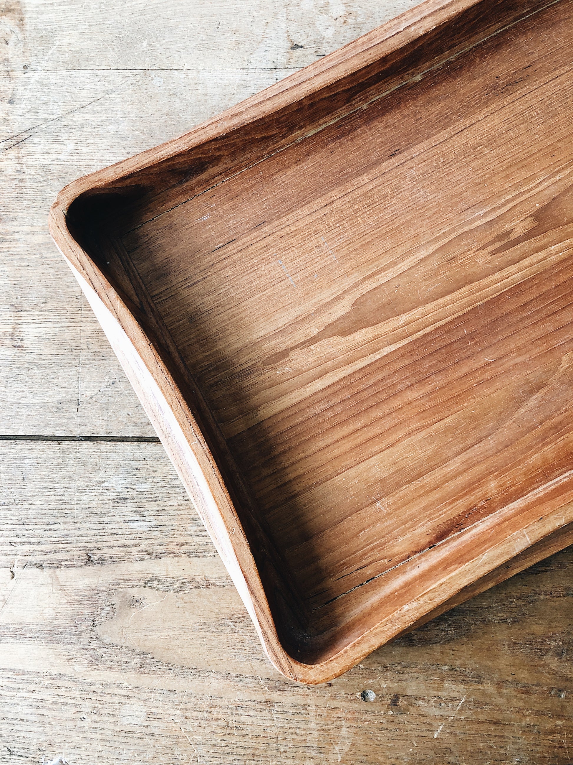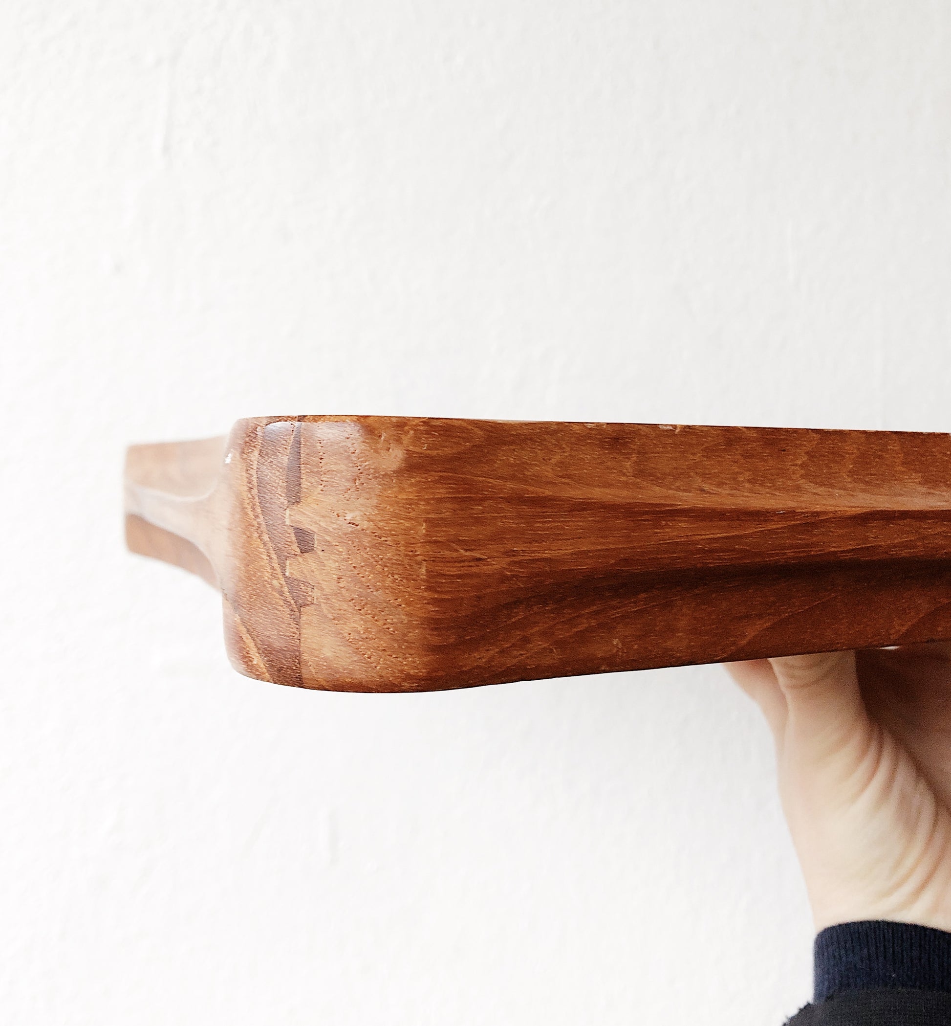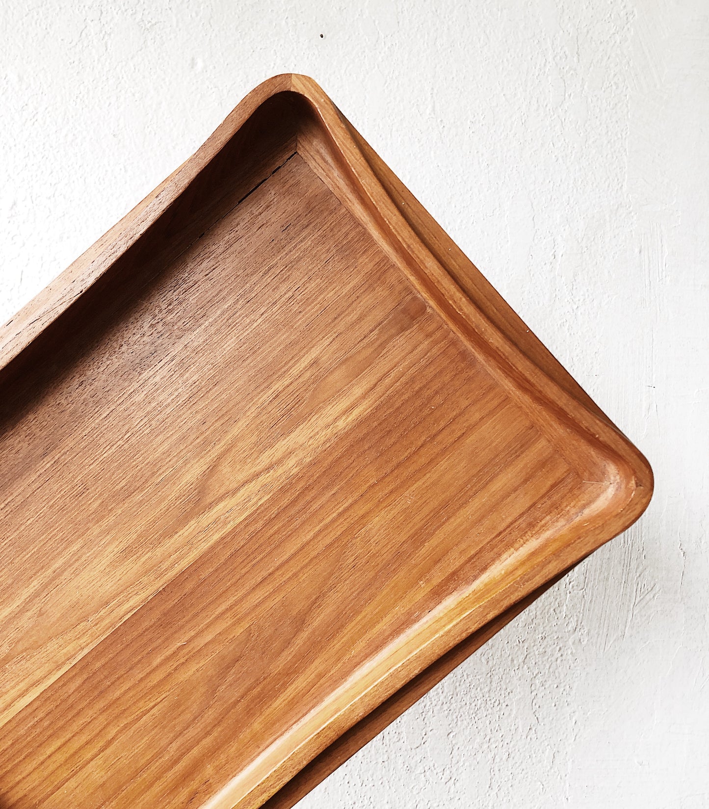 Beautiful teak tray with integrated handles. Corner dovetailing. Lovely shape and grain. Perfect for drinks