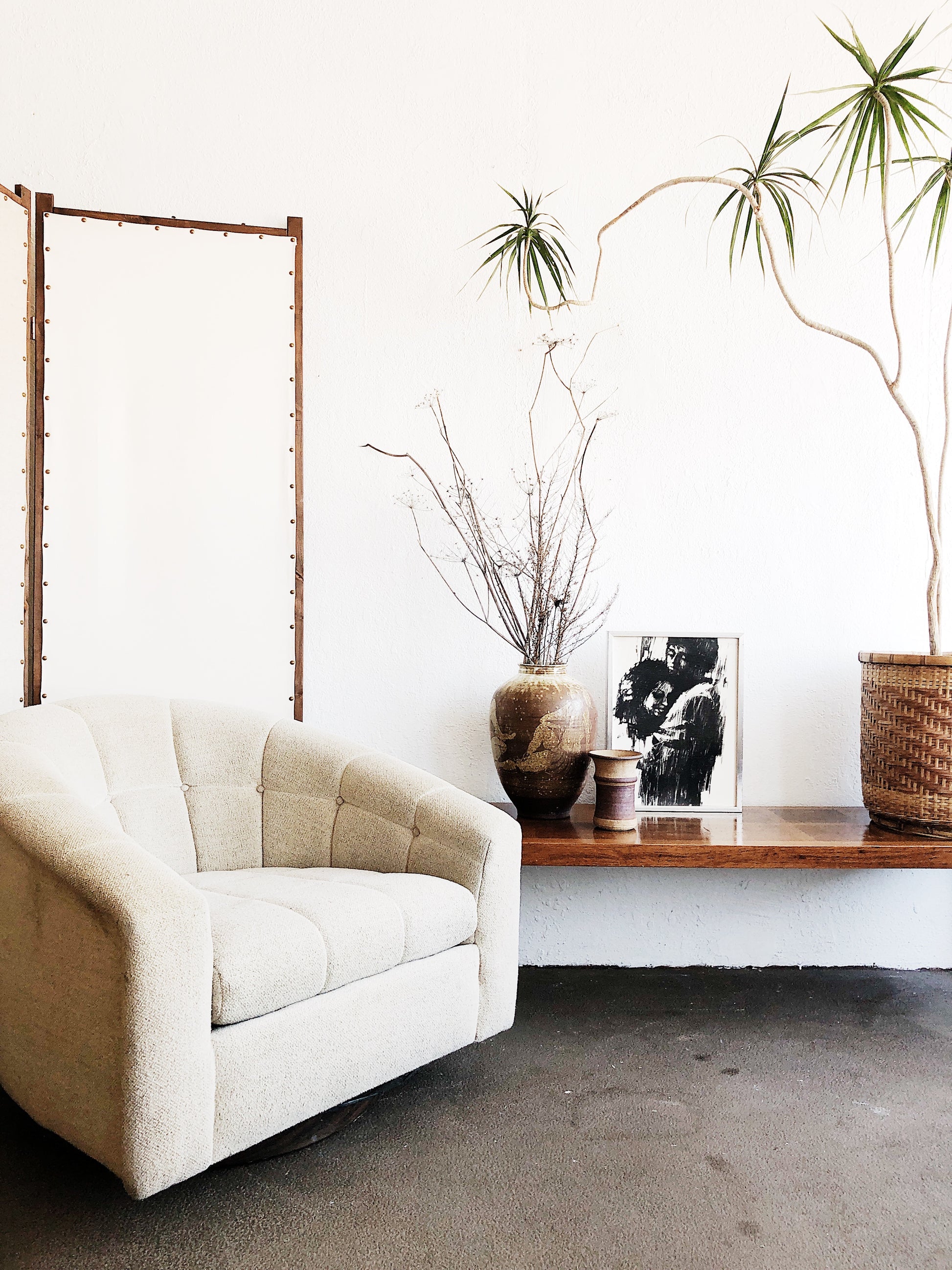 This swivel chair from the 60s was made right here in Portland by BP John. Suuuper comfy. Nubby neutral fabric. Spins easily.