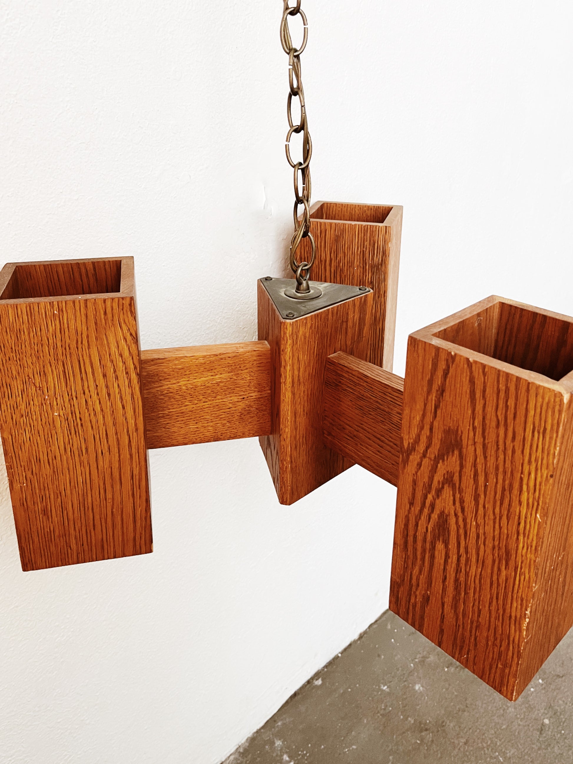 Stunning vintage wood modernist pendant light. Three arm design with up and down lighting in each arm. Wood ceiling plate and aged bronze details throughout. A really nice one!