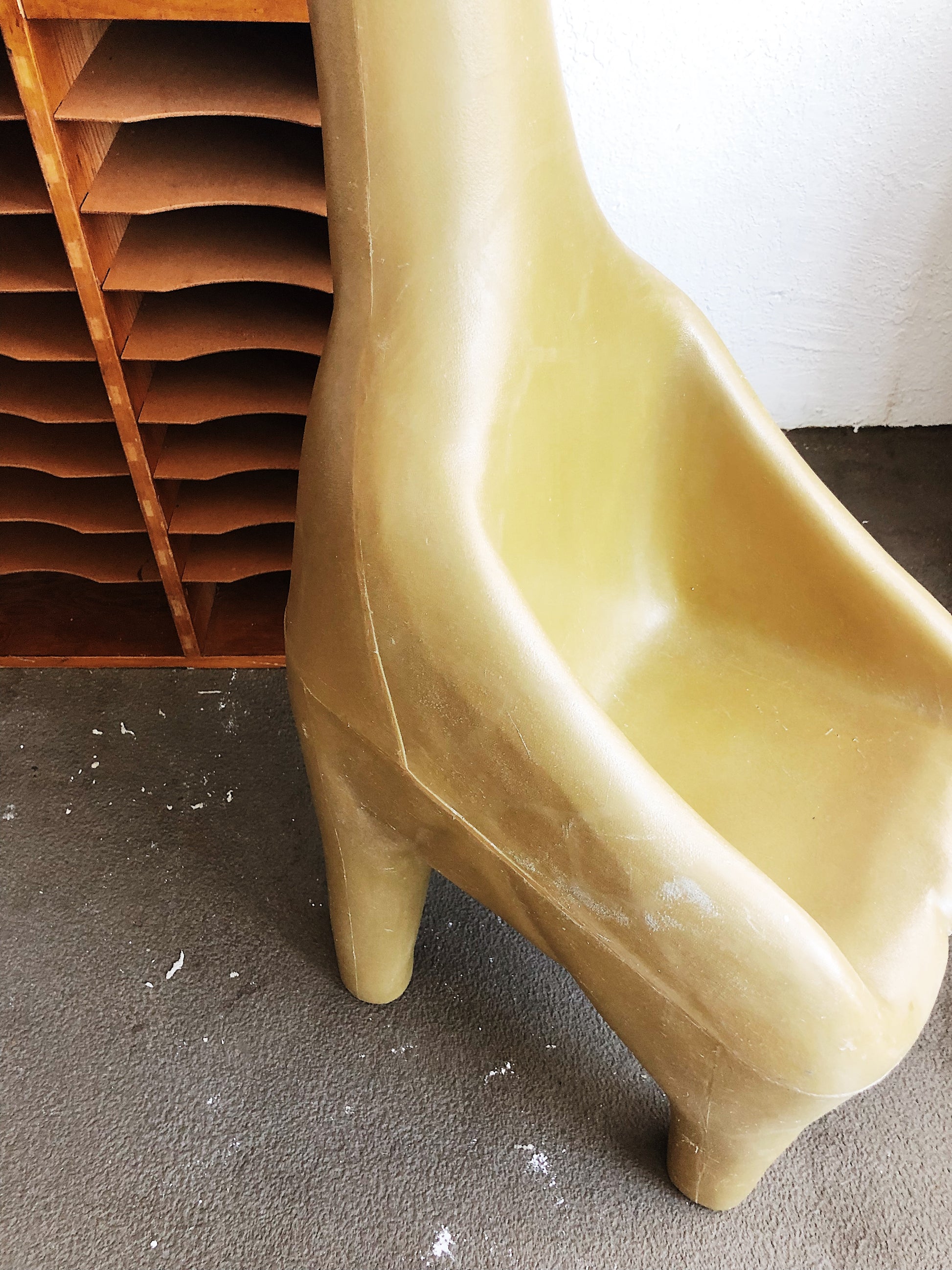 Vintage 1973 child’s plastic giraffe chair from DW Gordon company. Deeper Mustard / olive drab color. In good condition with some surface wear