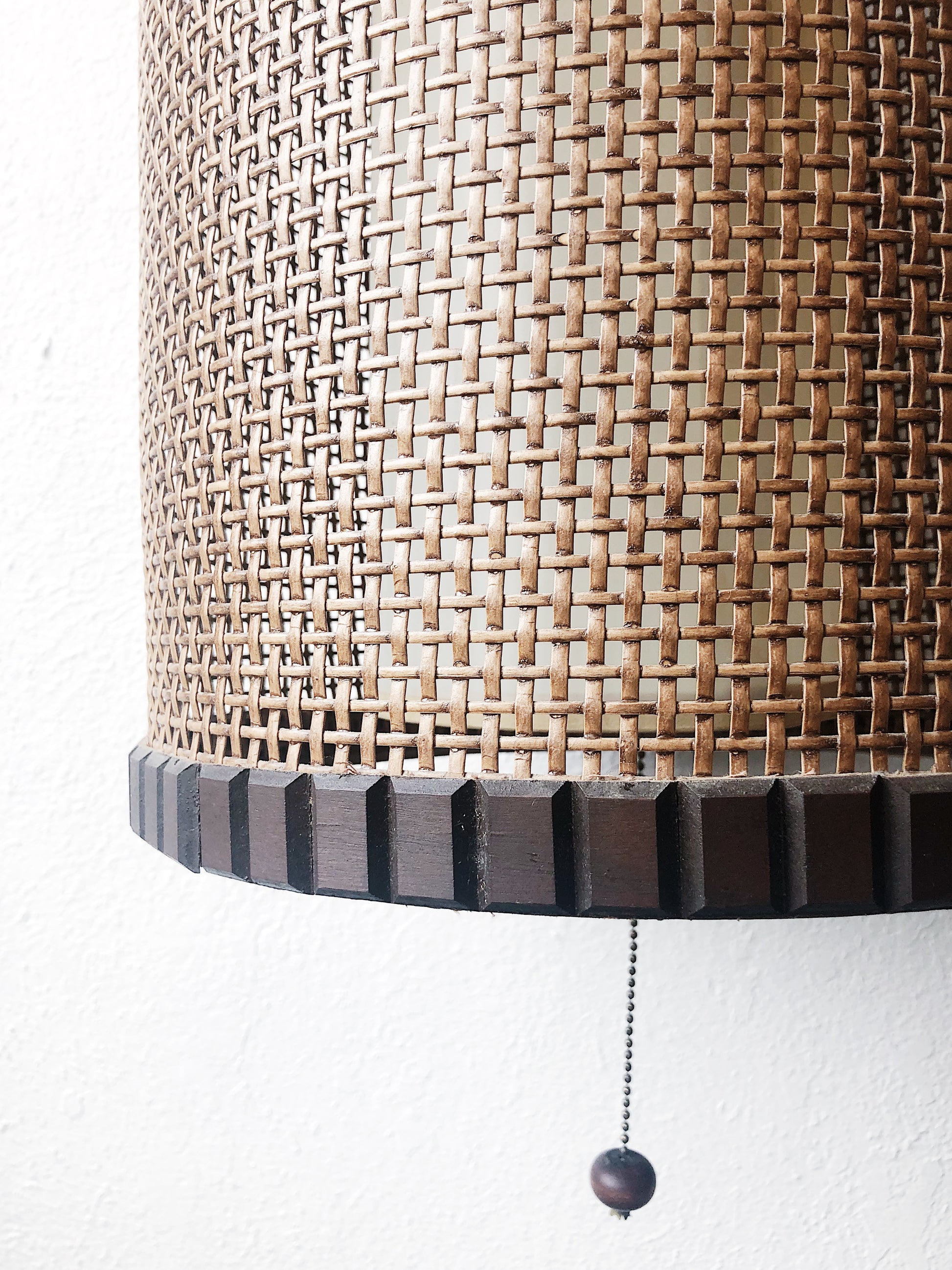 Dark brown 1960s swag lamp with cane shade and central diffuser shade. Wood trim and details. Long brass chain has a plug end so it’s super easy to use