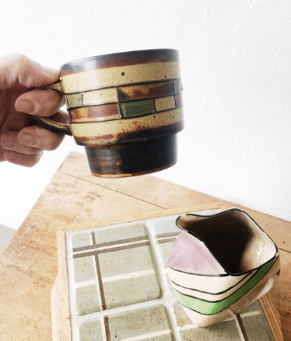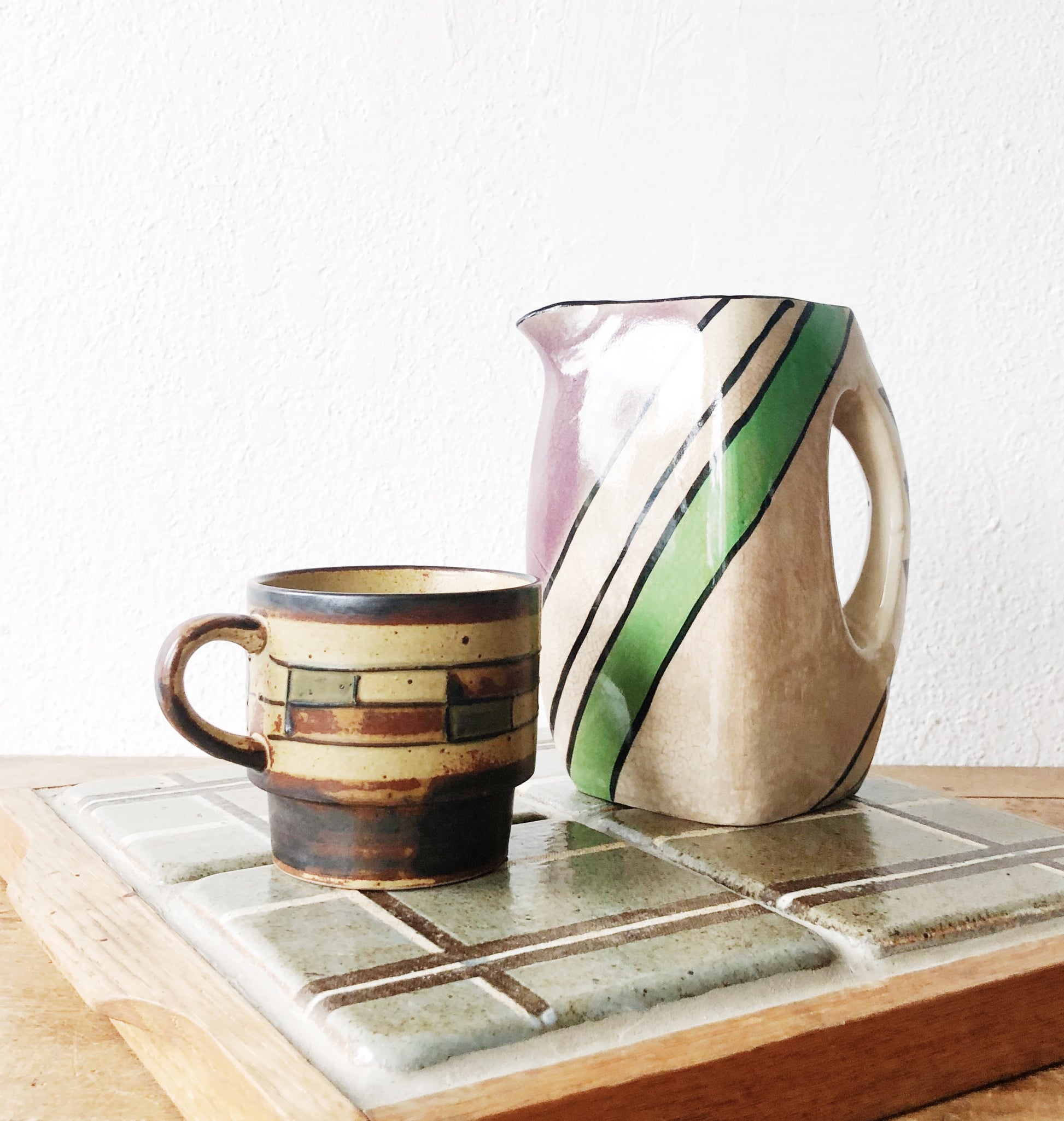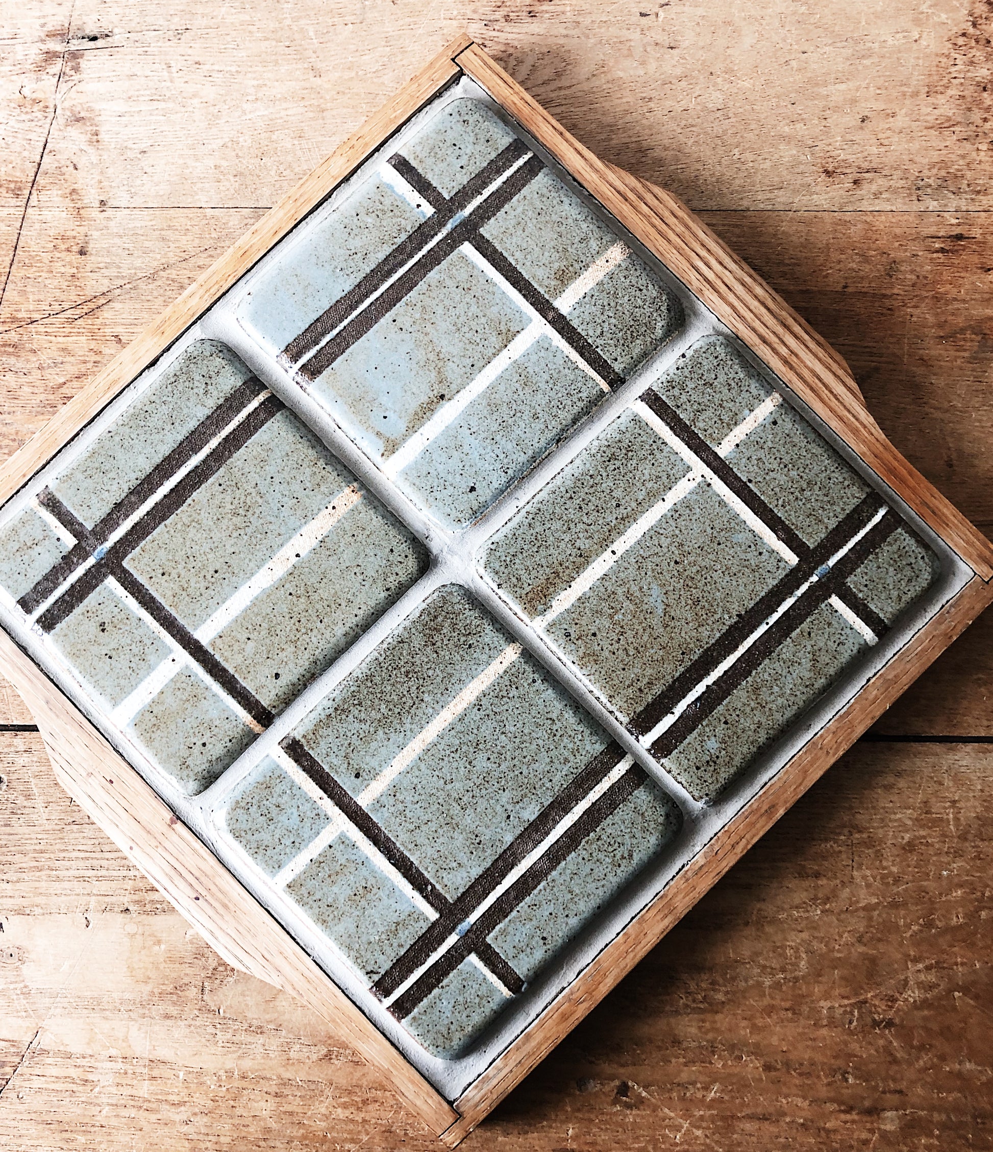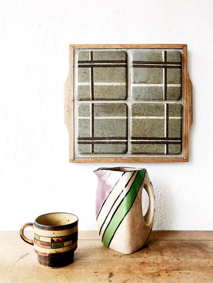 A larger size ceramic trivet with a fabulous pattern and coloring. Wood framed and heavy. You could hang this as art as well but it works particularly good for taking pots off the stove