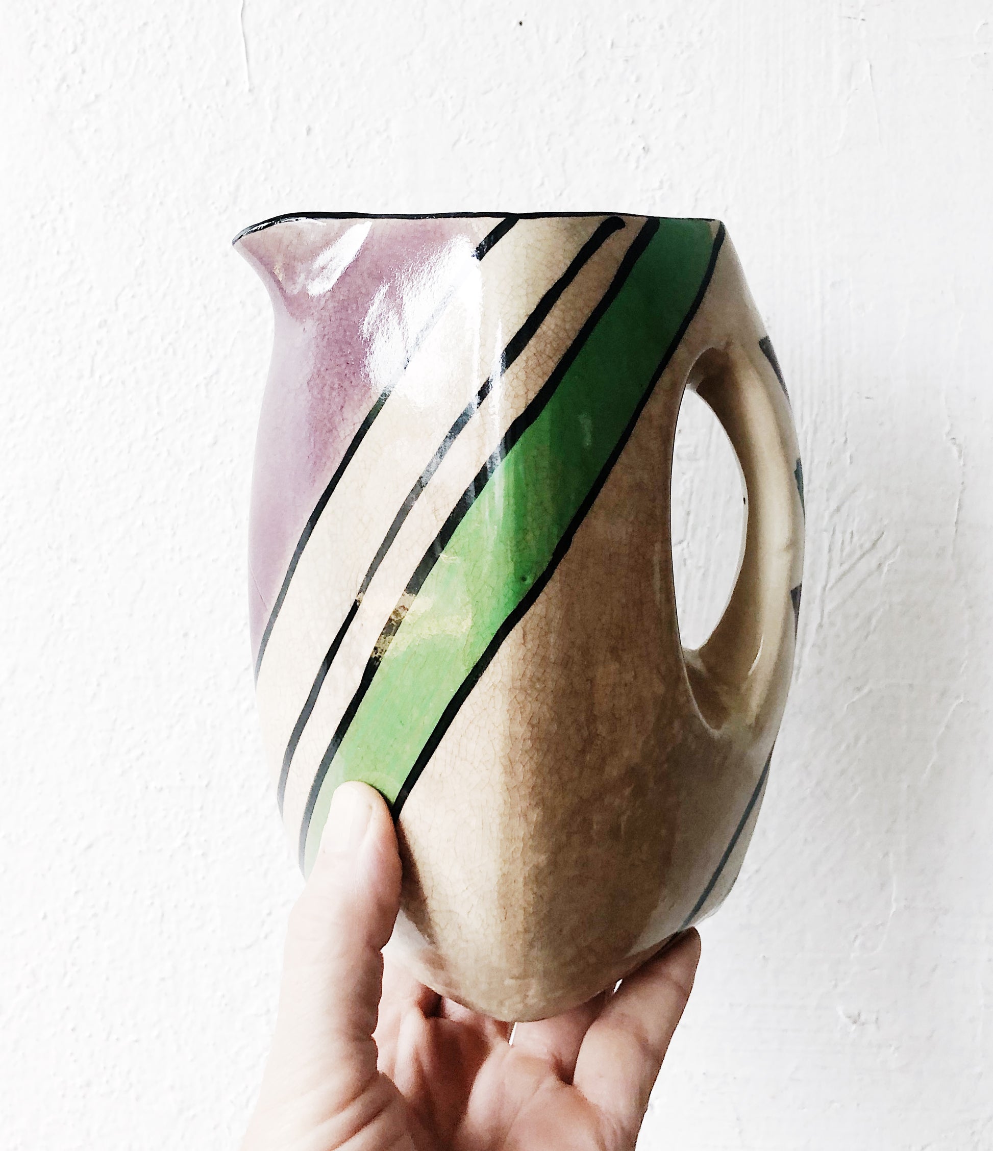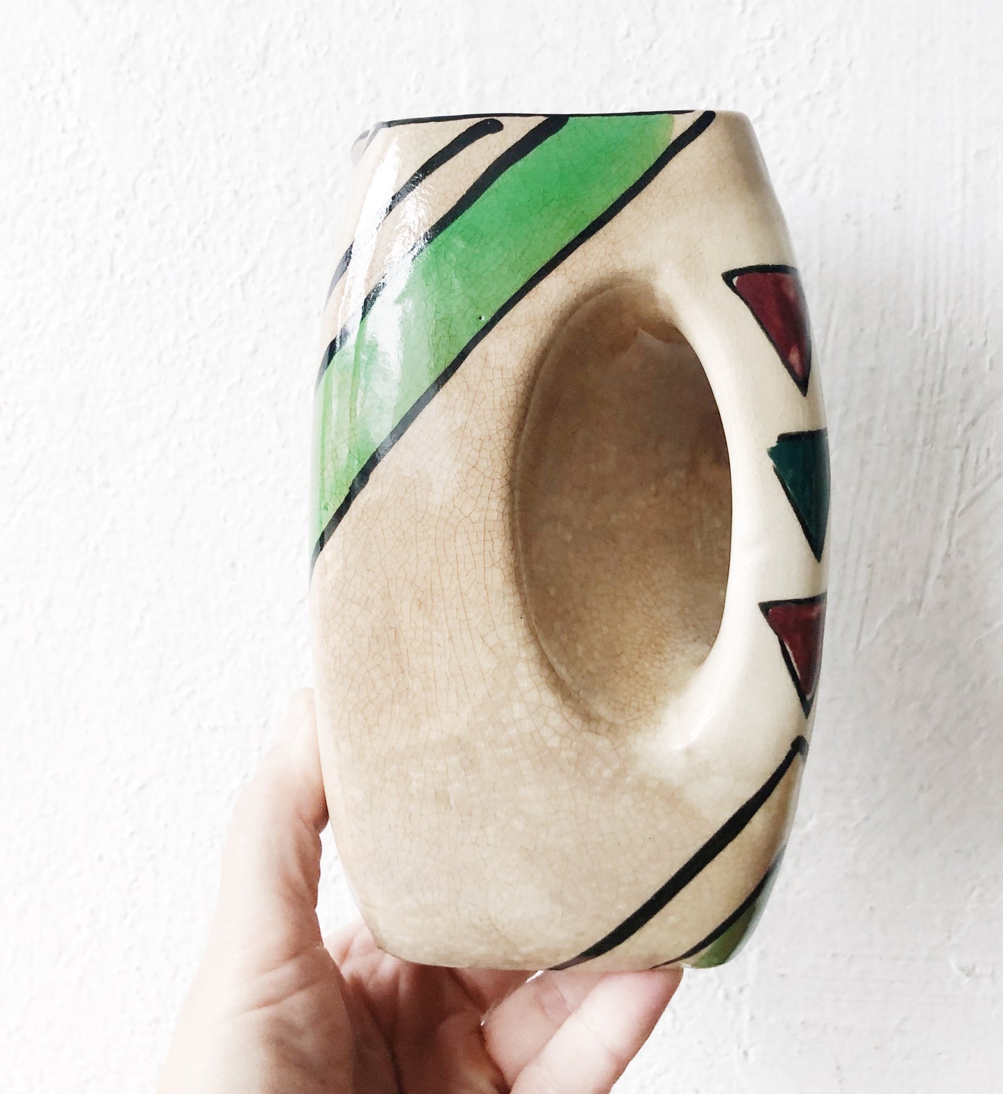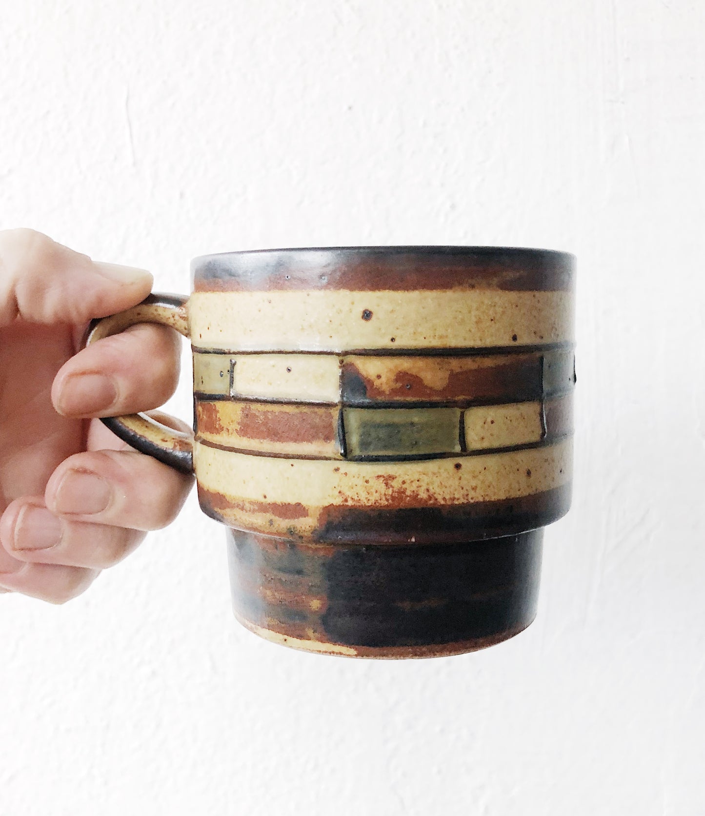 A larger size ceramic trivet with a fabulous pattern and coloring. Wood framed and heavy. You could hang this as art as well but it works particularly good for taking pots off the stove