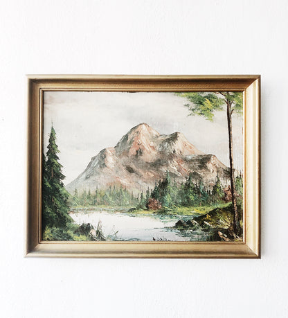 A beautiful old vintage oil painting of a mountain landscape. We like to call this one pink mountain. The choppy style and muted colors are right up our alley. Framed in a vintage gilt frame. Signed.