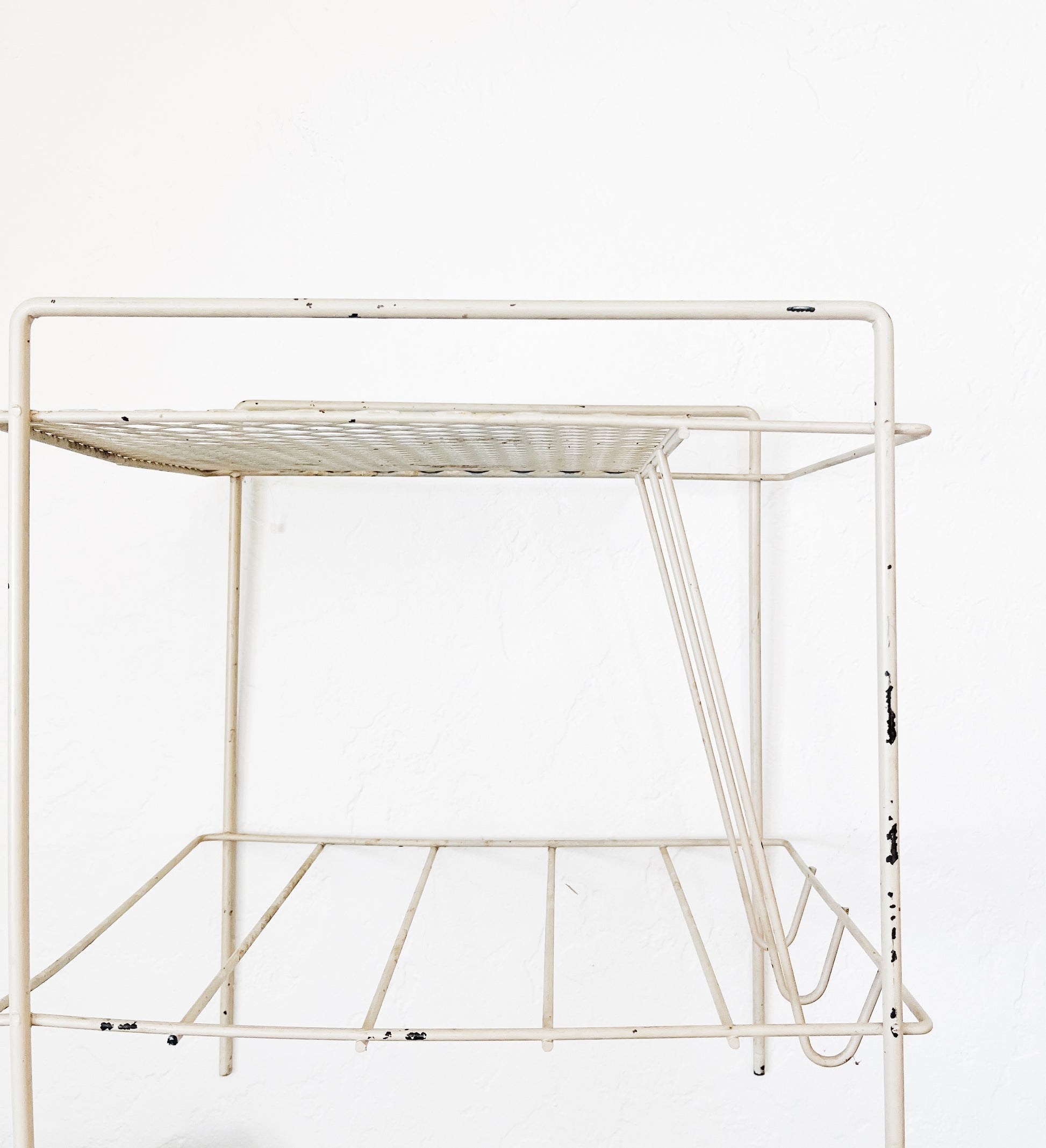 Vintage enameled book rack side table combo. Color is a putty/dirty white. Mesh top and divided shelf.