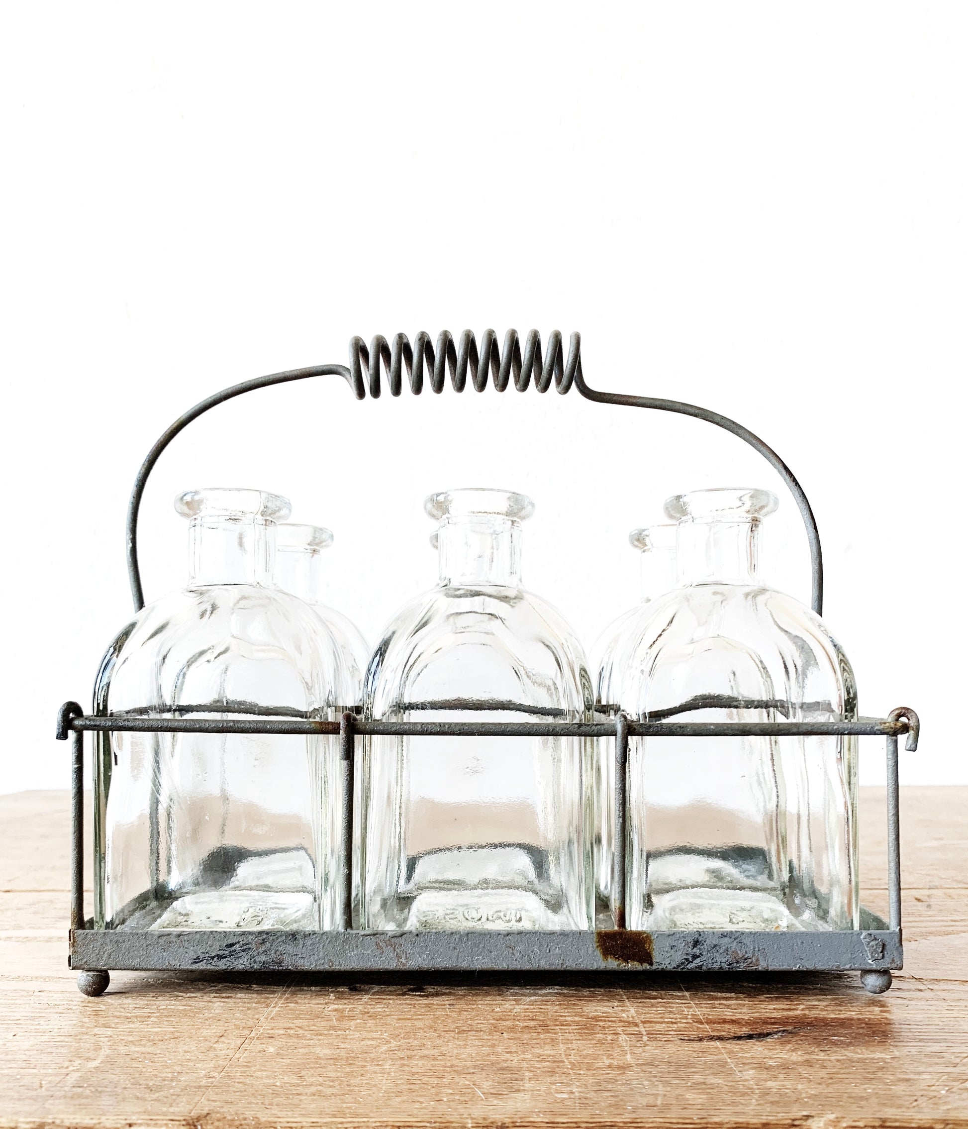 Fantastic chunky vintage glass bottles (6) in a vintage tin caddy. Bottles 250 ML