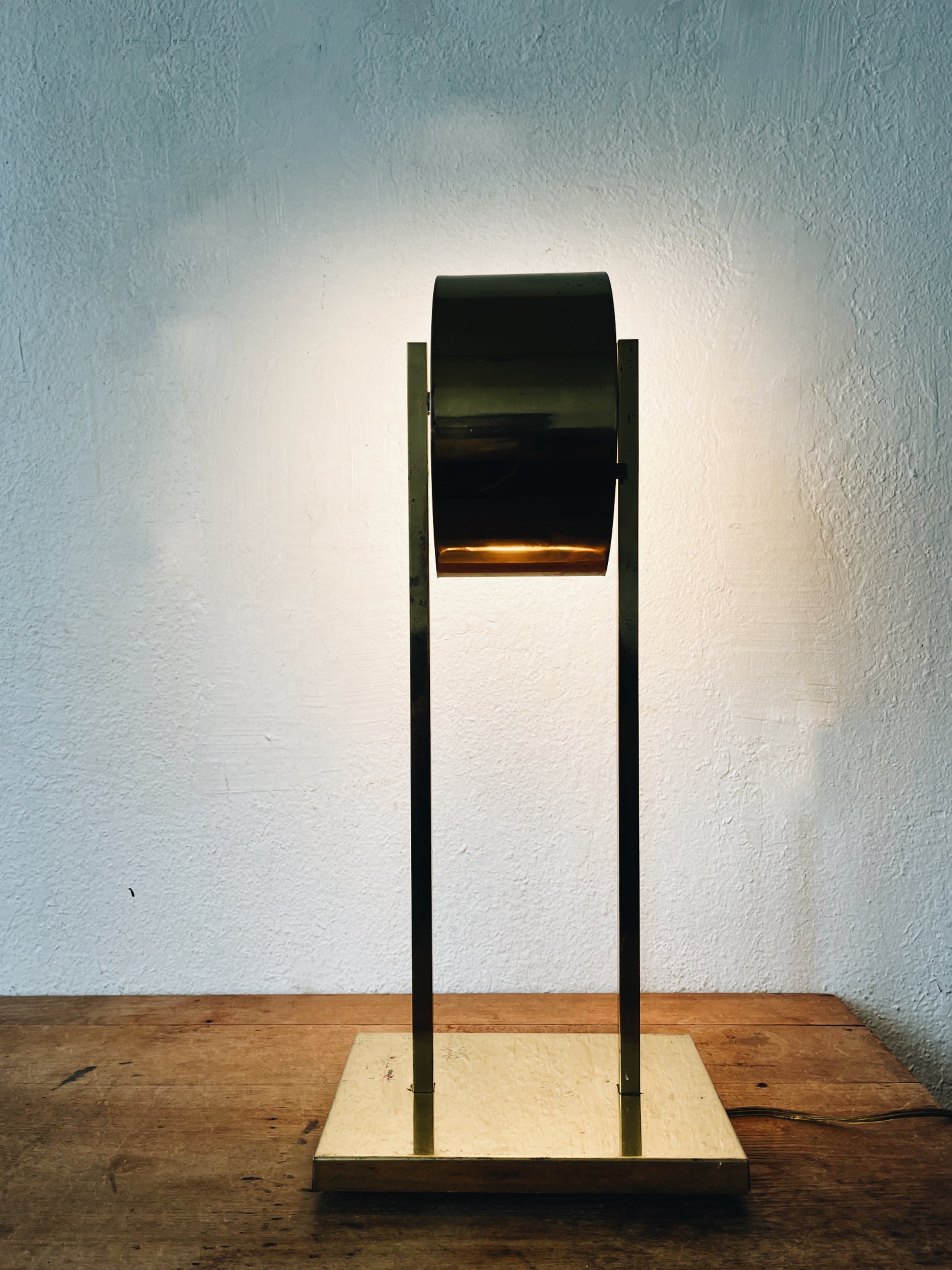 Post modern George Kovacs demilune brass lamp in the style of Robert Sonneman. Wowza. Shade rotates 180 degrees to direct light onto a surface or the wall. Integrated dimmer switch under the shade. Takes a standard bulb. Small areas of wear to the brass plating but otherwise looks like a gem.