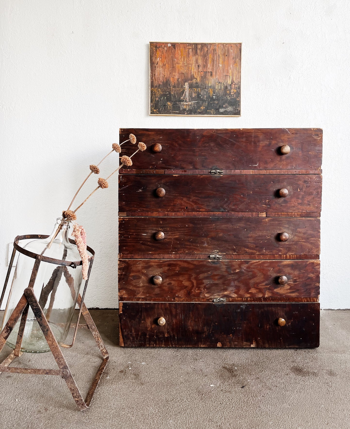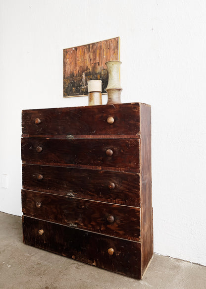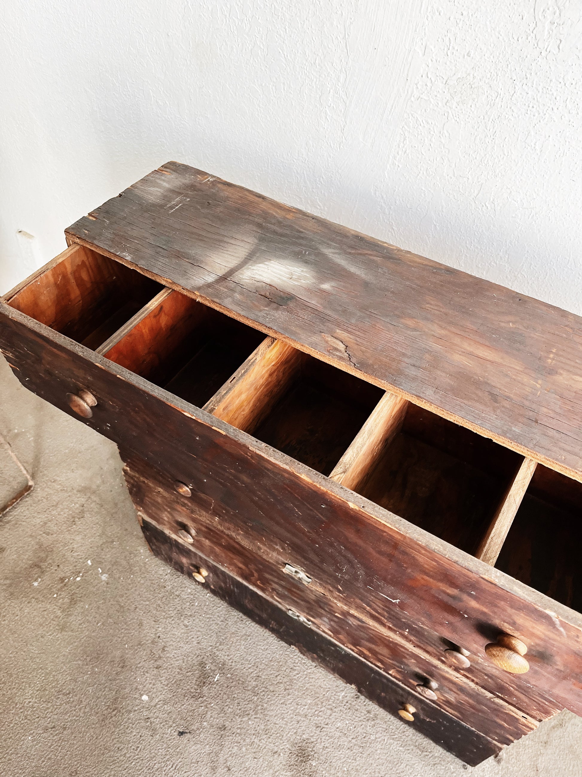 Antique wood machine chest of drawers, made by hand. Thinner than most. Could work stop a desk or table. Top drawer has divided sections, the rest are open. Rustic condition. Overall wear is evident. Still sturdy and drawers slide easily