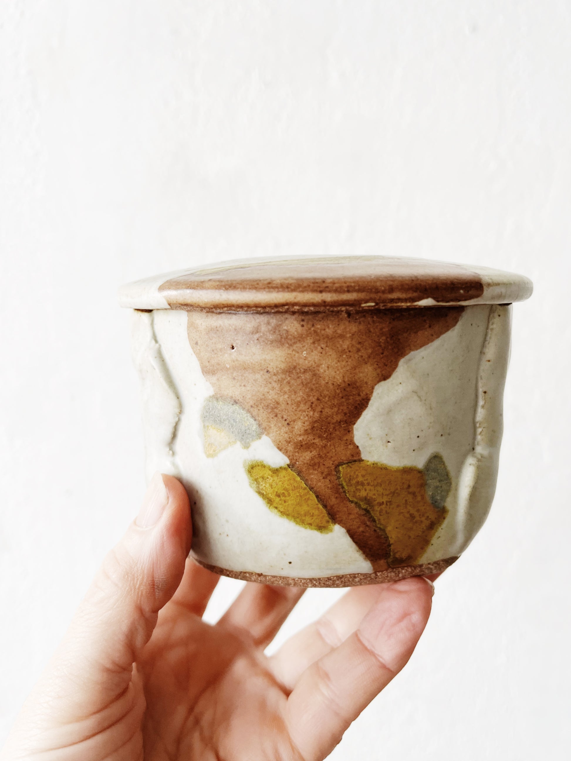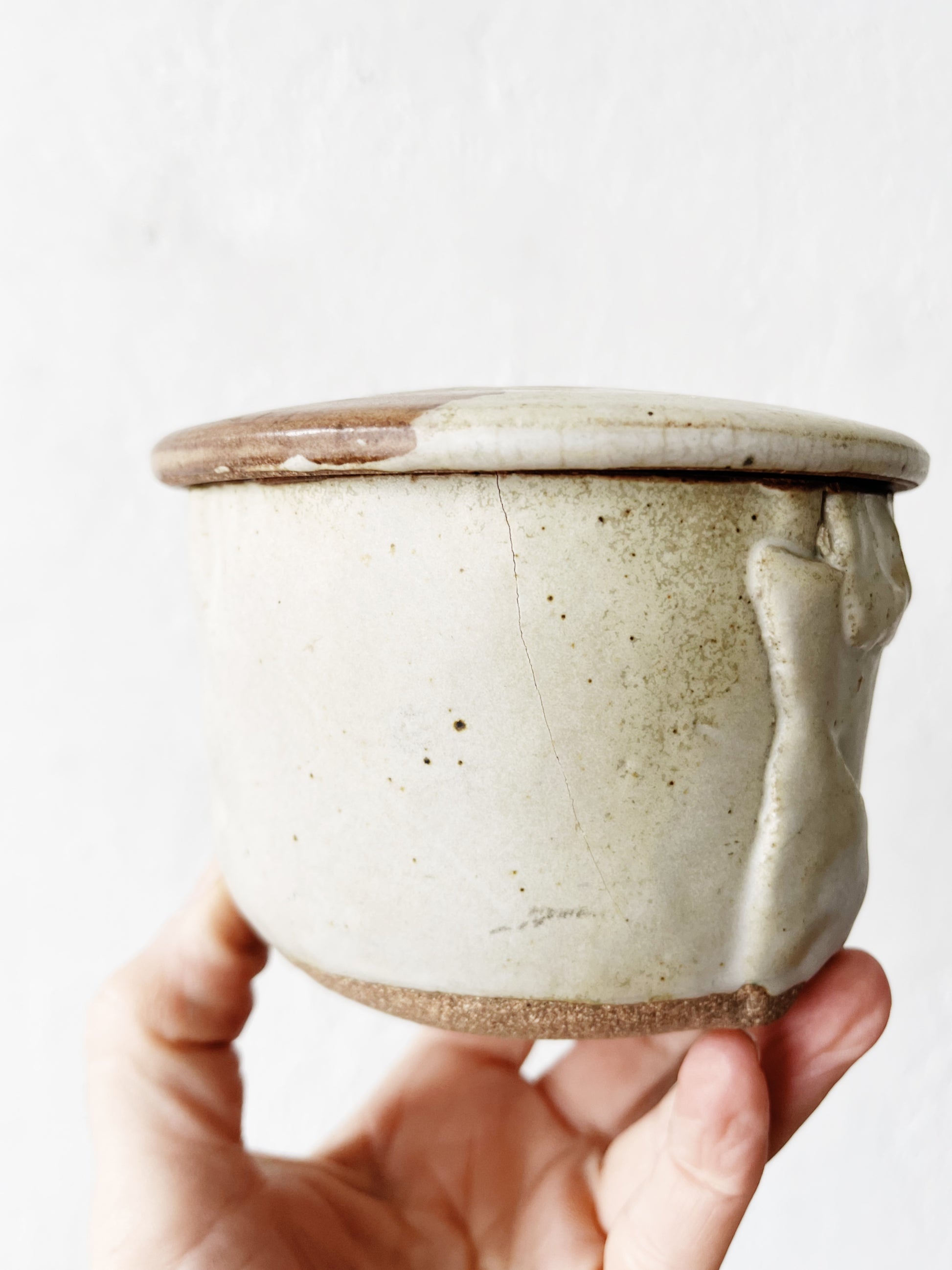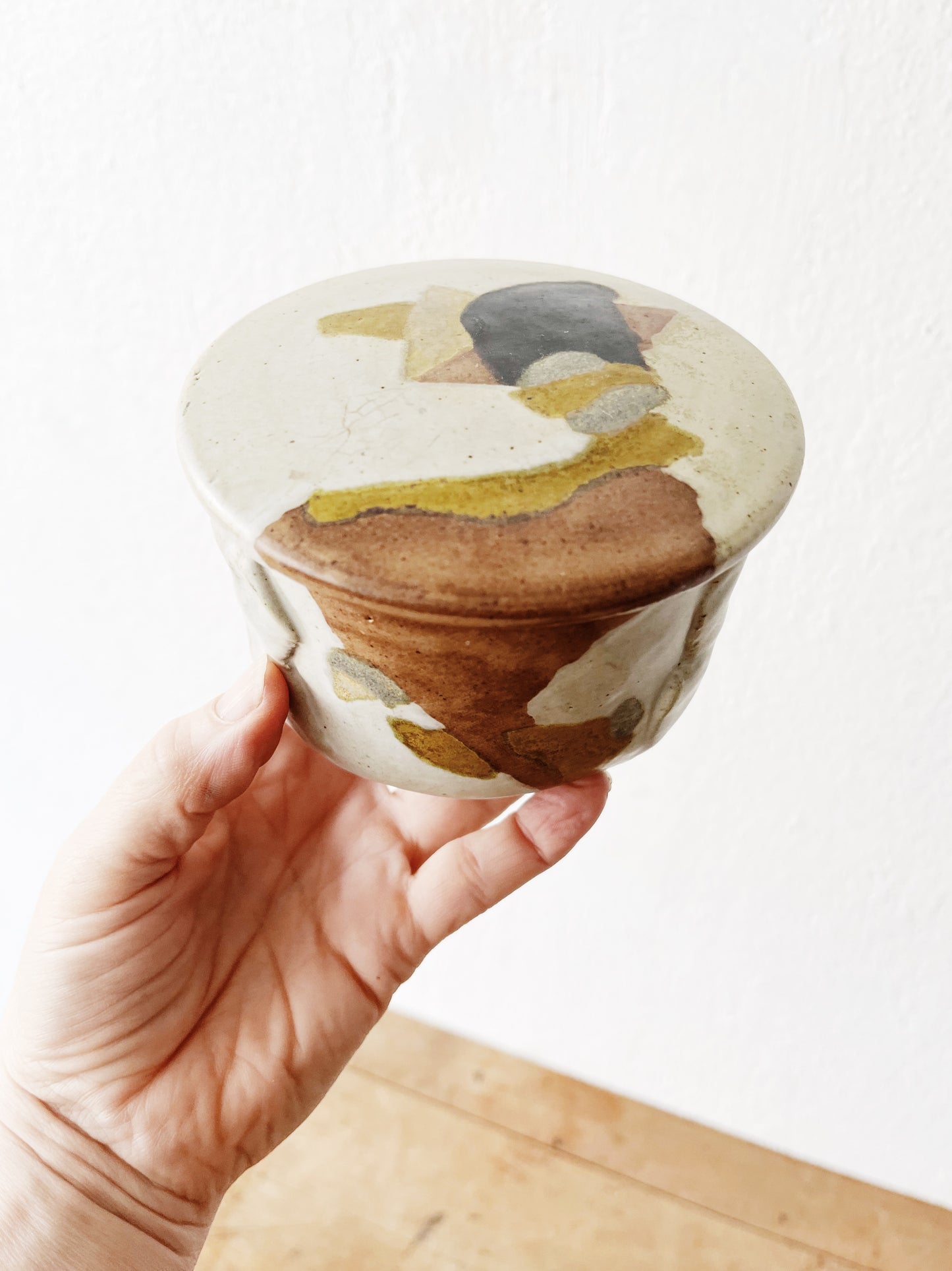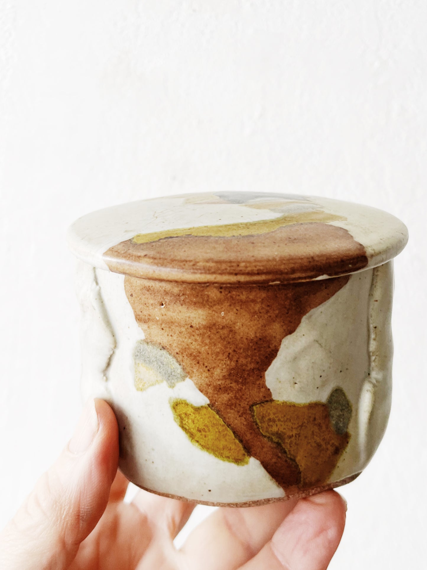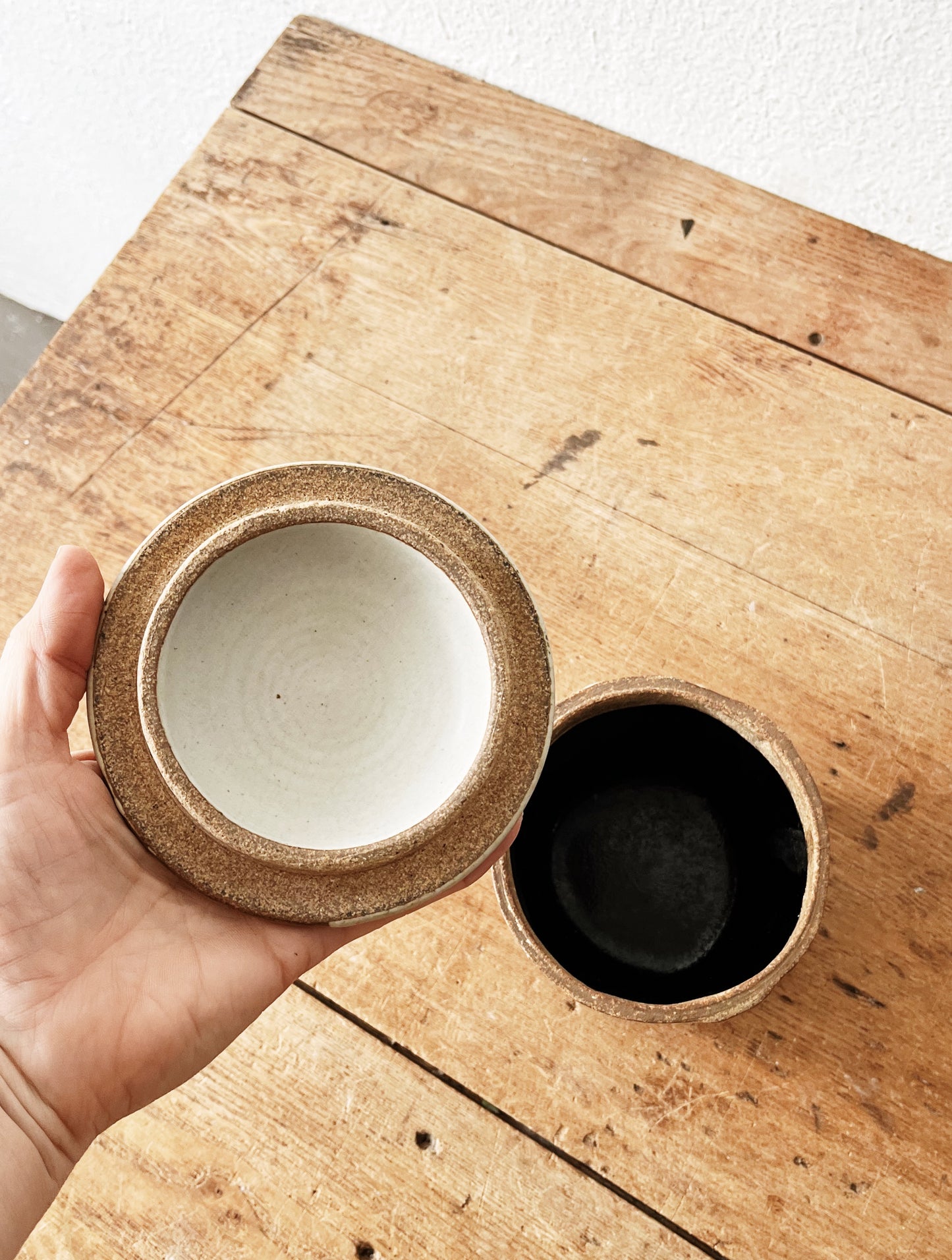 Beautiful modernist pottery container by Oregon artists, Charles Rothschild & Gloria Nepstead aka Bar Lo pottery. Marked. Has a repaired hairline crack that doesn’t seem to be breached. Storing solids should be just fine.