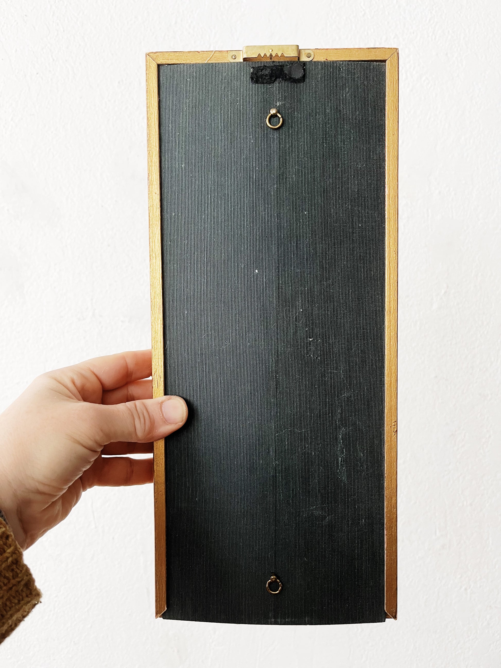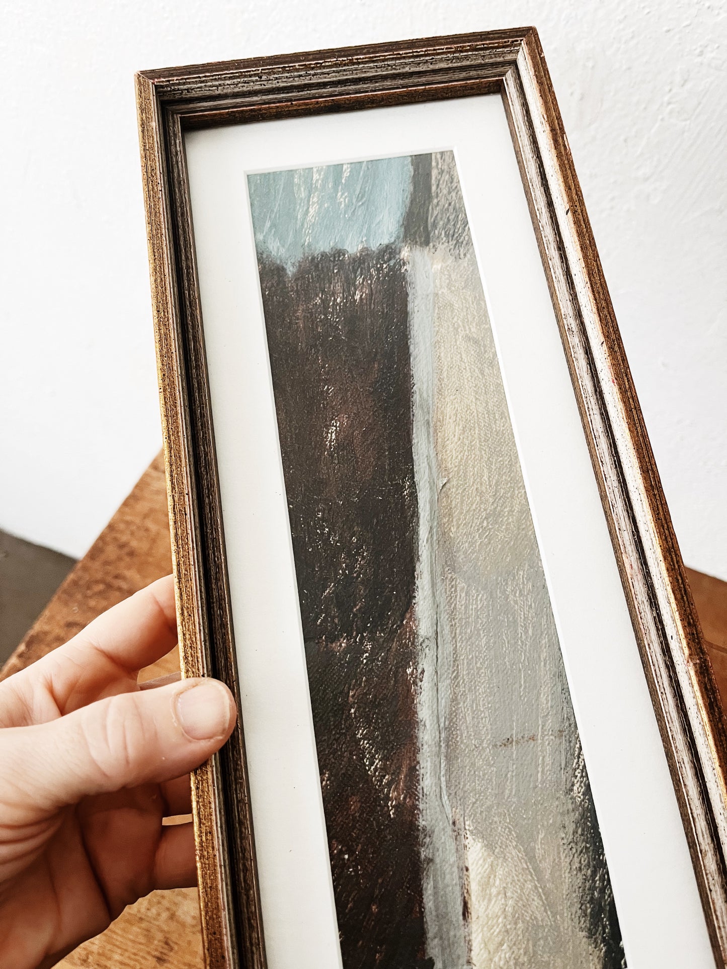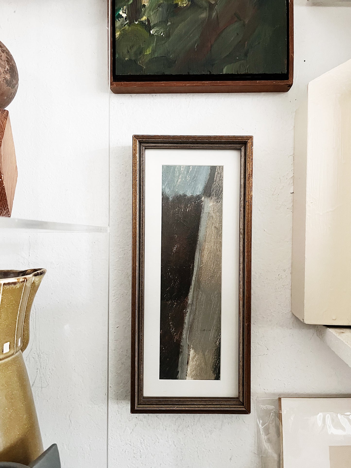 Smaller sized abstract oil on board. Framed in vintage wood under non glare glass. The blues and greys are calming while the geometric movement creates some intensity. Nice for a narrow wall
