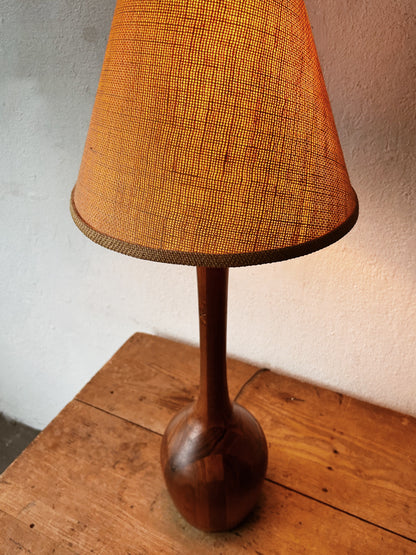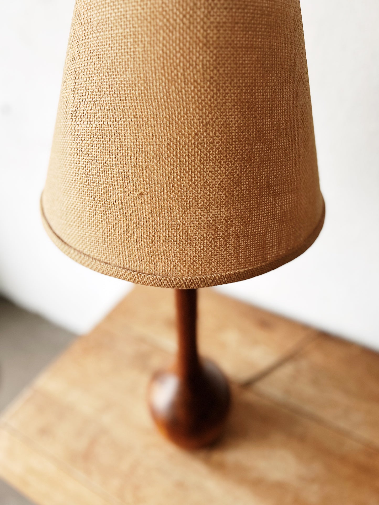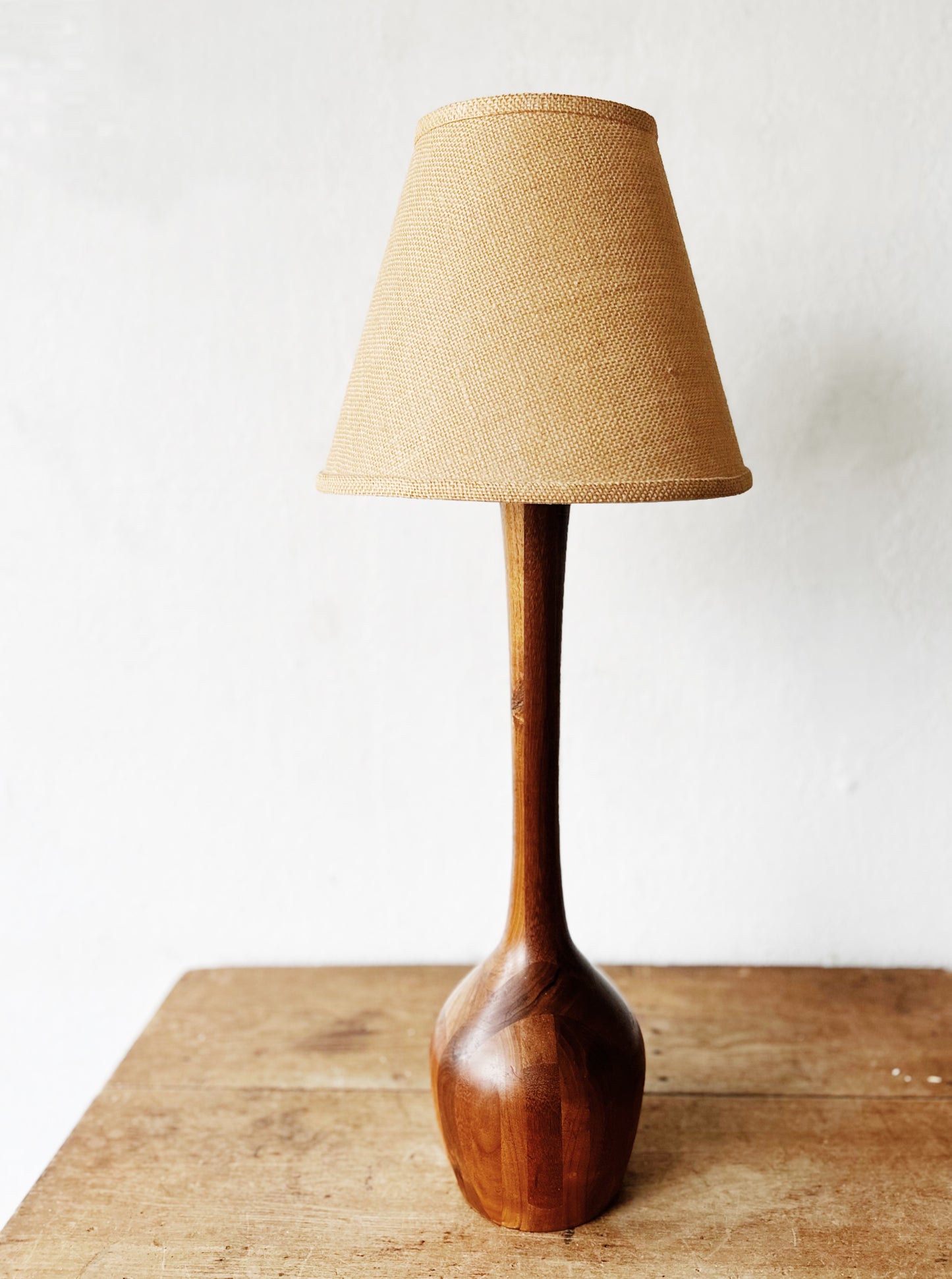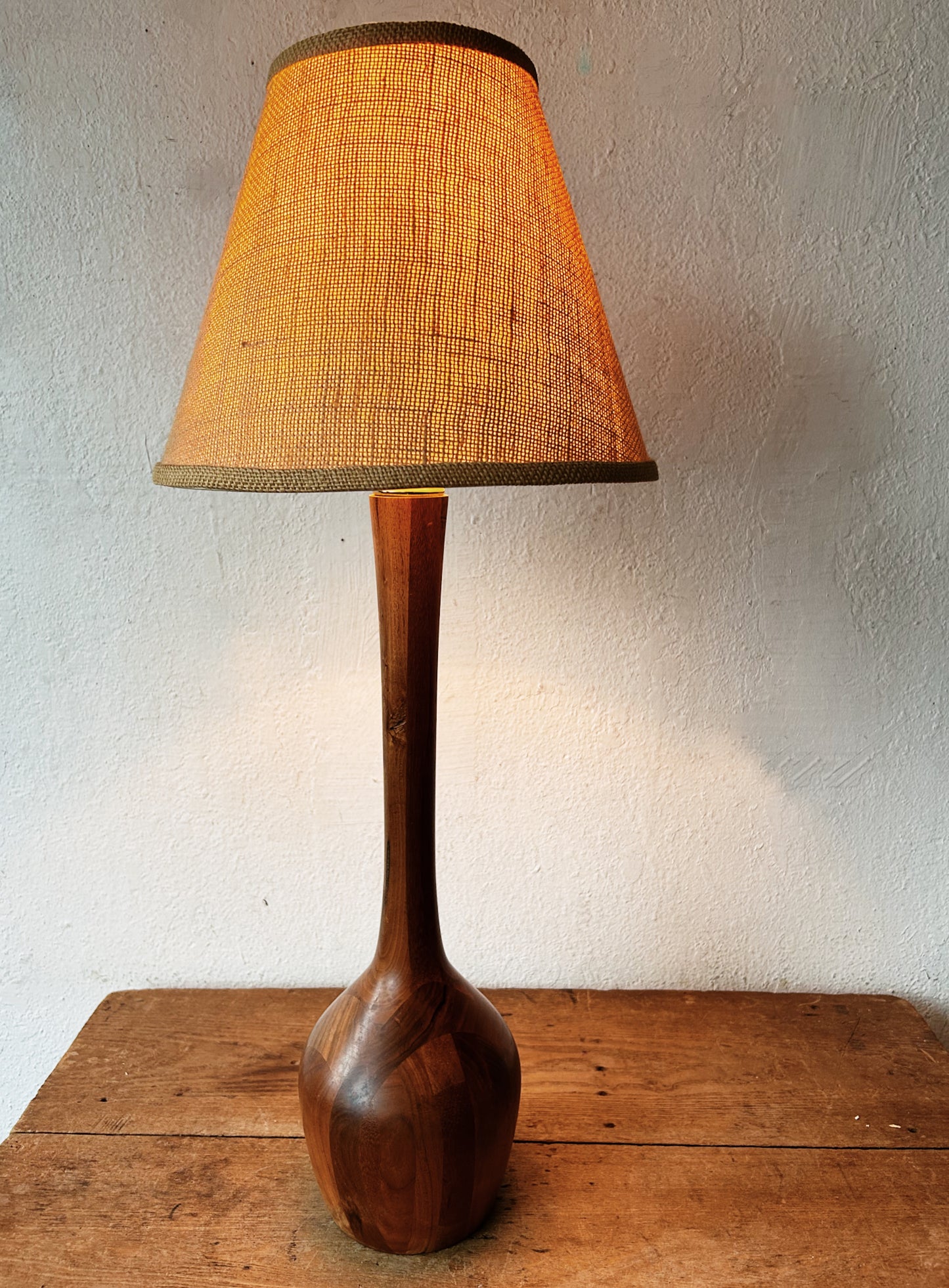 Stunning inlaid wood lamp in the Danish style. Handmade! Tall slender body. Makers initials are woodburned. Three way switch. Comes with the burlap shade though we think something pleated would look lovely too