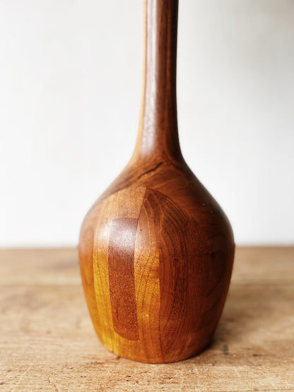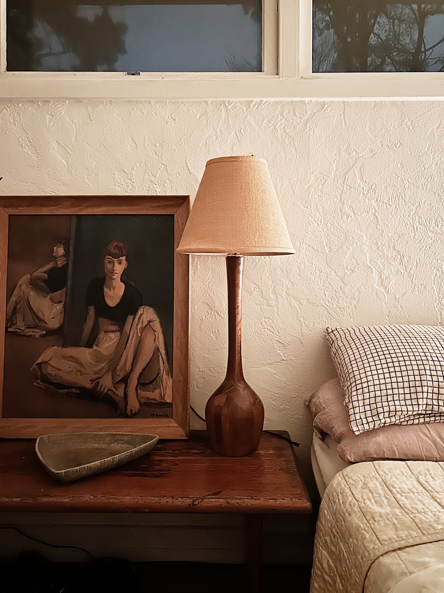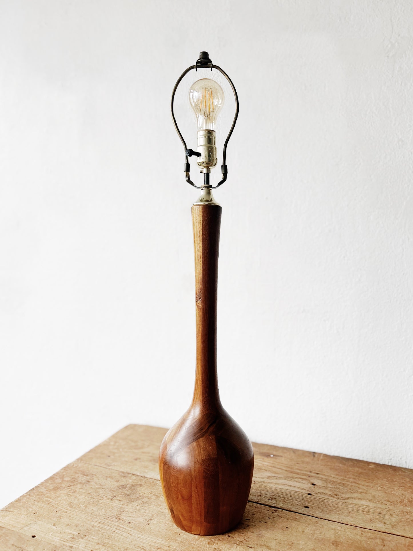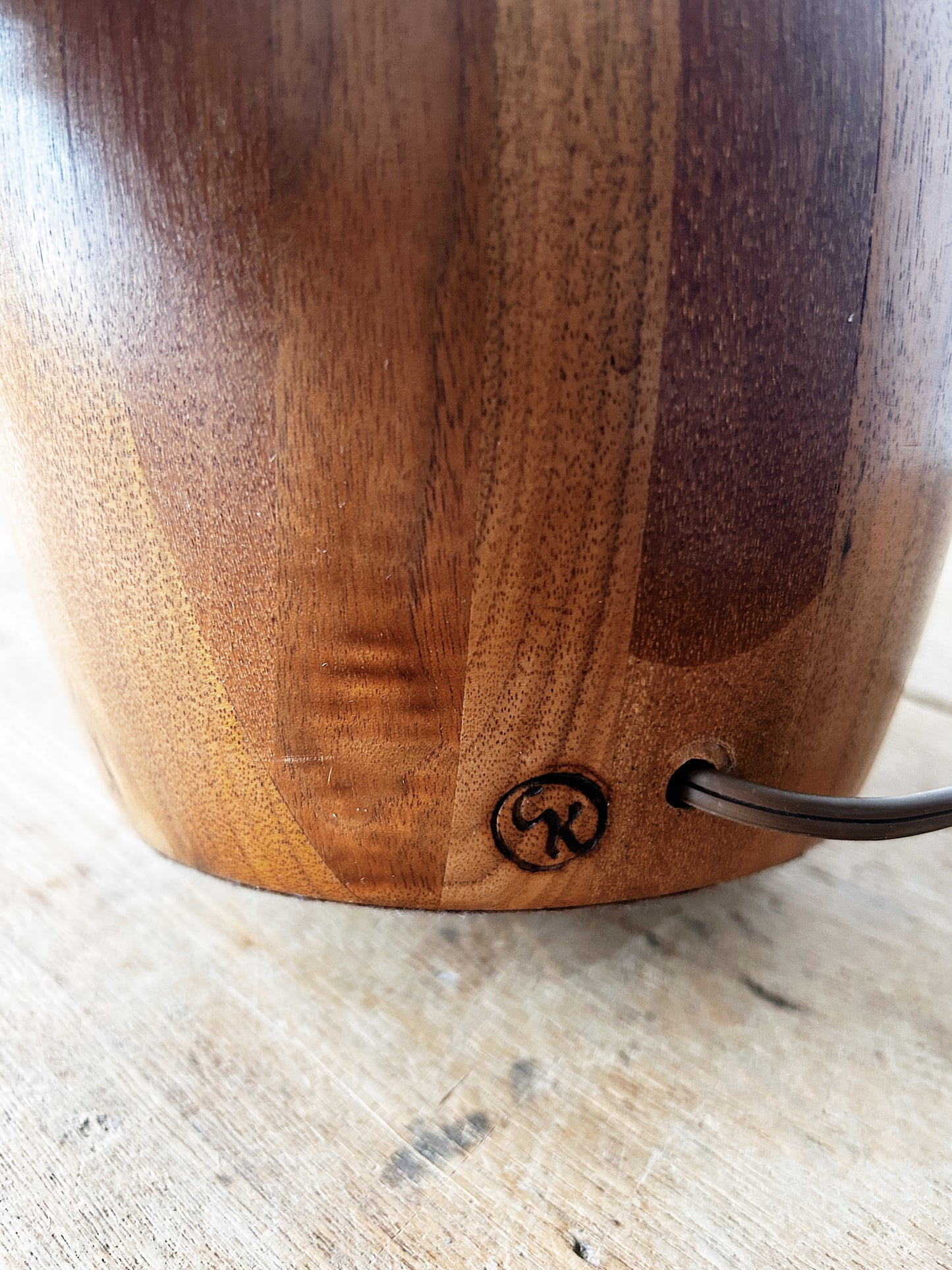 Stunning inlaid wood lamp in the Danish style. Handmade! Tall slender body. Makers initials are woodburned. Three way switch. Comes with the burlap shade though we think something pleated would look lovely too