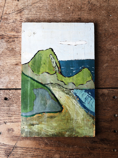 Really fantastically done! A primitive folk look to this oil on board of a Landscape near the water. Comes with the wood easel