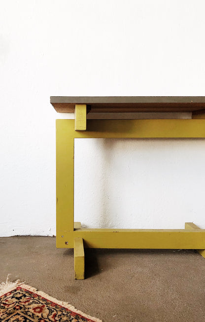 Great colors on this painted side table. Vintage 1970s. Base is wood and top is painted laminate. Plants look pretty on the chartreuse and olive. Great for a tv or record player!
