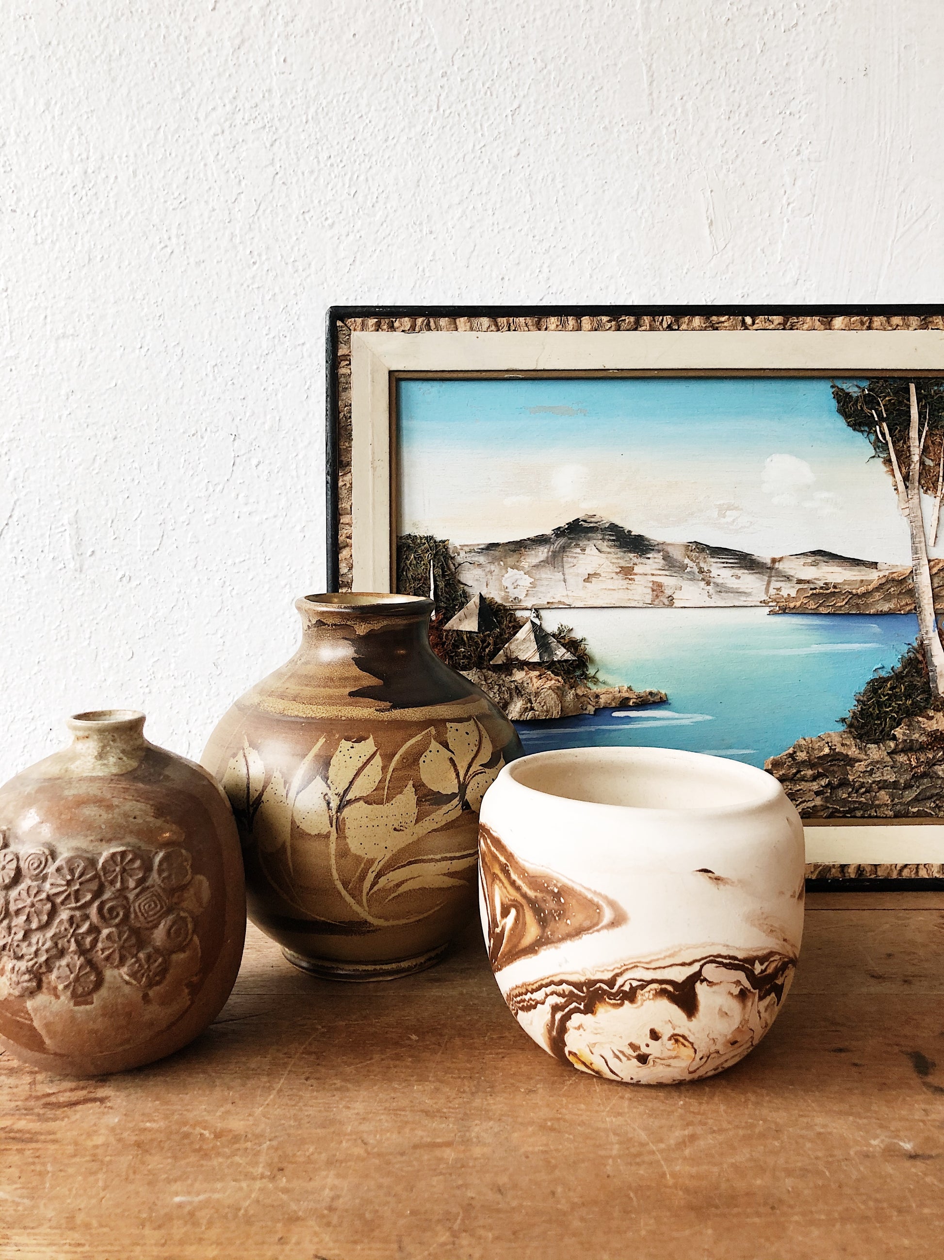 A lovely matte glazed weed pot or vase with beautiful coloring. You can display with the floral motif forward or the drip side front for a change