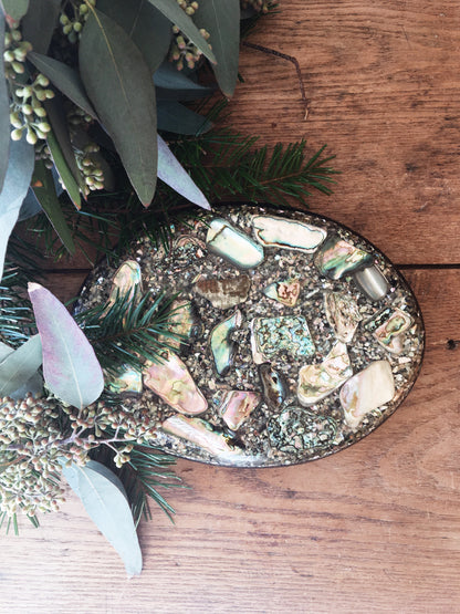 Vintage footed abalone and resin trivet. In nice shape, no chips. 6x8”