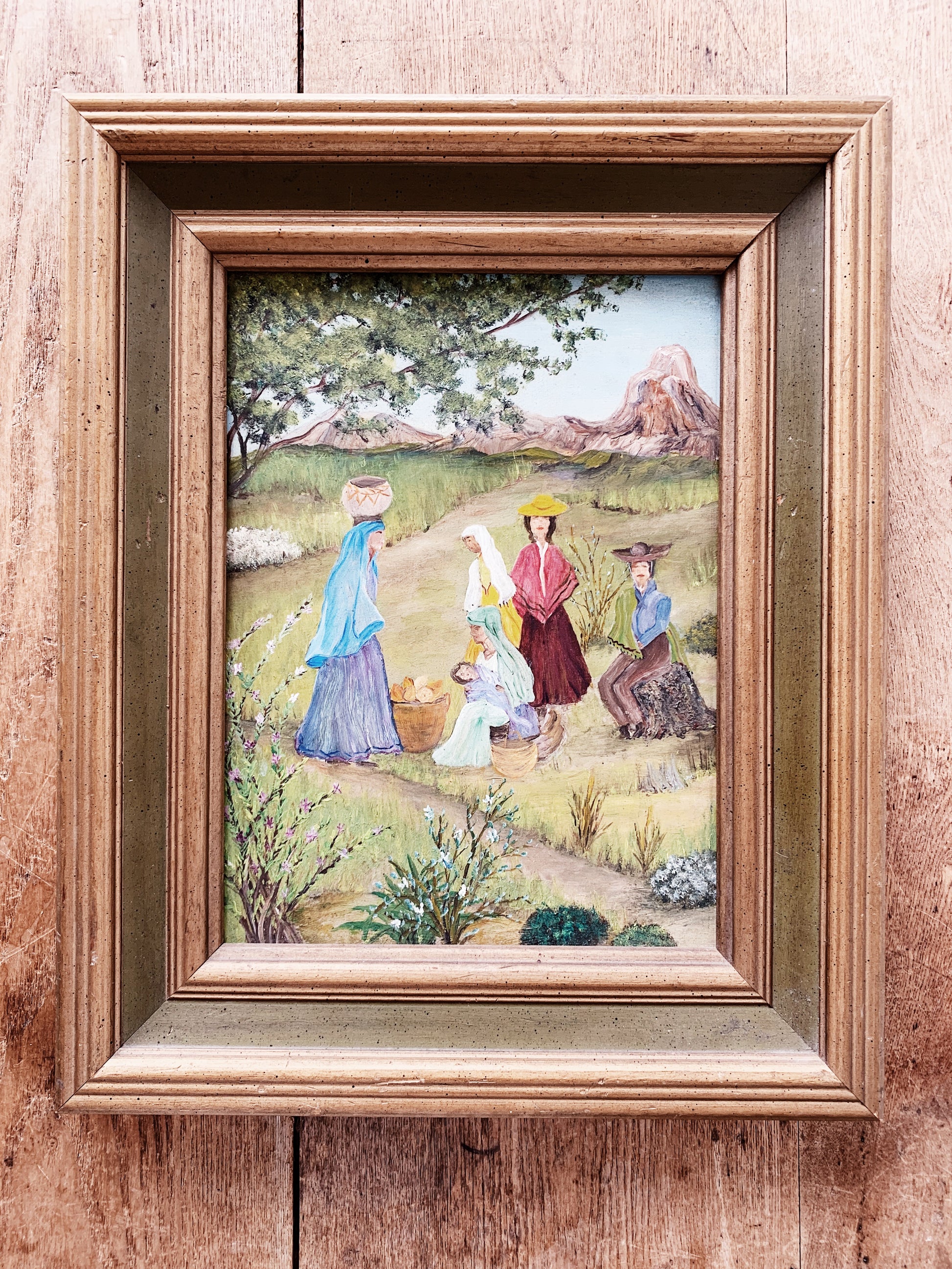 Wonderful vintage painting of women gathered outdoors. It’s an interesting one! Framed in vintage wood with wire hanger.