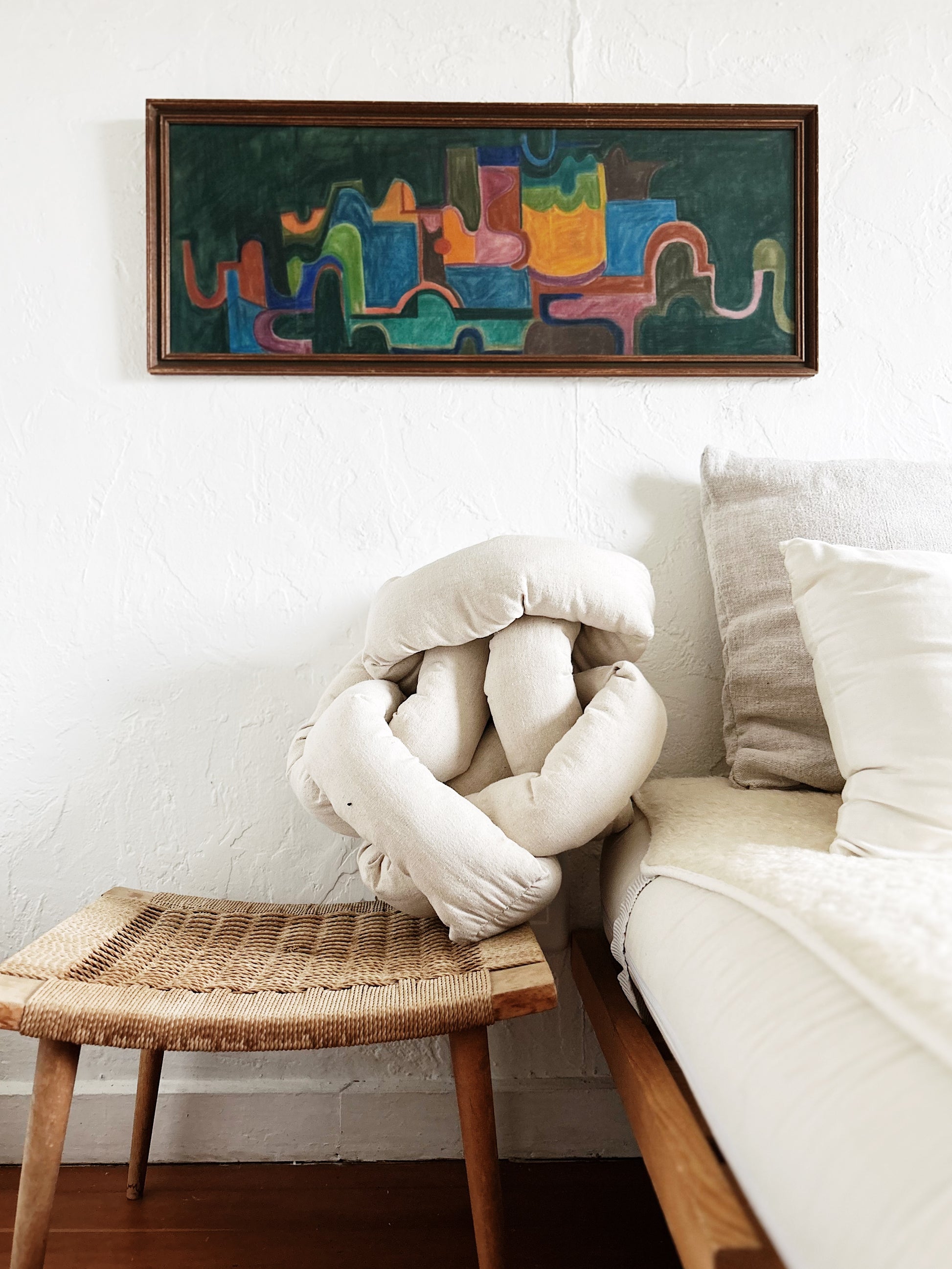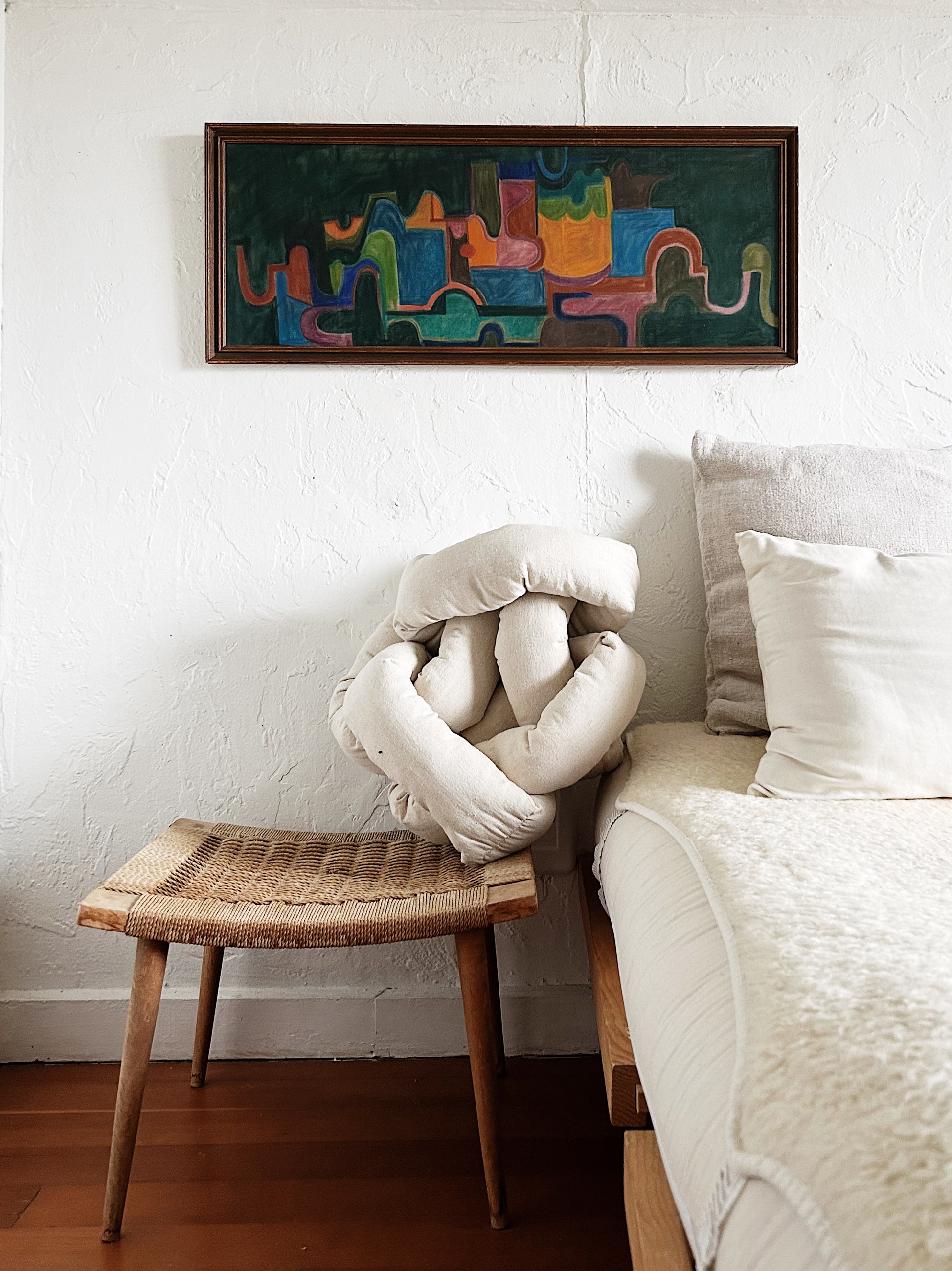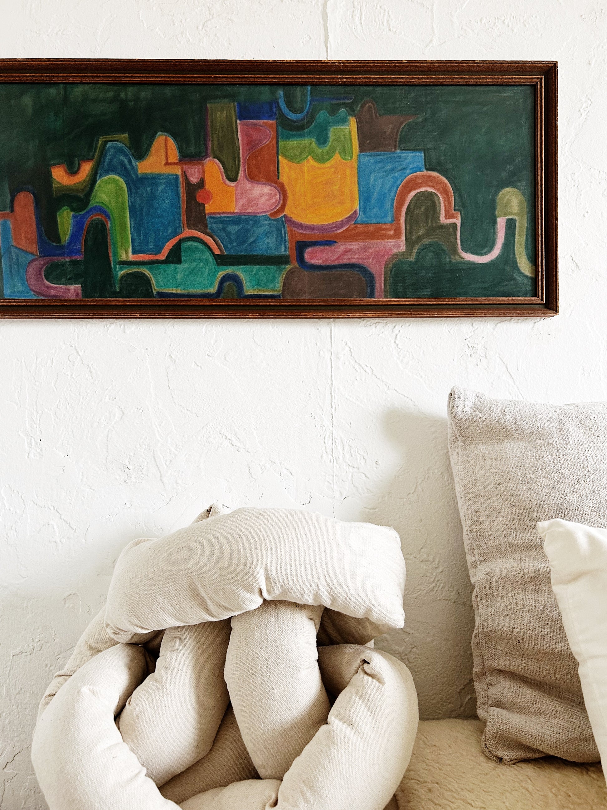 Vintage painting in the style of Klee. An abstract, colorful cityscape. The texture has an almost fuzzy look, maybe gesso? or painted fabric? Framed vintage wood under non-glare glass. A great oblong shape.
