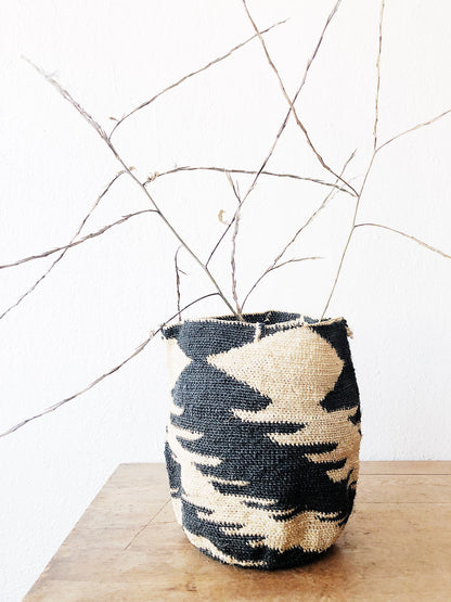 A lovely way to cover up a plain terra-cotta pot. This finely woven basket with deep indigo and natural colors is a quick fix.