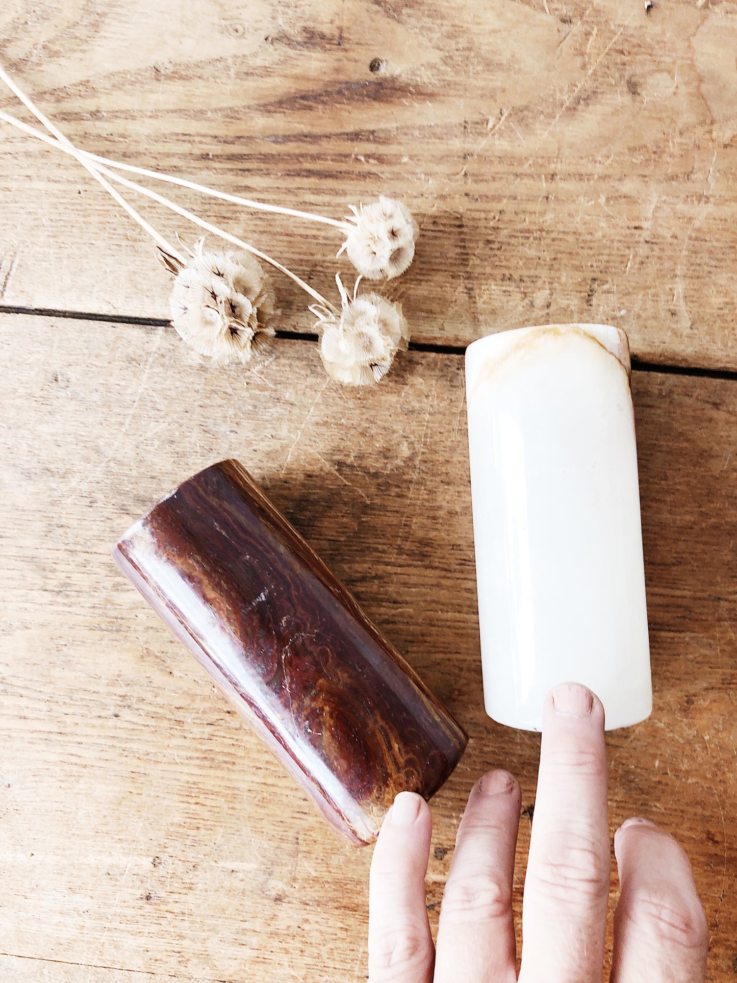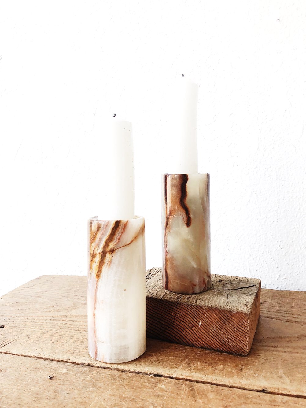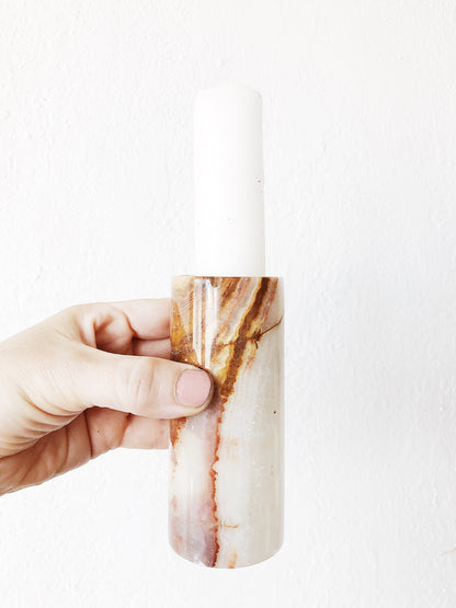 Beautiful agate pillars, polished and translucent. Holds thick pillars or tea lights. Also great for cone incense.