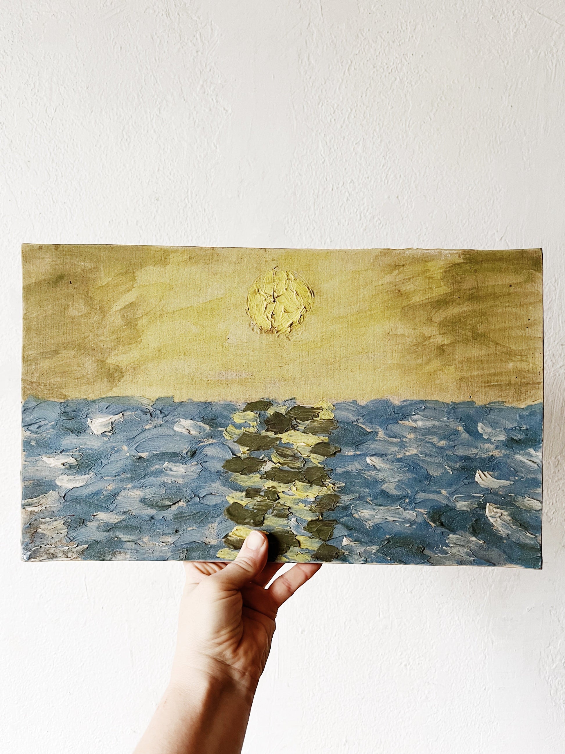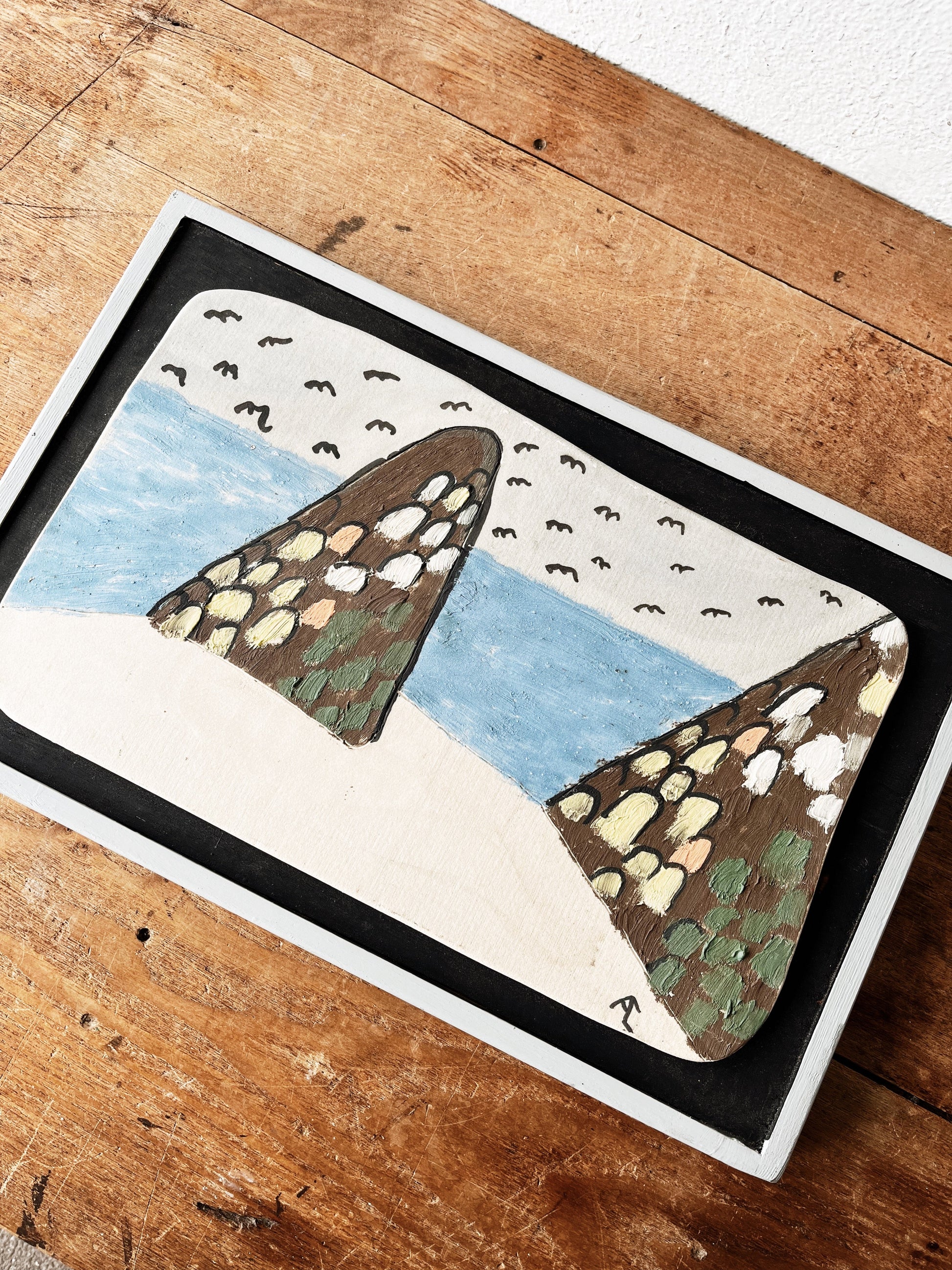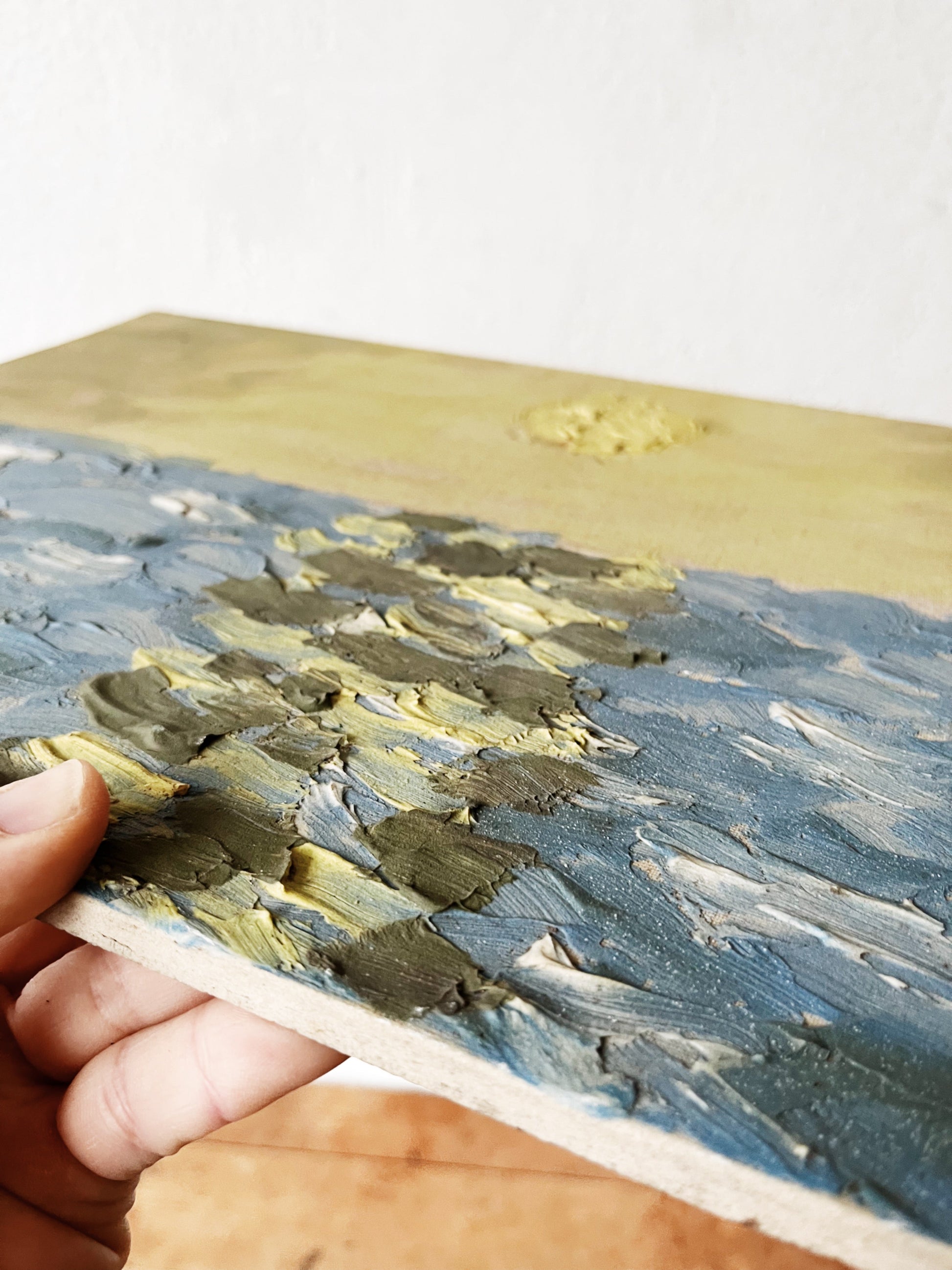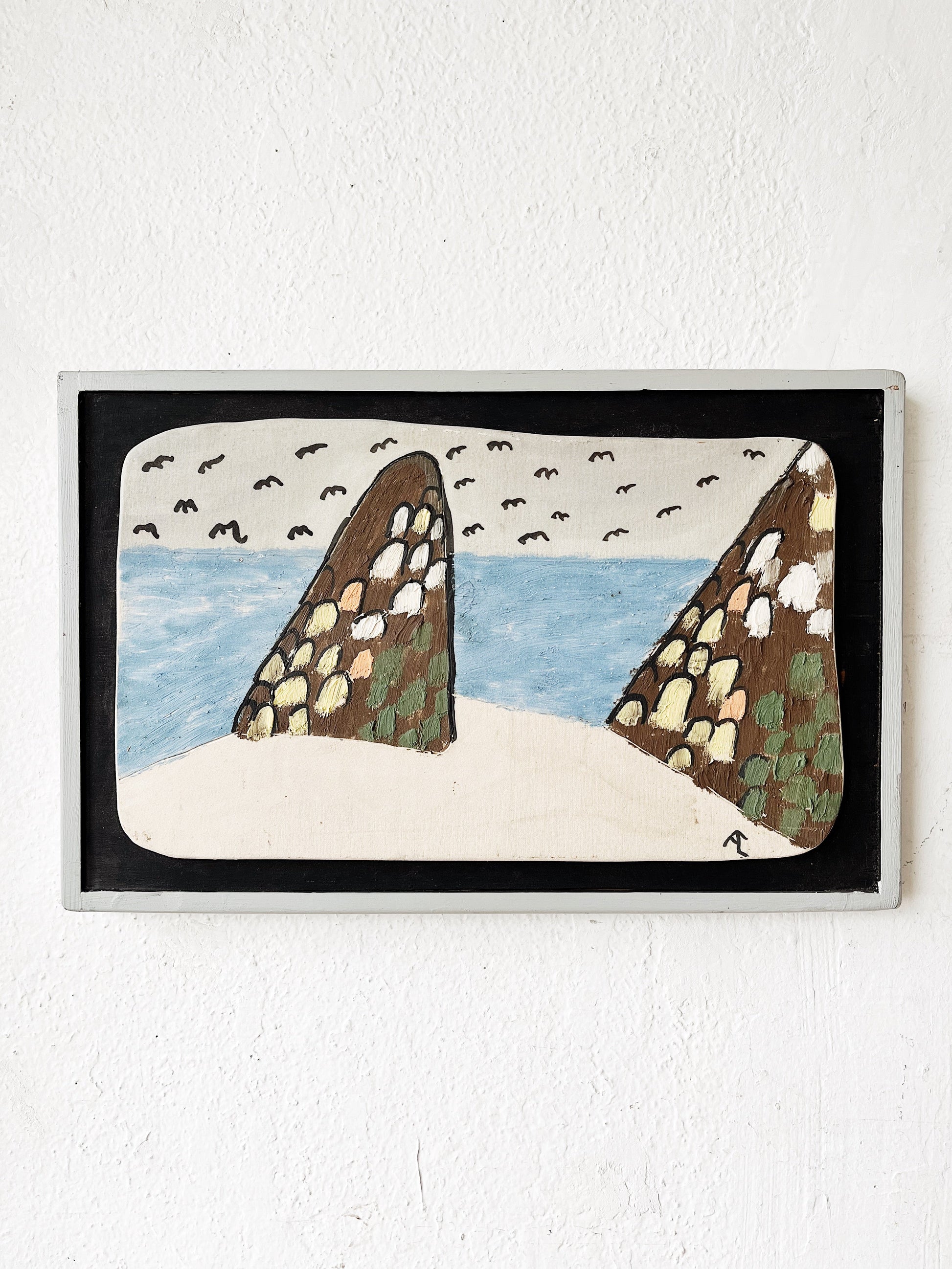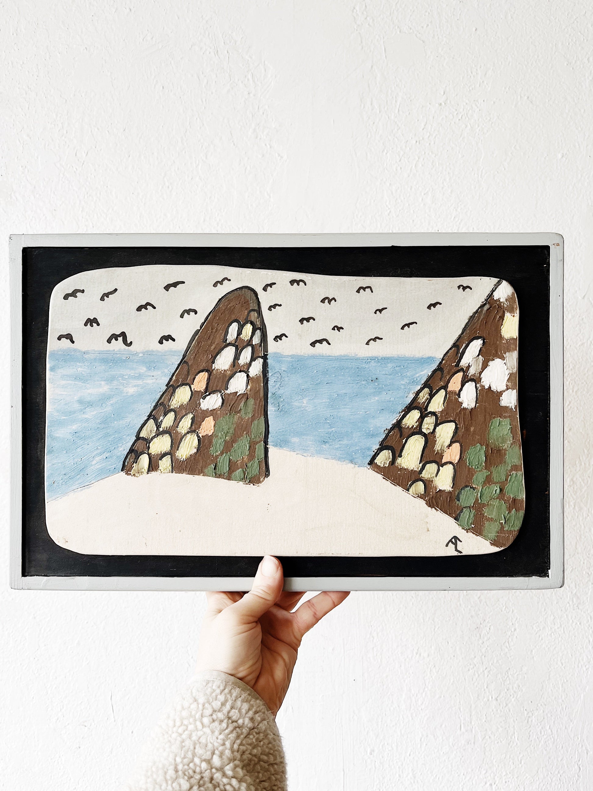 Two wonderful landscape paintings by Portland artist Allen Cook c 1960s. On a thin slab of ceramic. Soft colors and great textures. A really unique riff on a more traditional form of landscape art.