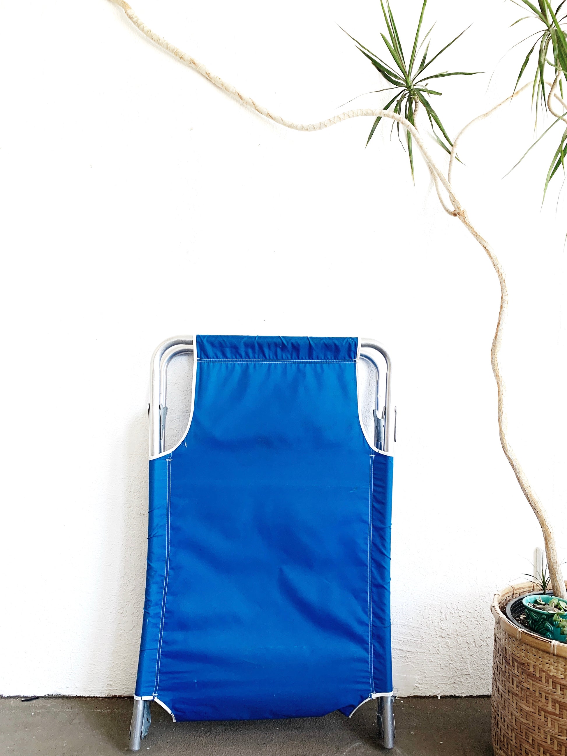 Great old cot that sits extra low to the ground. Folds up for storage. Nice royal blue canvas in great shape.