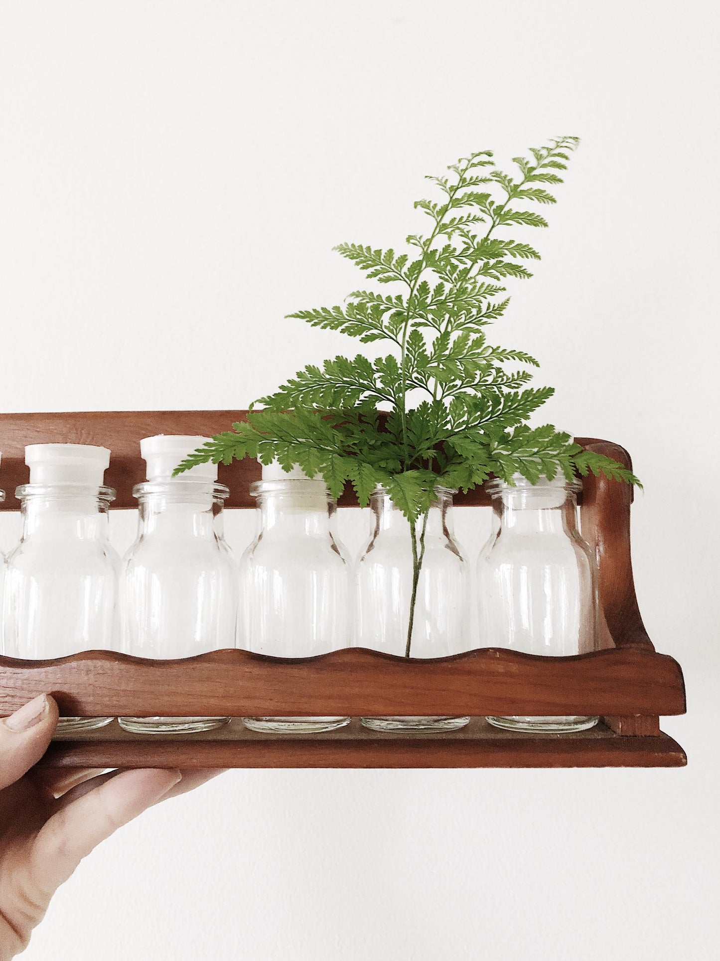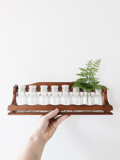 A vintage wood shelf with old glass bottles for spices, tinctures, herbal supplements. Nice to find one with the bottles intact!
